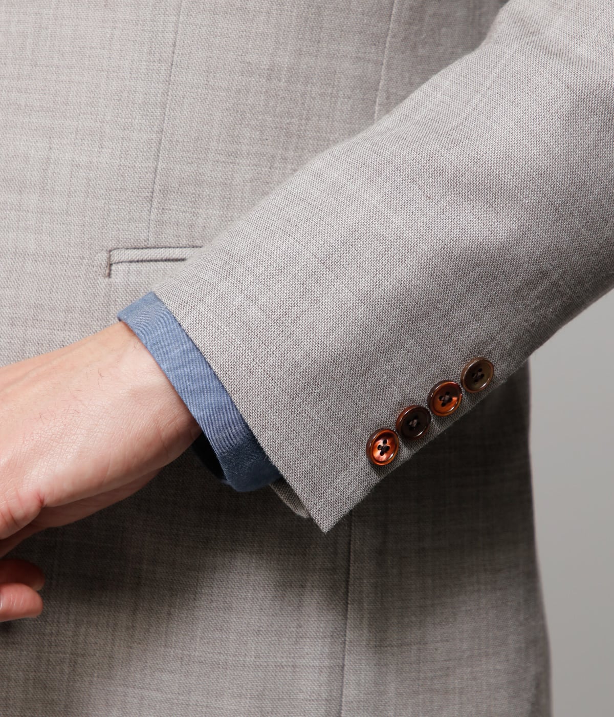 ウールをベースに、春夏らしい麻素材と安定性のあるポリエステルを加えた素材。凹凸の中に見える麻特有のフシが涼しげな印象を与えます。