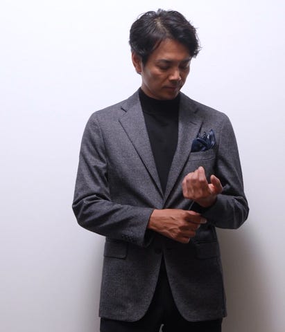 毛とポリエステルを使用したジャージー素材を使用。ジャージー素材ならではのストレッチ性が魅力です。しっかりとした肉感があり、秋口から冬まで着用可能です。