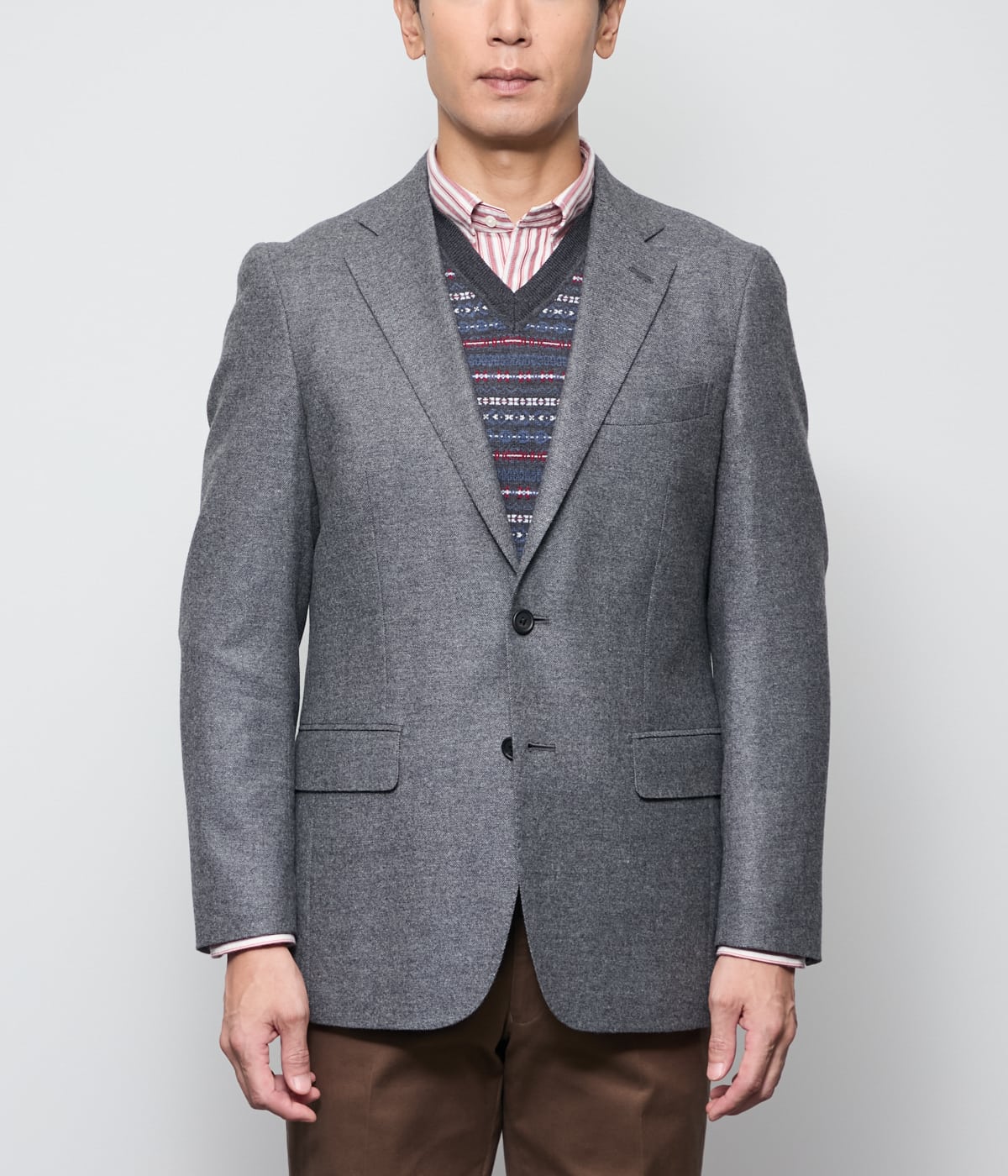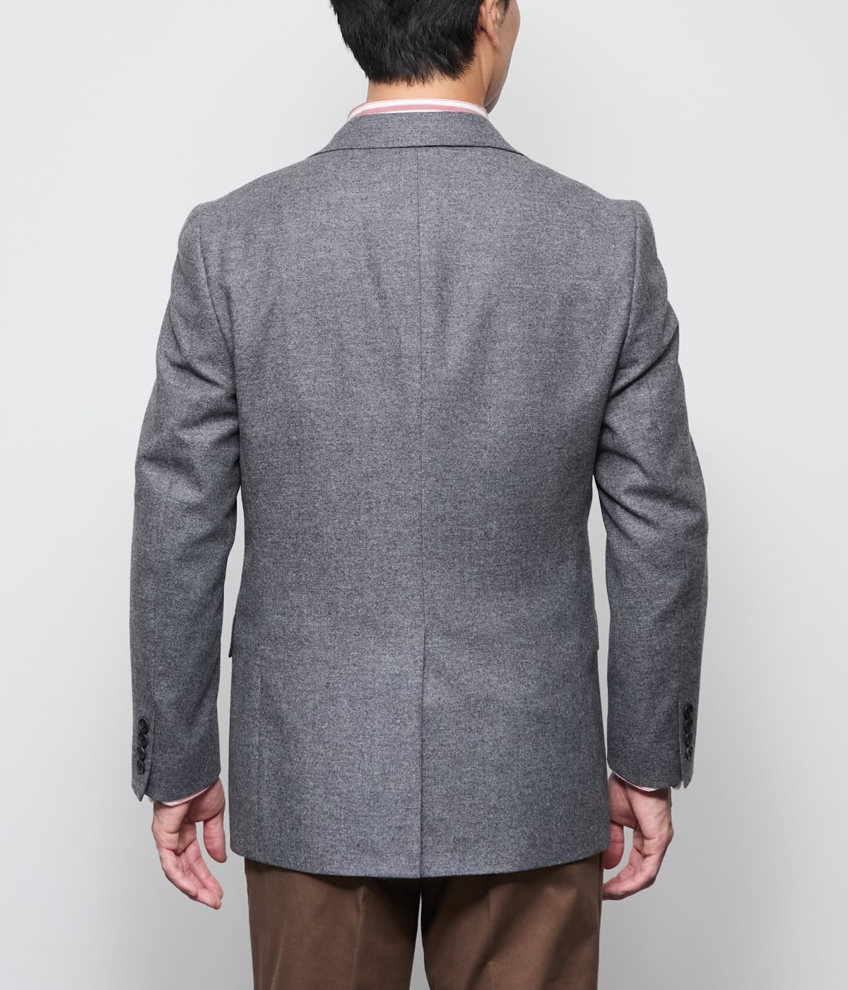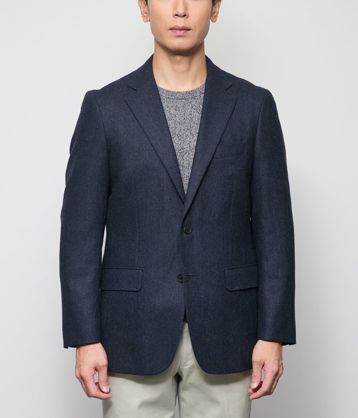 Super120'sウールと滑らかな風合いのカシミヤを混紡した、上品な起毛ツイル素材を使用。柔らかなタッチ感と高級感を兼ね備えた生地です。今年は梳毛と組み合わせることで程良い肉感になり、すっきとした見た目になっております。
