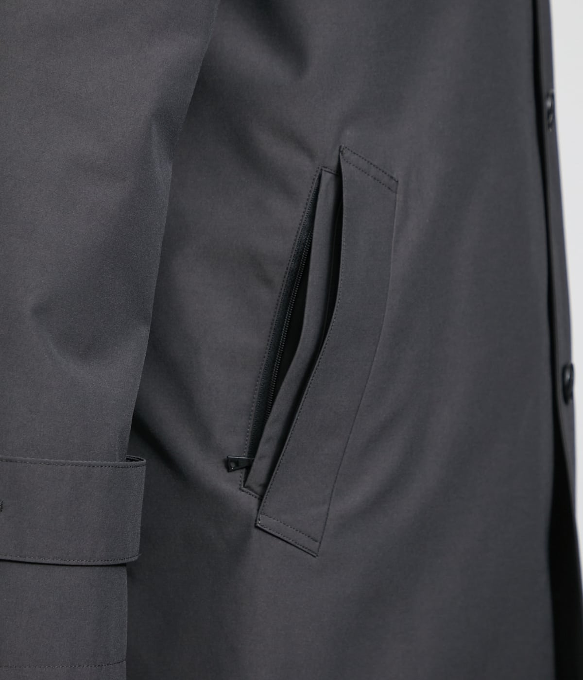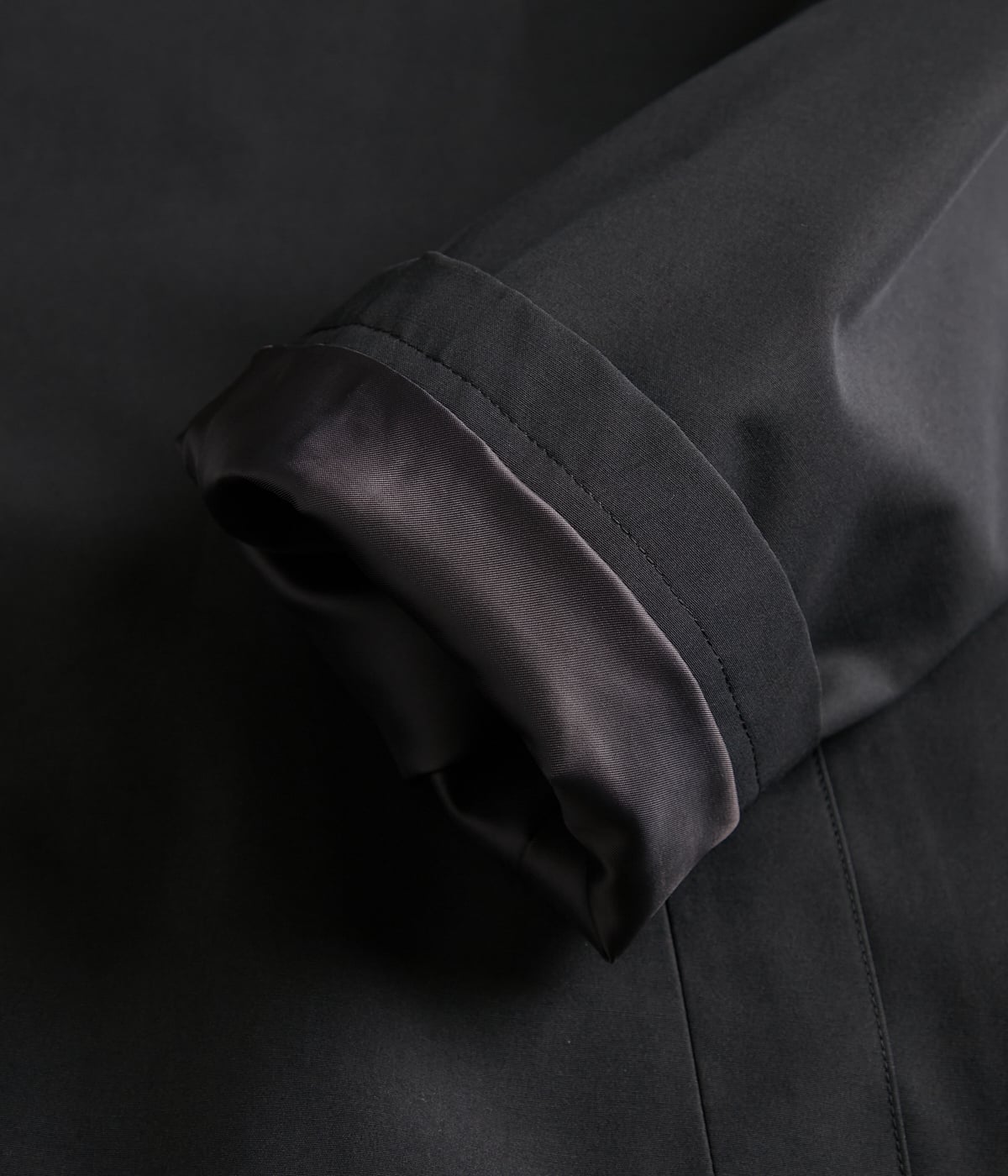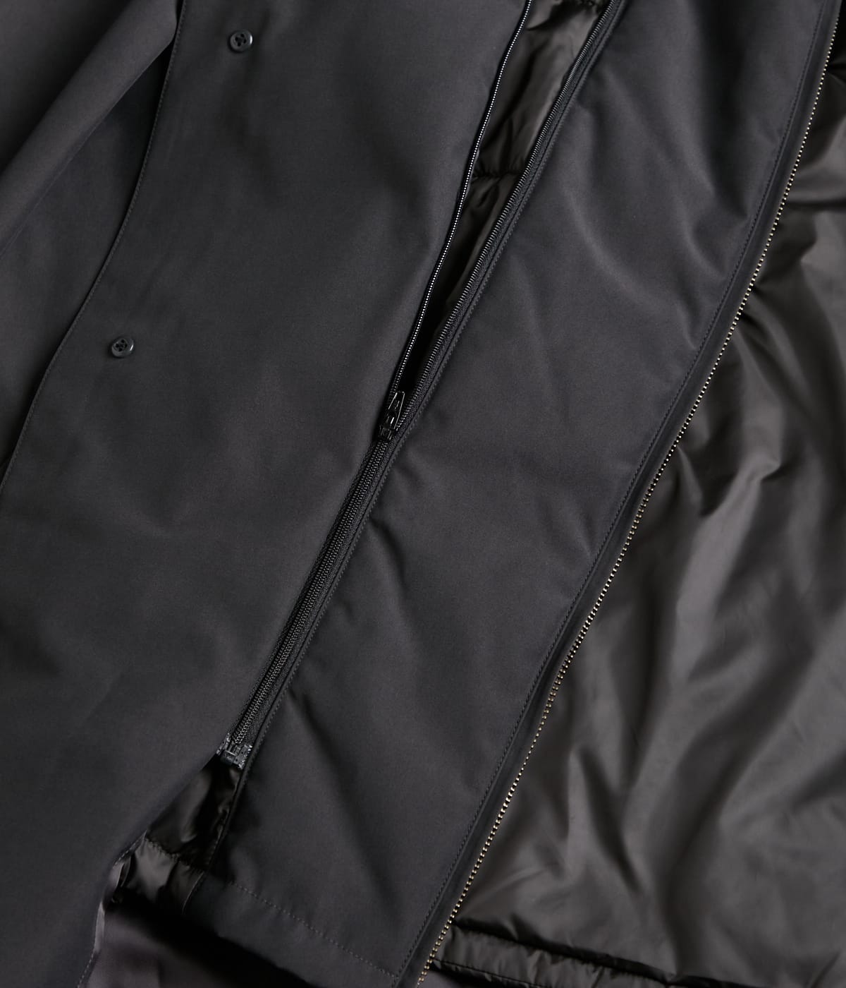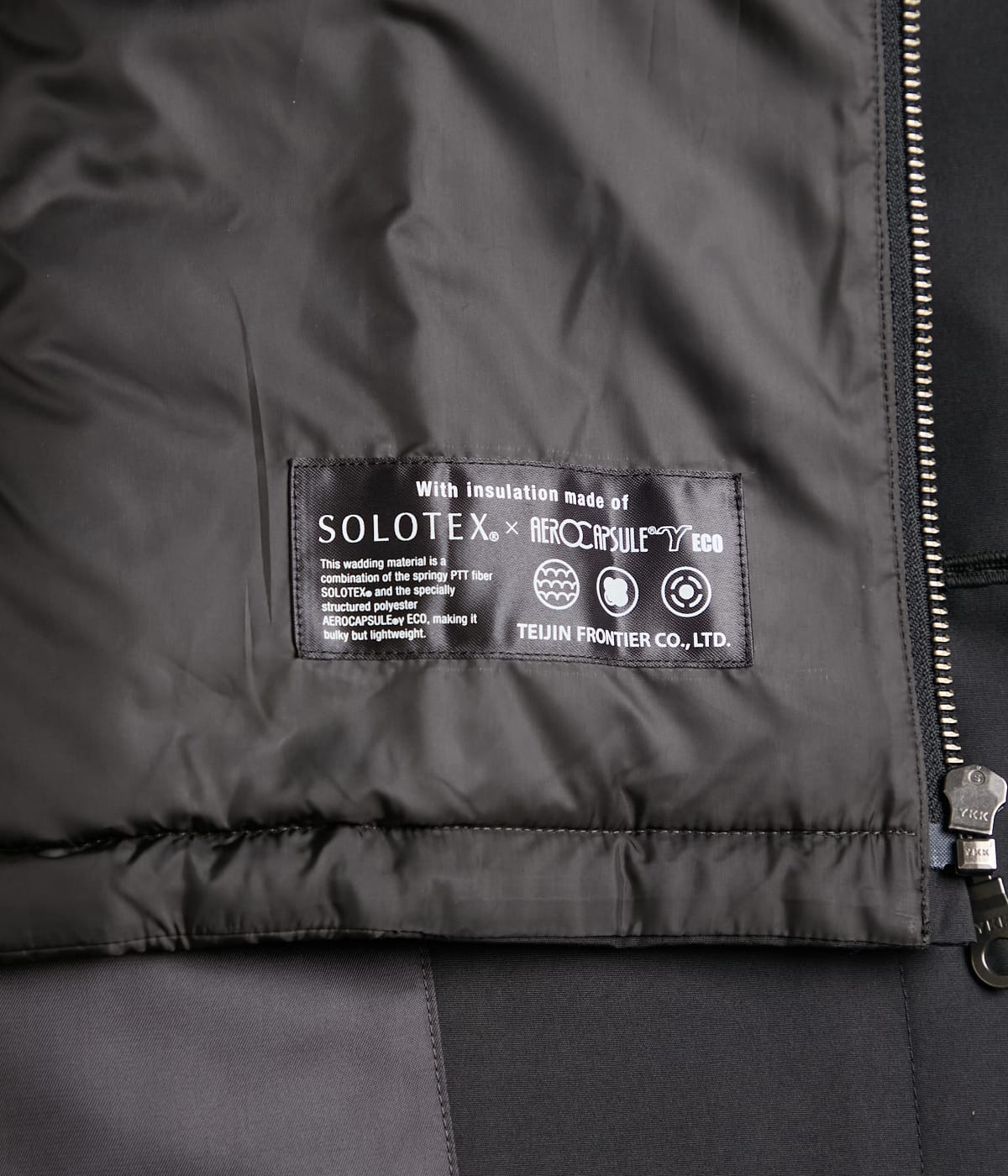 表地には、ポリエステルにウールをブレンドしたグログラン生地を使用。適度なハリとコシがあり、仕立て映えのする上質な風合いが魅力です。ライナーの中わたには、地球環境に配慮したリサイクルポリエステルを使用した「SOLOTEX」を採用。軽やかな着心地と保温性を両立しています。