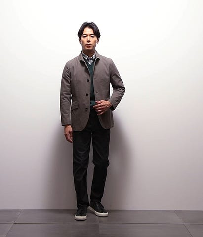 表地は綿とポリウレタンで伸縮性を持たせ、杢糸を使って複雑な色合いとマイクロヘリンボーン柄を表現しています。さらに、表面を少し起毛させて秋冬らしい温かみのある生地に仕上げています。またストレッチ性のある裏地を使用することで、より快適な着心地を実現します。