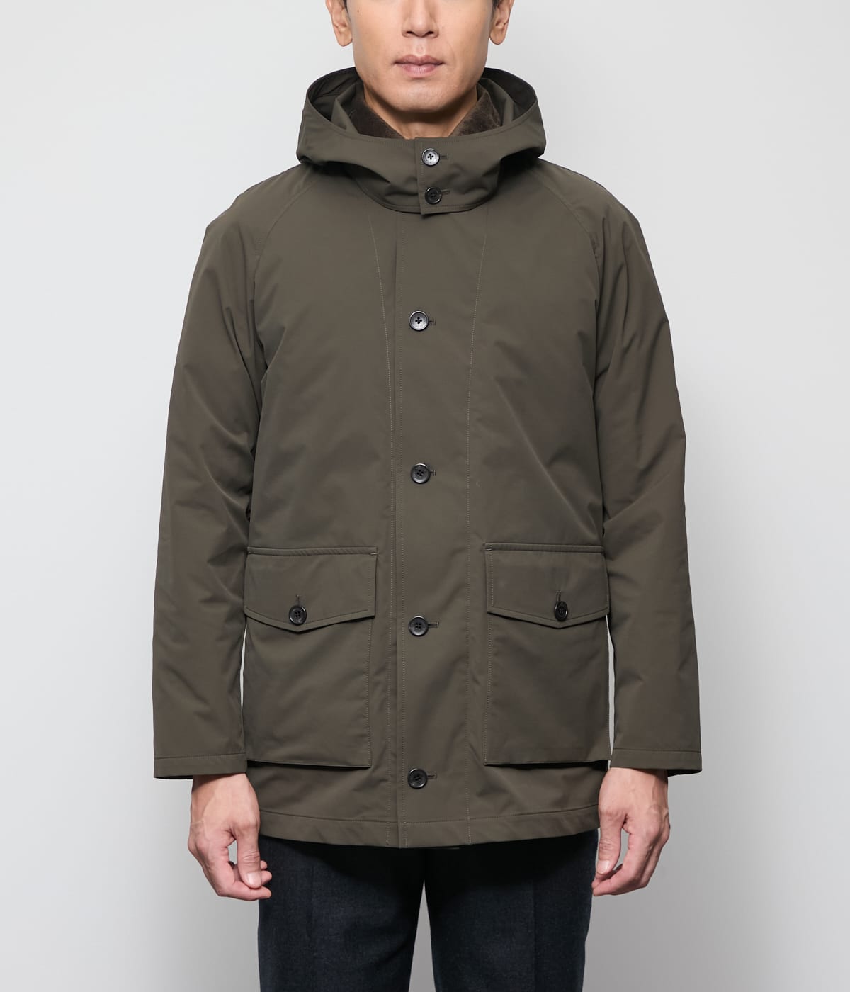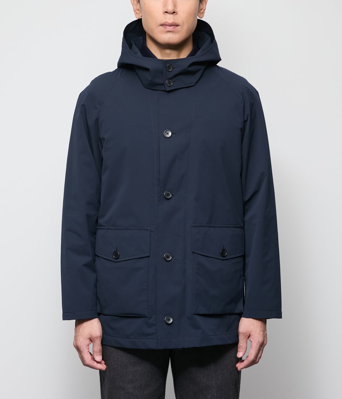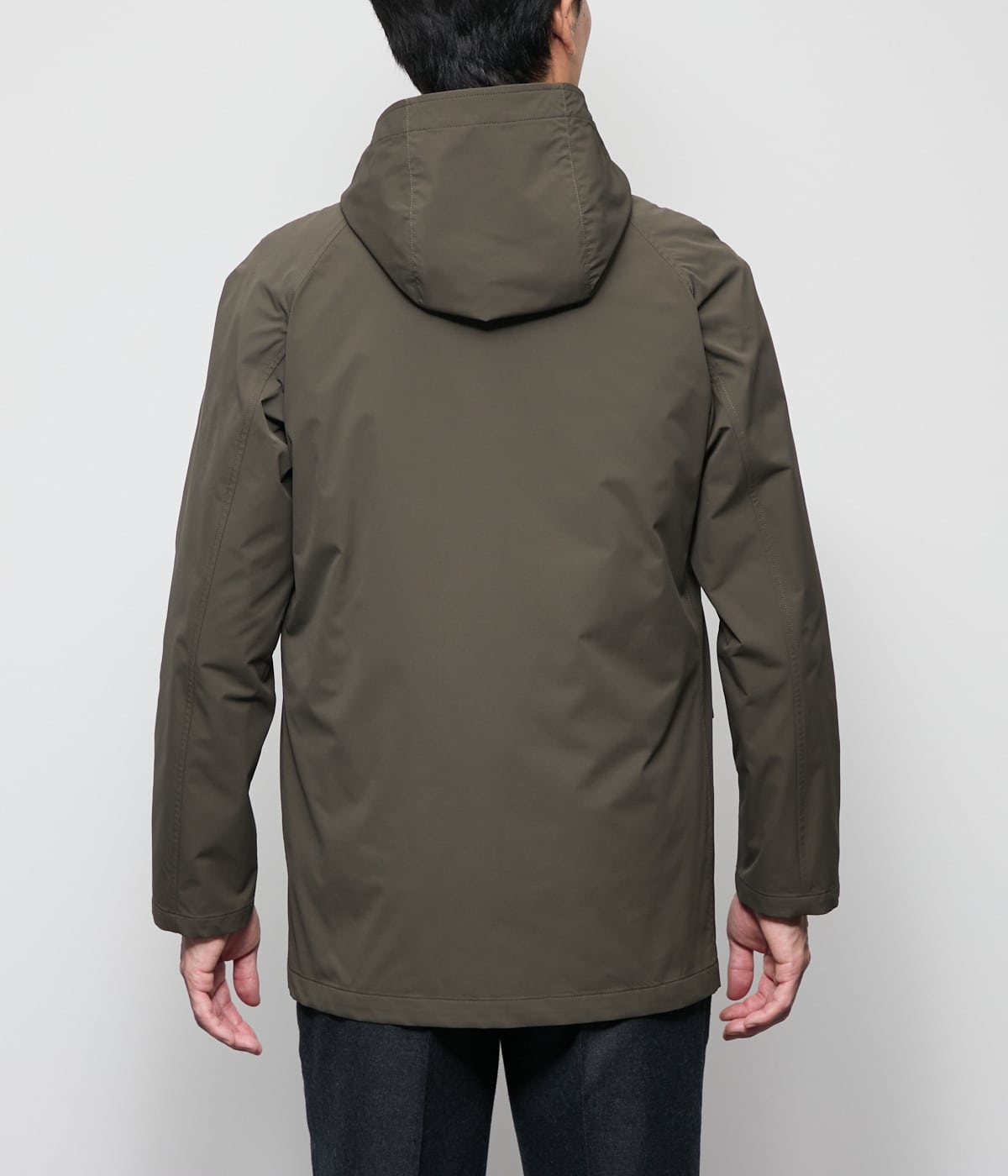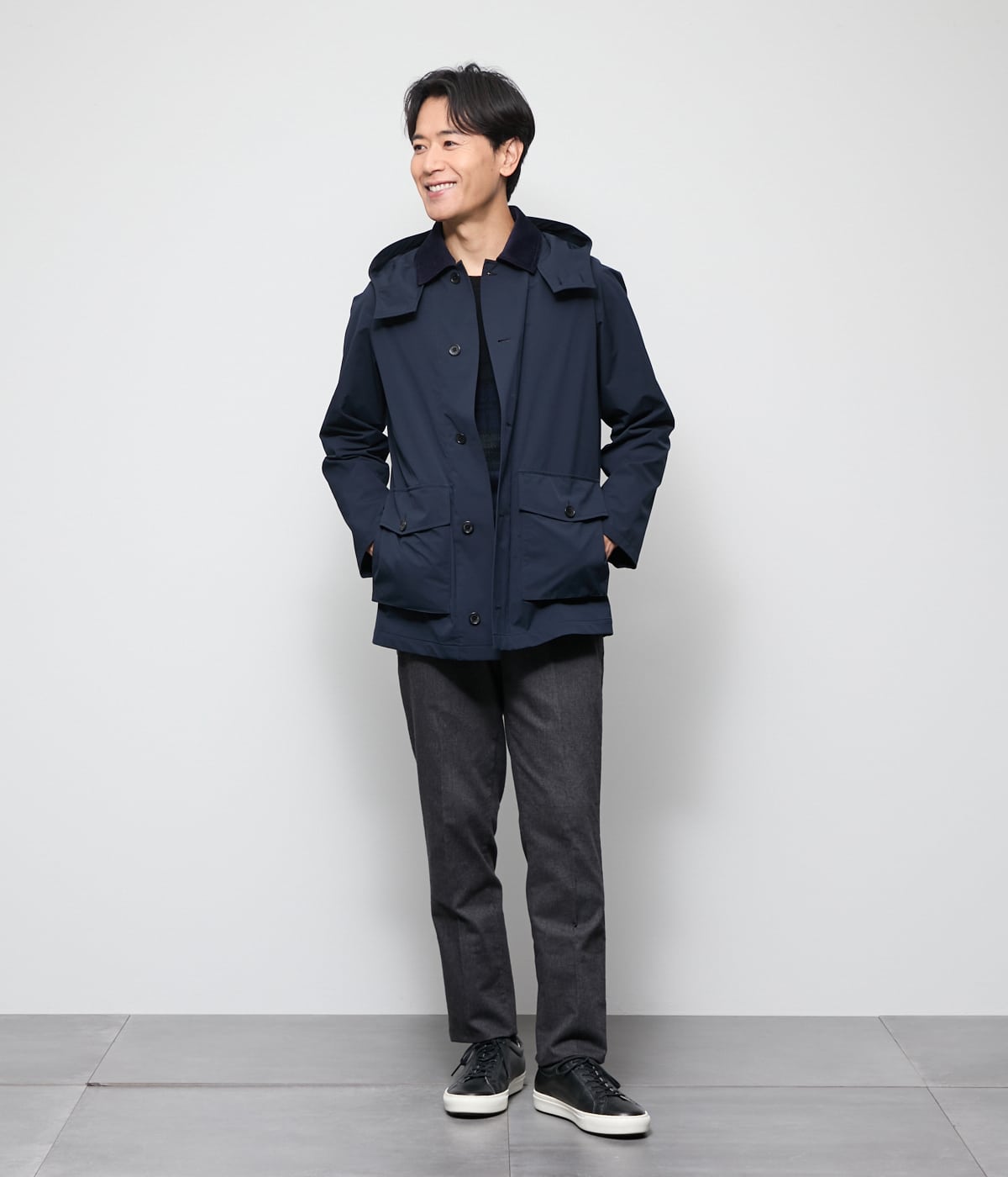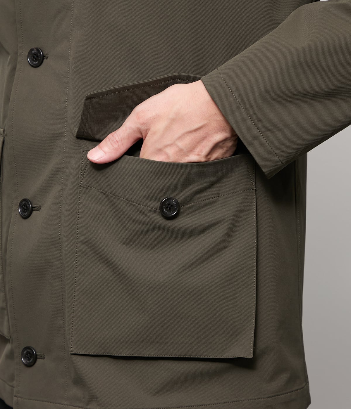 オンオフ問わず着用できるハンティングジャケット。ビジネスシーンも想定した丈感とシルエットが特徴です。ライナーとフードは、天候やコーディネートに合わせて取り外し可能です。大き目の腰ポケットには、ハンドウォーマーも備えております。