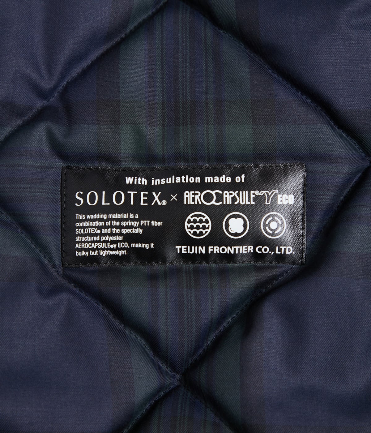 綾目がたった軽量のポリエステル100%素材を使用。防シワ、撥水、ストレッチ性のある機能性素材です。キルティング加工を施した、付属のライナーには軽さと暖かさを両立するためにSOLOTEX中わたを使用しております。中わたにはリサイクルポリエステルを使用しており、地球環境にも配慮したSDGs素材です。