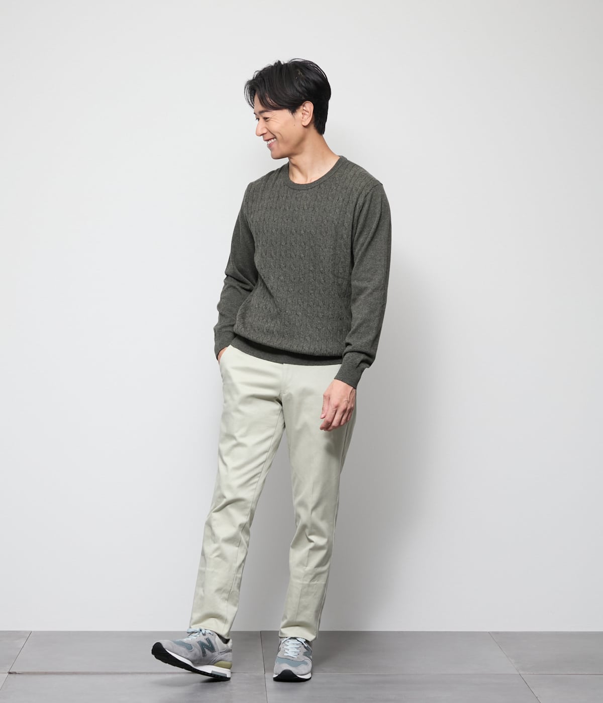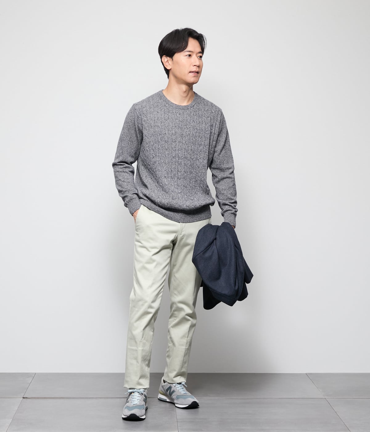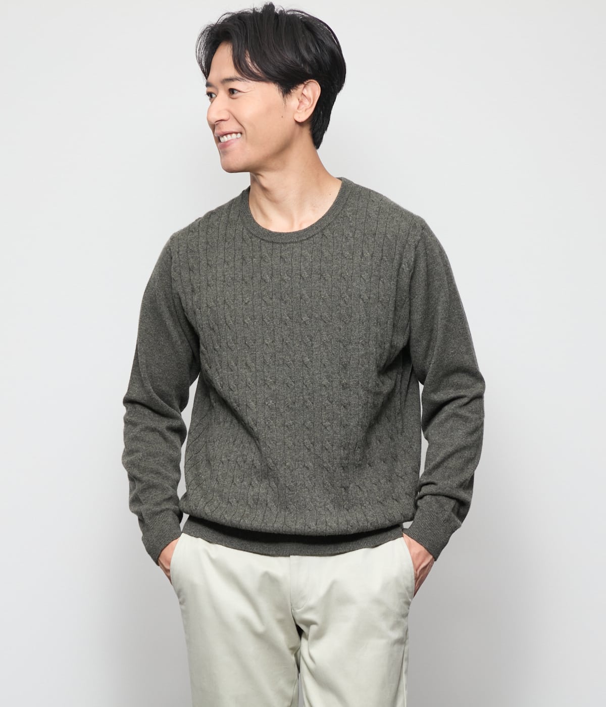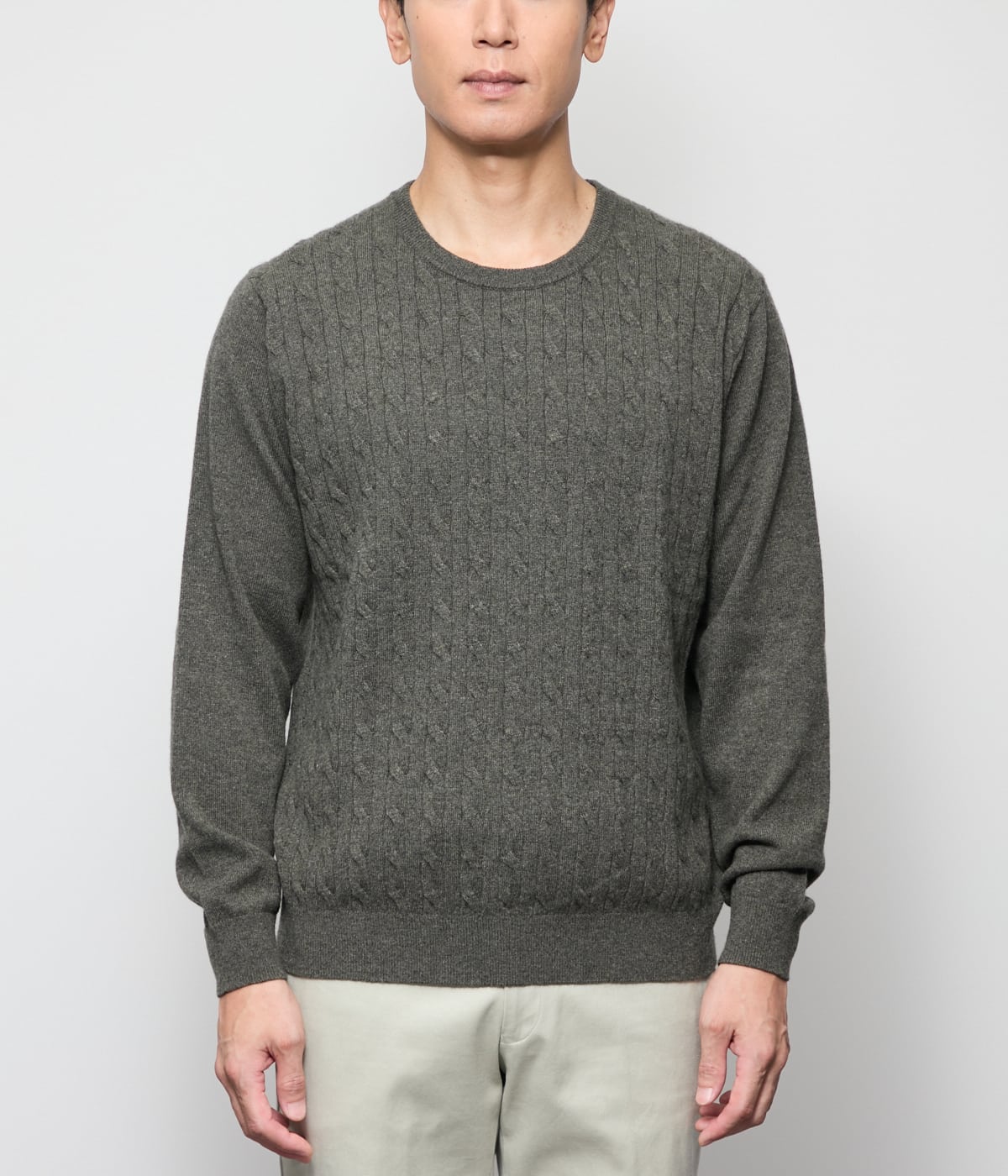 フロントに細めのケーブル編みを施したクルーネックニット。シンプルで着回しやすく、トレンドに左右されないタイムレスなデザインです。インナーにちょうどいいジャストな着用感です。