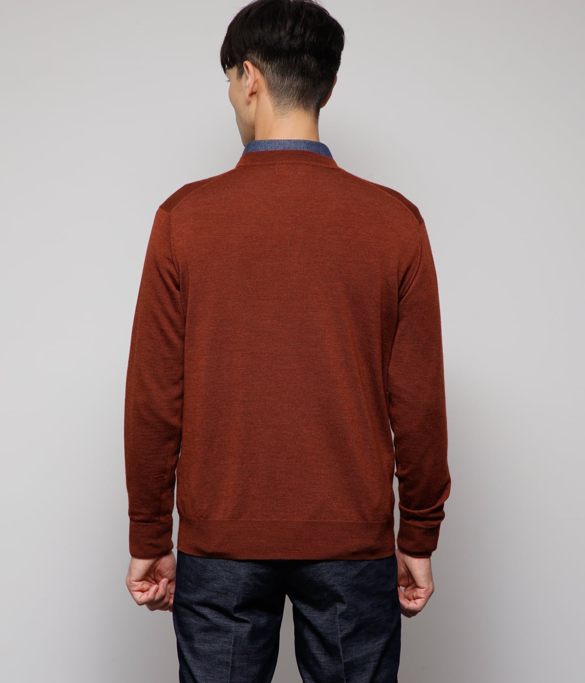 深みのあるメランジ(霜降り調)がコーディネートにアクセントを加えるデザイン。シンプルなVネックデザインで、様々なアイテムと合わせやすいアイテムです。ネックラインや袖・裾口をリブ編みにしており、編地の変化でメリハリをつけています。