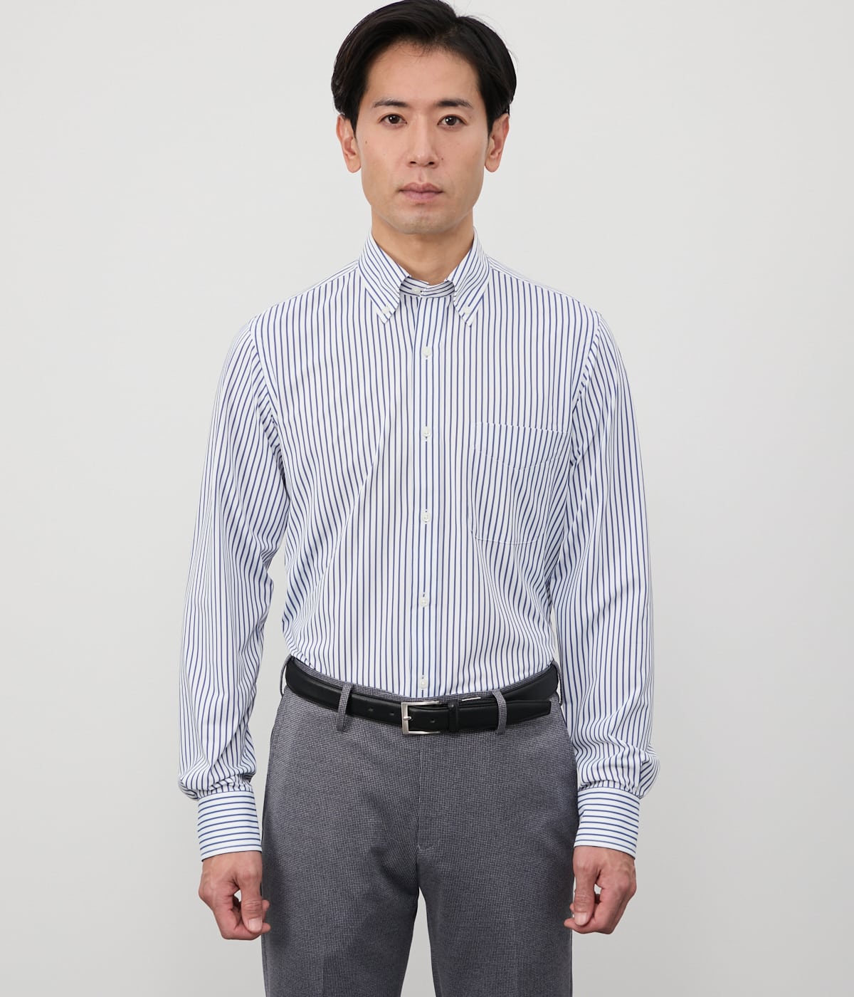 着回しやすいストライプ柄の長袖ボタンダウンシャツ。伸縮性のある柔らかい生地を使用した、快適な着心地のドレスシャツです。