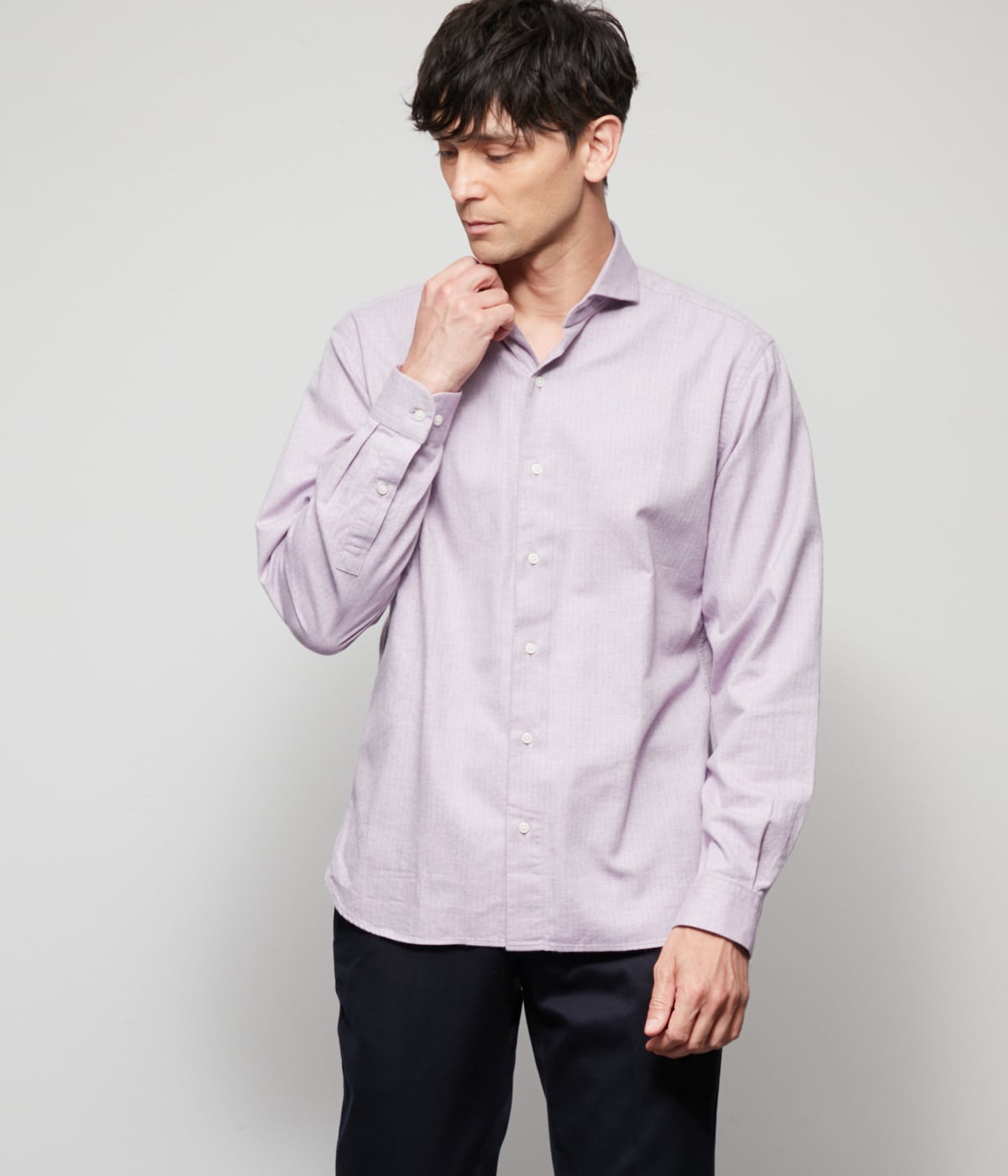 綿素材にピーチ起毛をかけた長袖カッタウェイカラーシャツ。単品での着用からジャケットやアウターと合わせた着こなしまで、秋冬のインナーとしても活躍します。チノパンやデニムと合わせたカジュアルスタイルがおすすめです。