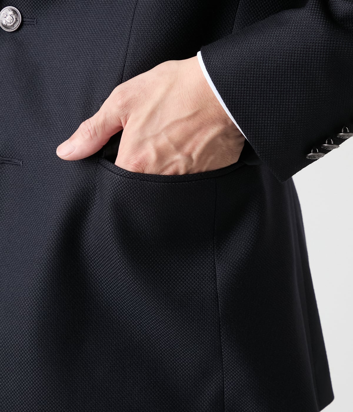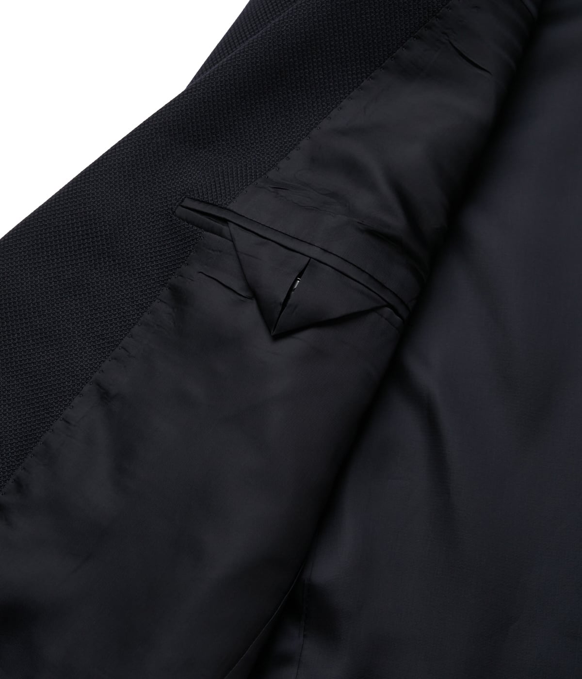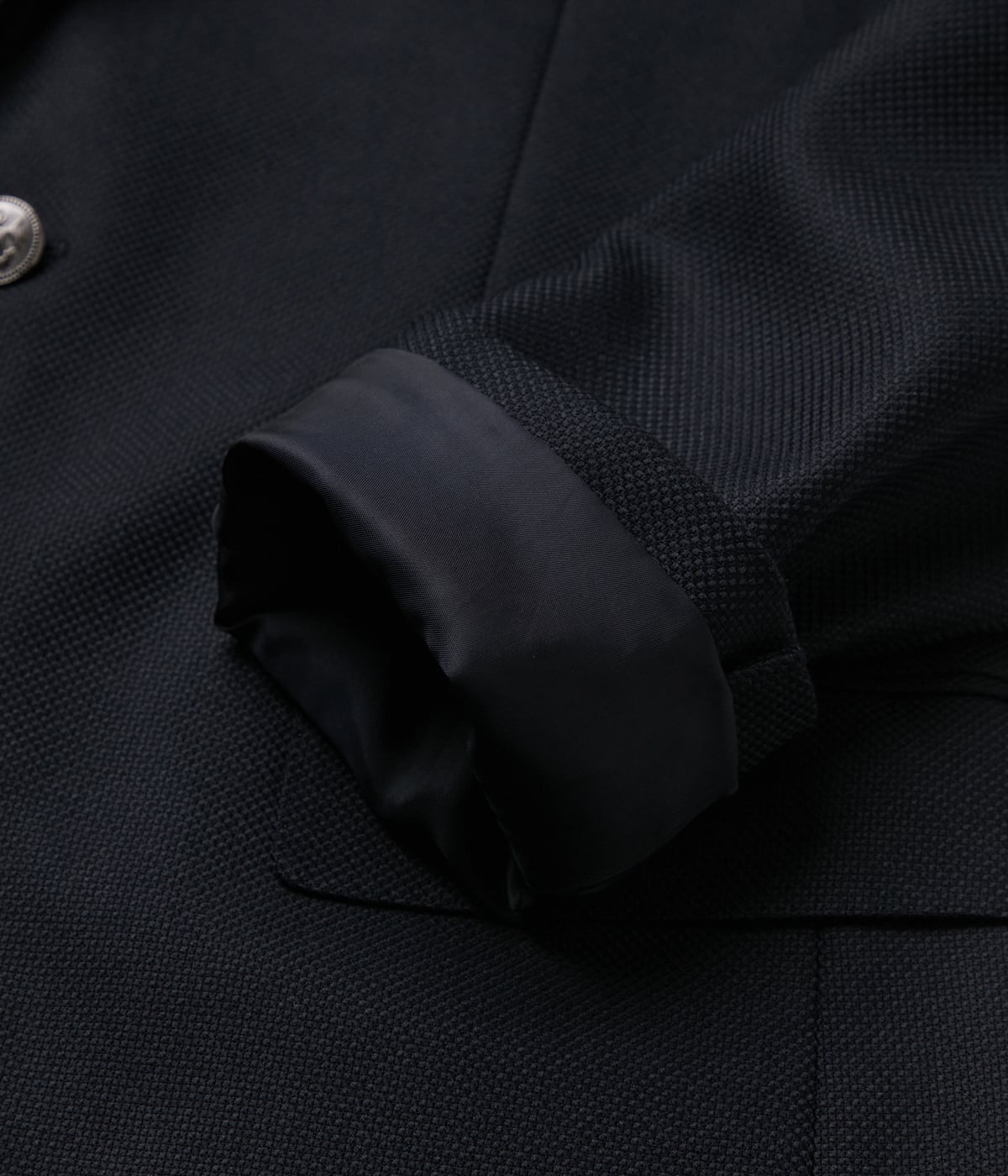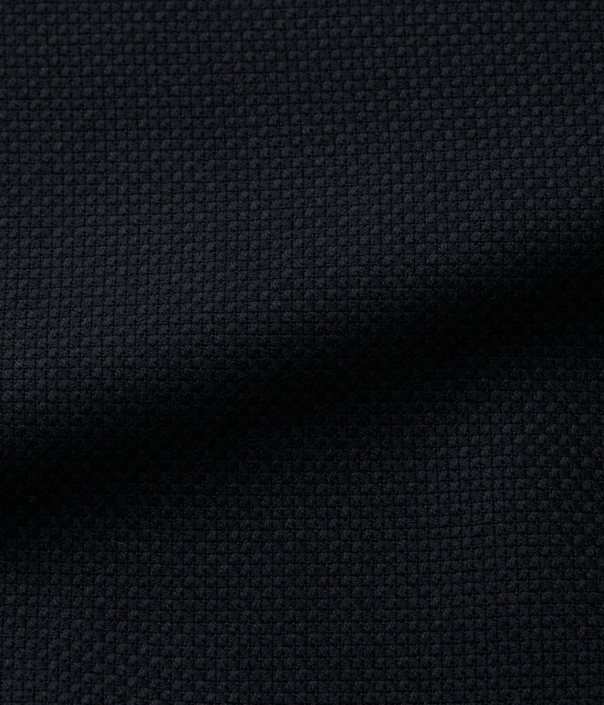 ウール、ポリエステルを使用した素材。ドビー織りによる繊細な凹凸感が生地に立体感を与え、強めのセットによるクリアな仕上がりが上質な表情を演出。ハリとコシを備えながらも自然なドレープ性があり、上品な光沢感が魅力です。