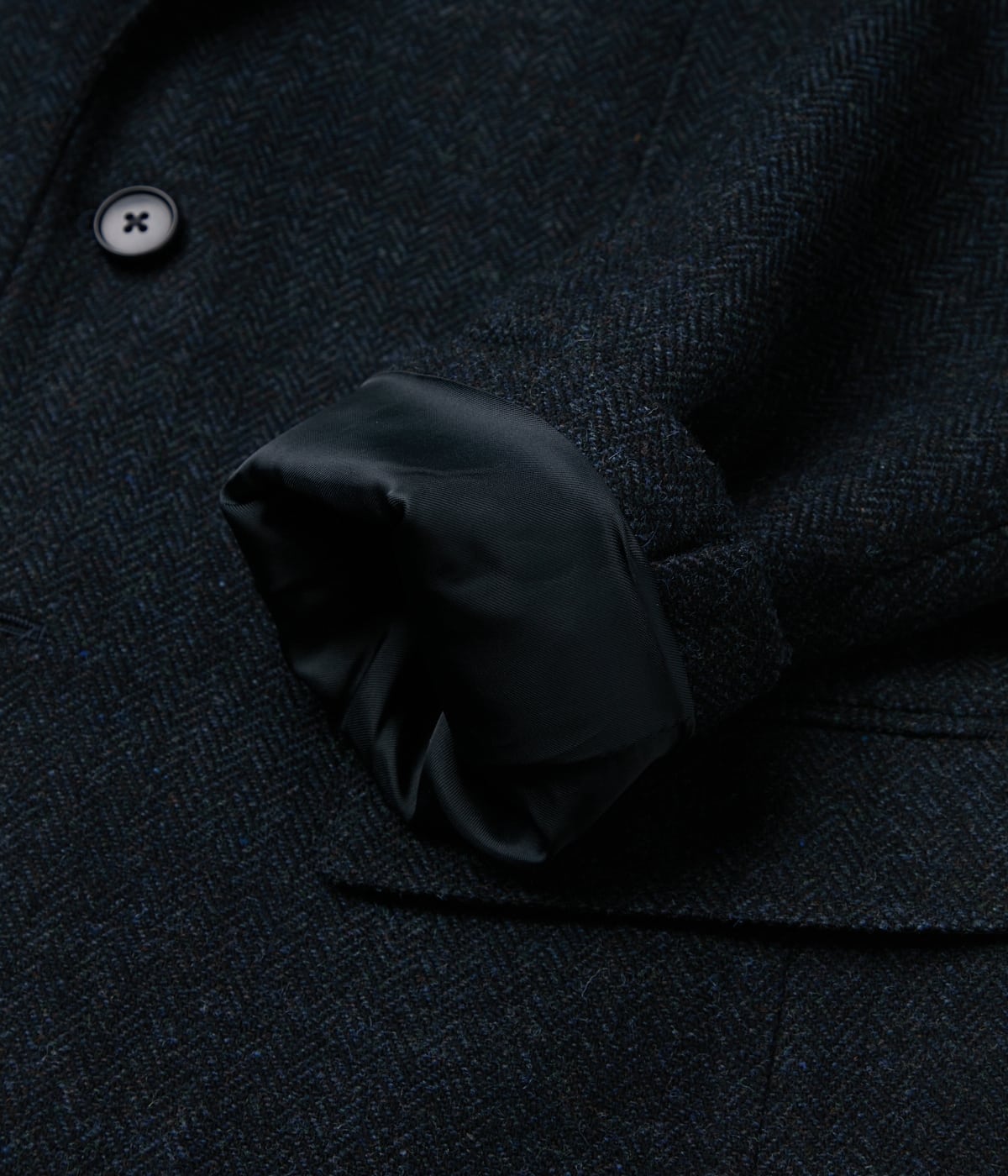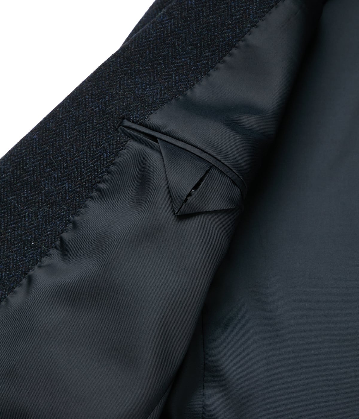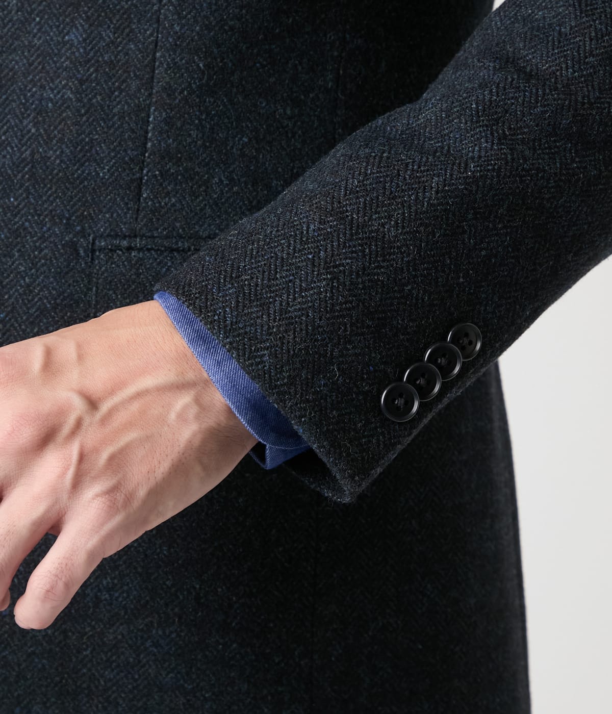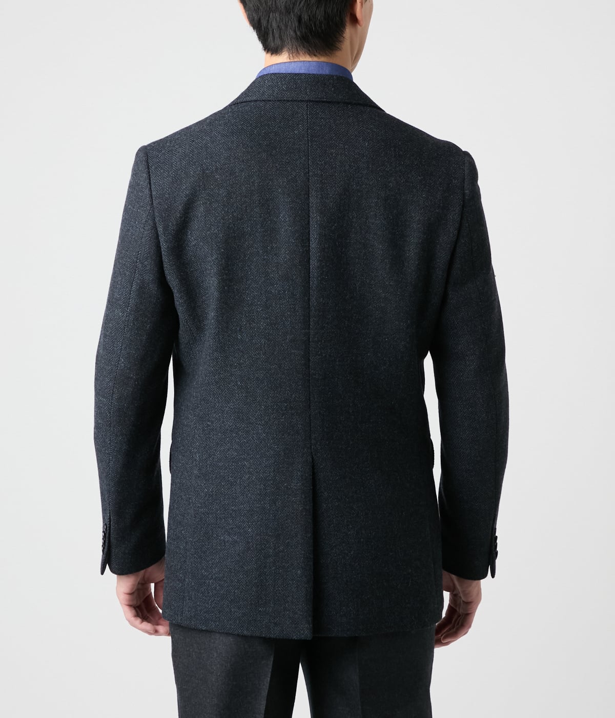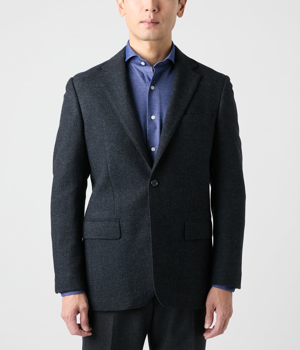 ツィードのような豊かな表情とブルーミックスのヘリンボーン柄が魅力のジャケット。上品で落ち着いた色合いが、秋冬の装いに季節感を添えます。ビジネスシーンにはもちろん、タートルネックやニットを合わせた大人のカジュアルスタイルにも活躍する一着です。