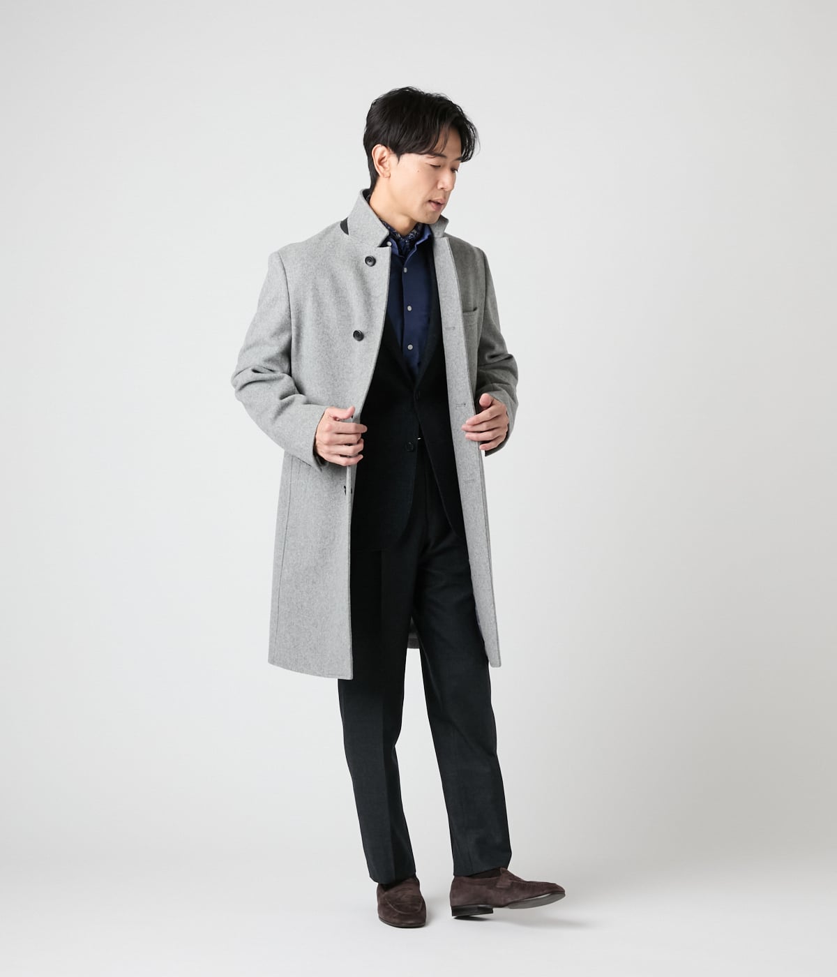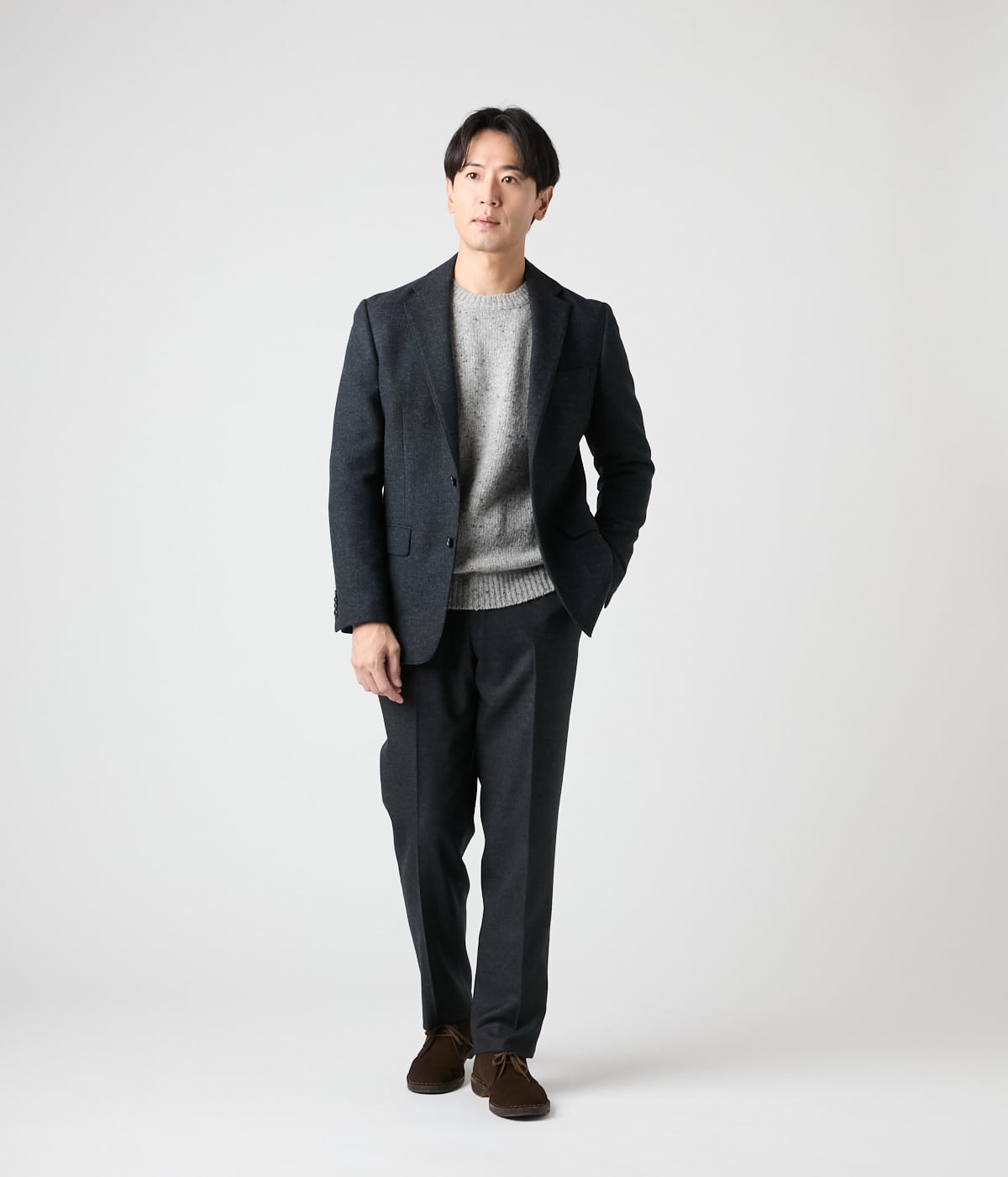 ウール、ポリエステル、ナイロンの素材を使用。3者混素材をバランス良くミックスした、柔らかな風合いが特徴で、軽やかな着心地と程よい温もりを感じられます。天然素材ならではの上質感に、ポリエステルなどの化学繊維によるハリ感や加わり、扱いやすい生地に仕上がっています。