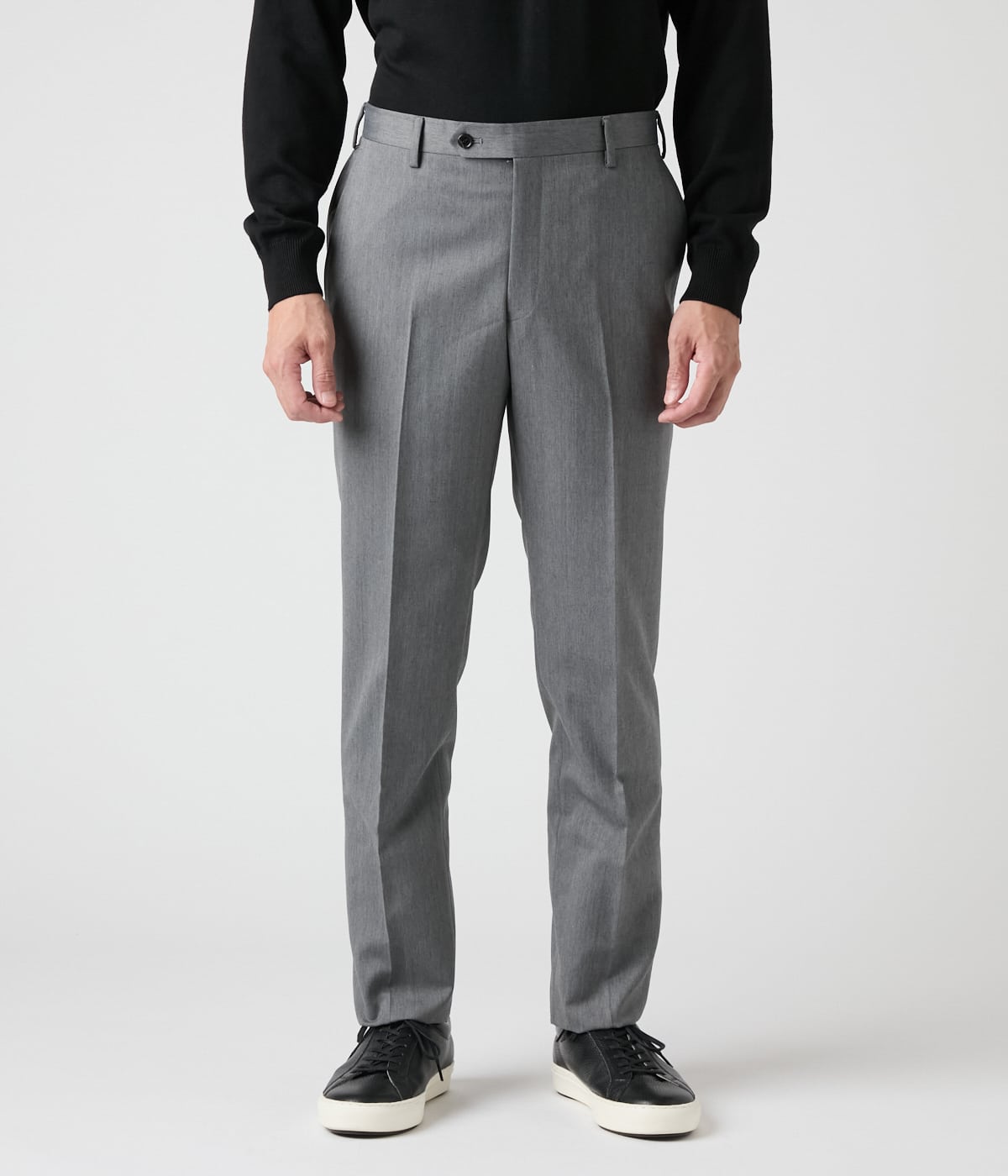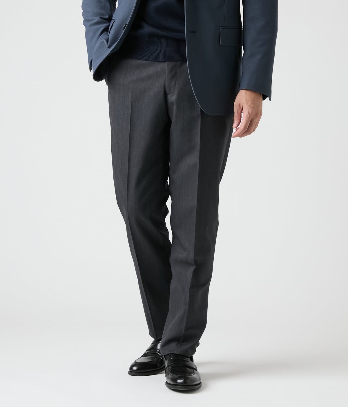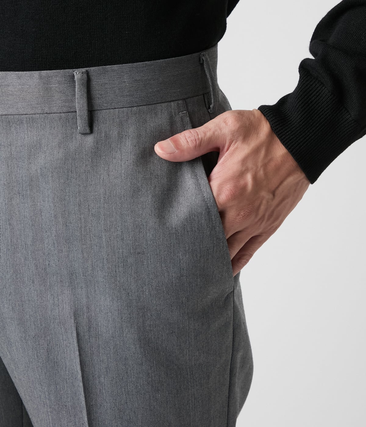 ウールの上品さとポリエステルの扱いやすさを融合した、季節感のあるヘリンボーン柄のスラックス。落ち着いたトーンと織柄が大人の品格を引き立て、ビジネススタイルから休日のお出かけスタイルまでオンオフ兼用で活躍します。