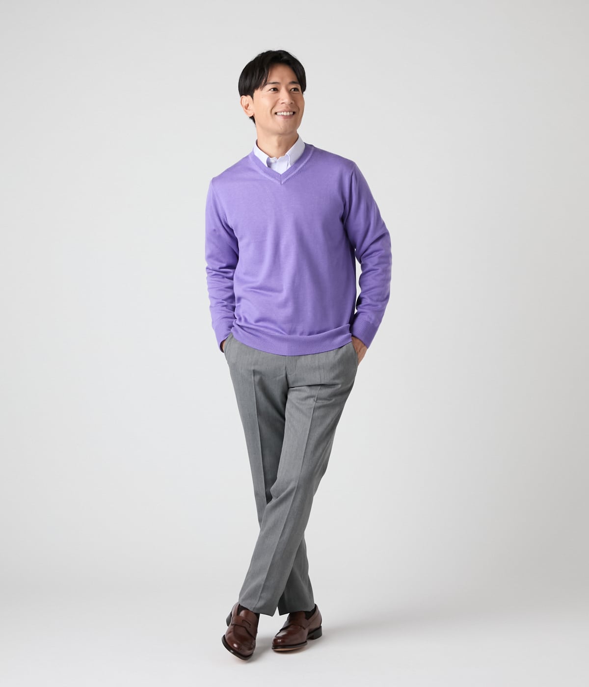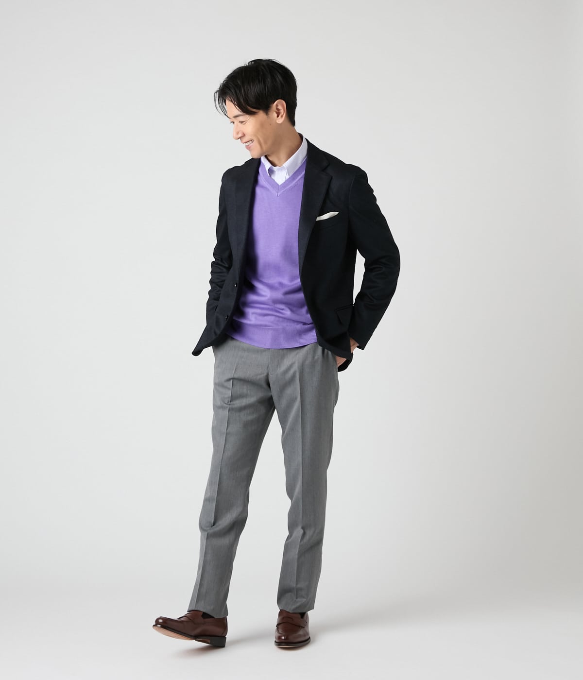 ウール、ポリエステルを使用した素材。柔らかな風合いと程よい光沢感を併せ持ち、上質な印象を演出します。耐久性と快適な着用感を両立し、長時間の着用でも型崩れしにくいのが特徴です。