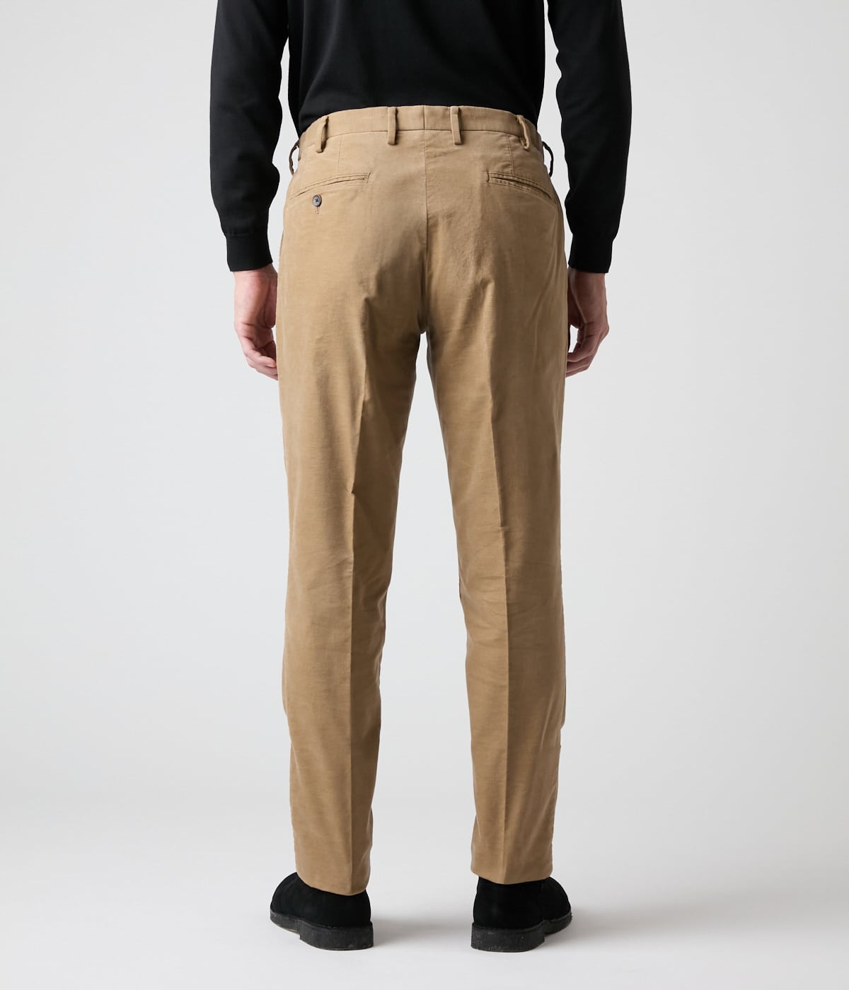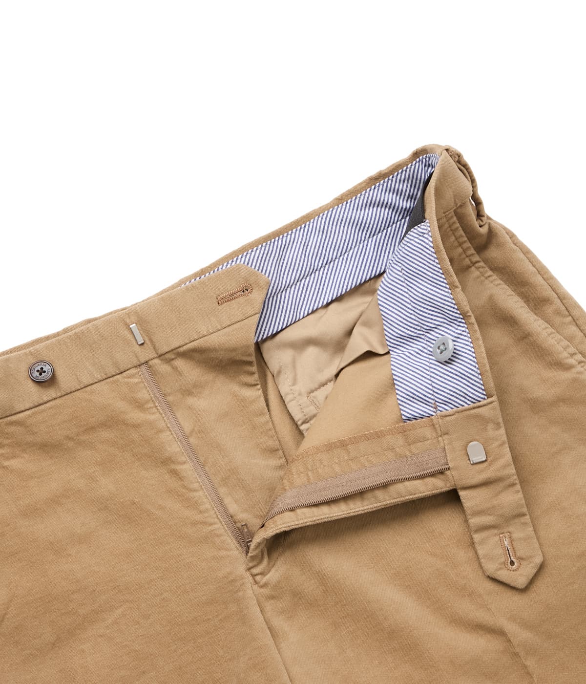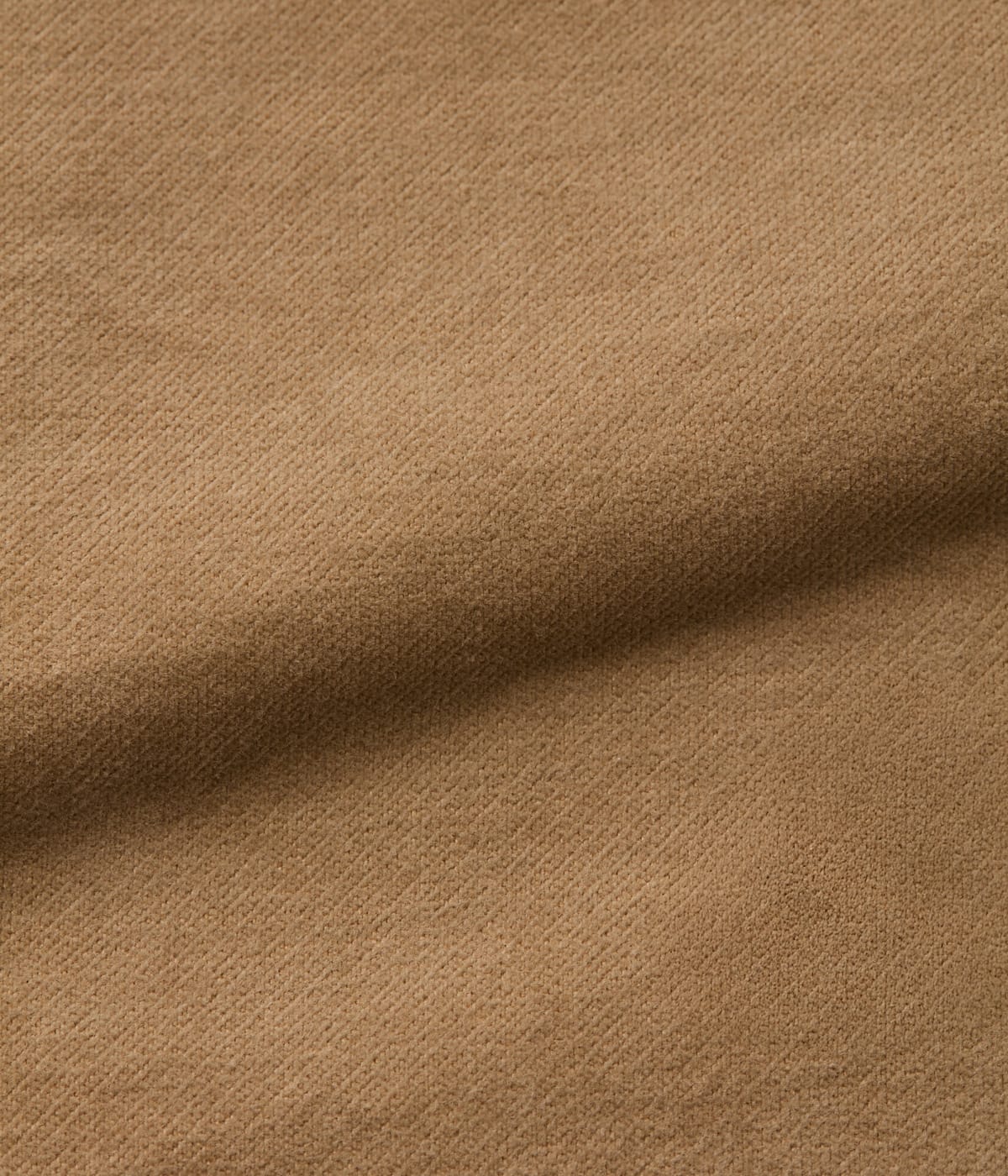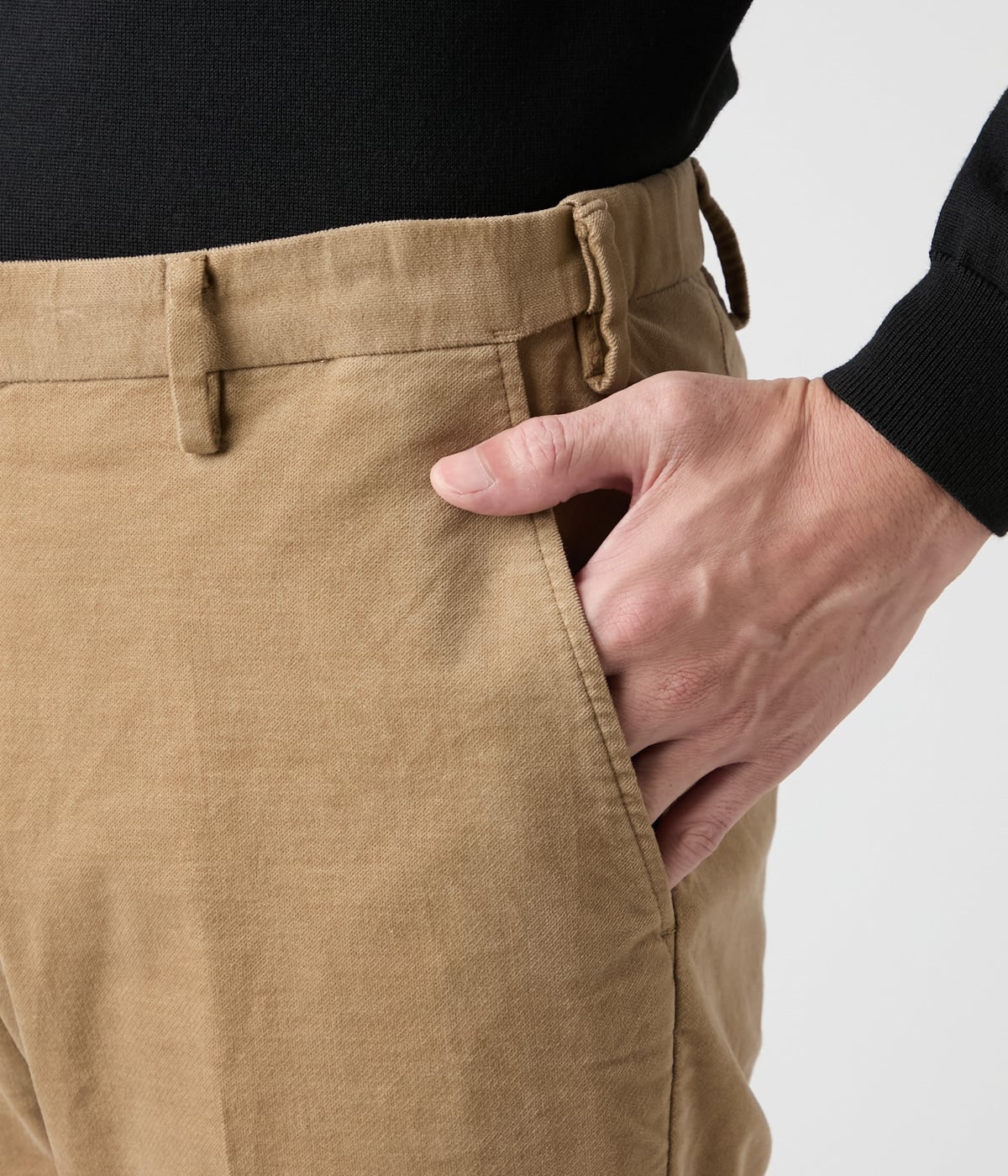 コットン、ポリエステル、ポリウレタン素材を使用。表面を均一にカットした膨らみがあり繊細な畝が特徴の、伸縮性があるコーデュロイ生地を使用しています。