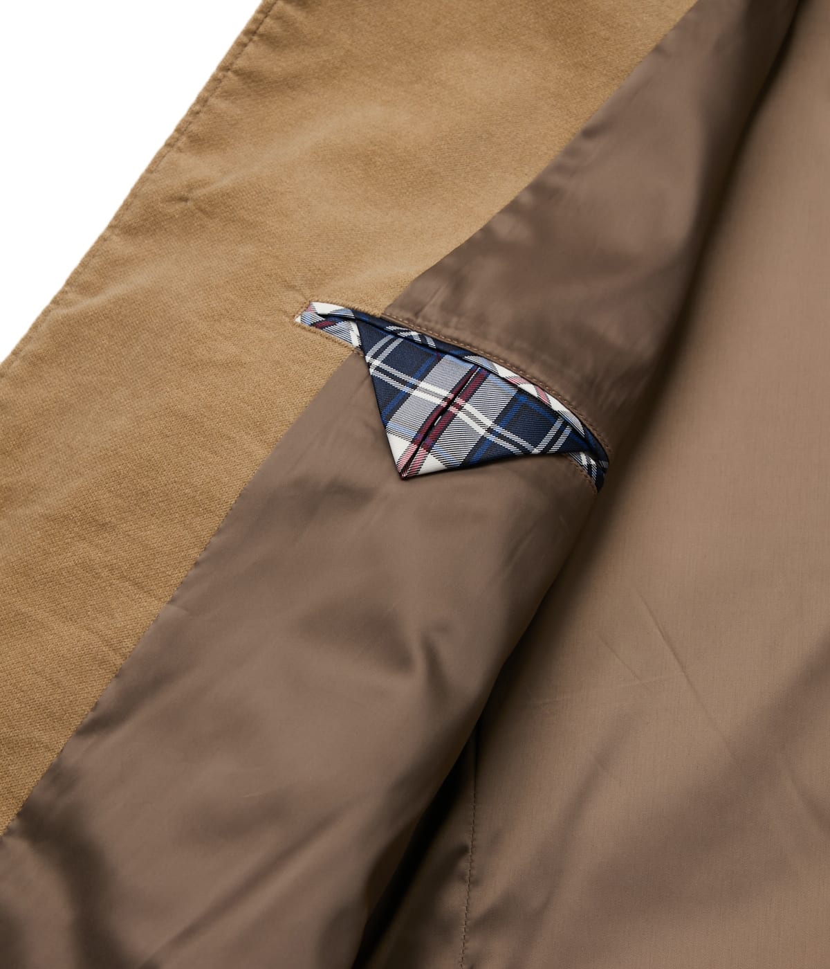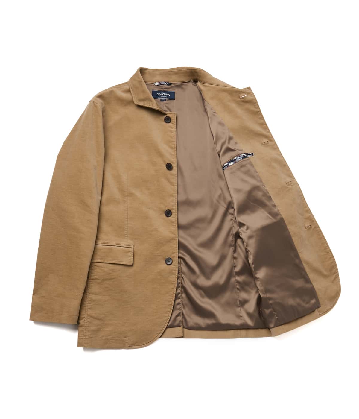 スッキリとした印象のカッタウェイカラーの襟にワイヤーを入ることで変化のある表情を愉しめます。ジャケットのサイドには二段階調節式のアジャスターボタンが備わっており、一段階詰めて釦を留めれば、絞りの利いたシルエットになります。また、裏地の細部にニューヨーカータータン柄を配しております