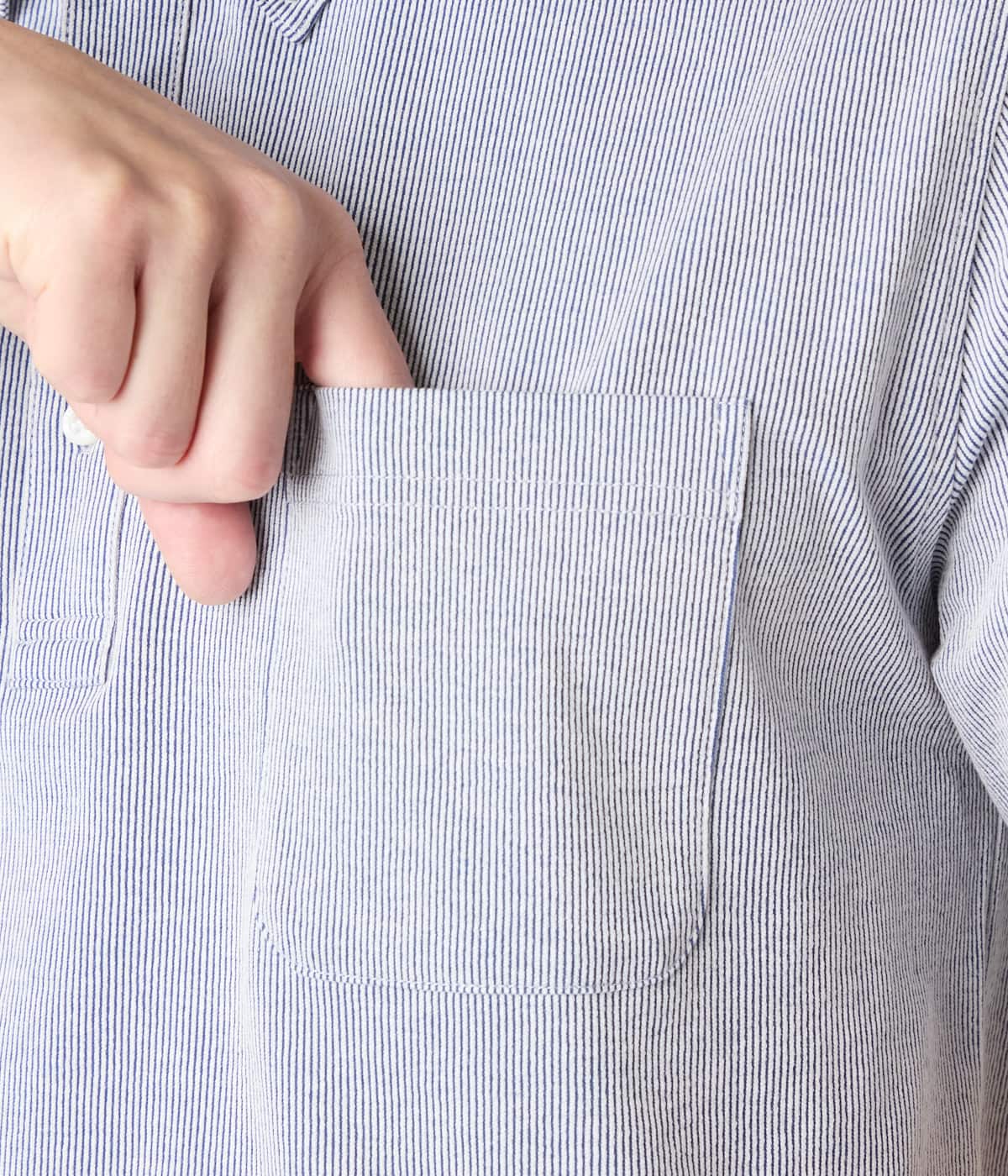 コットンとポリエステルを使用した素材。表面の凹凸感と肌離れの良さが特徴のサッカー生地です。汗ばむ季節でも、ドライタッチな肌触りで快適にお過ごしいただけます。