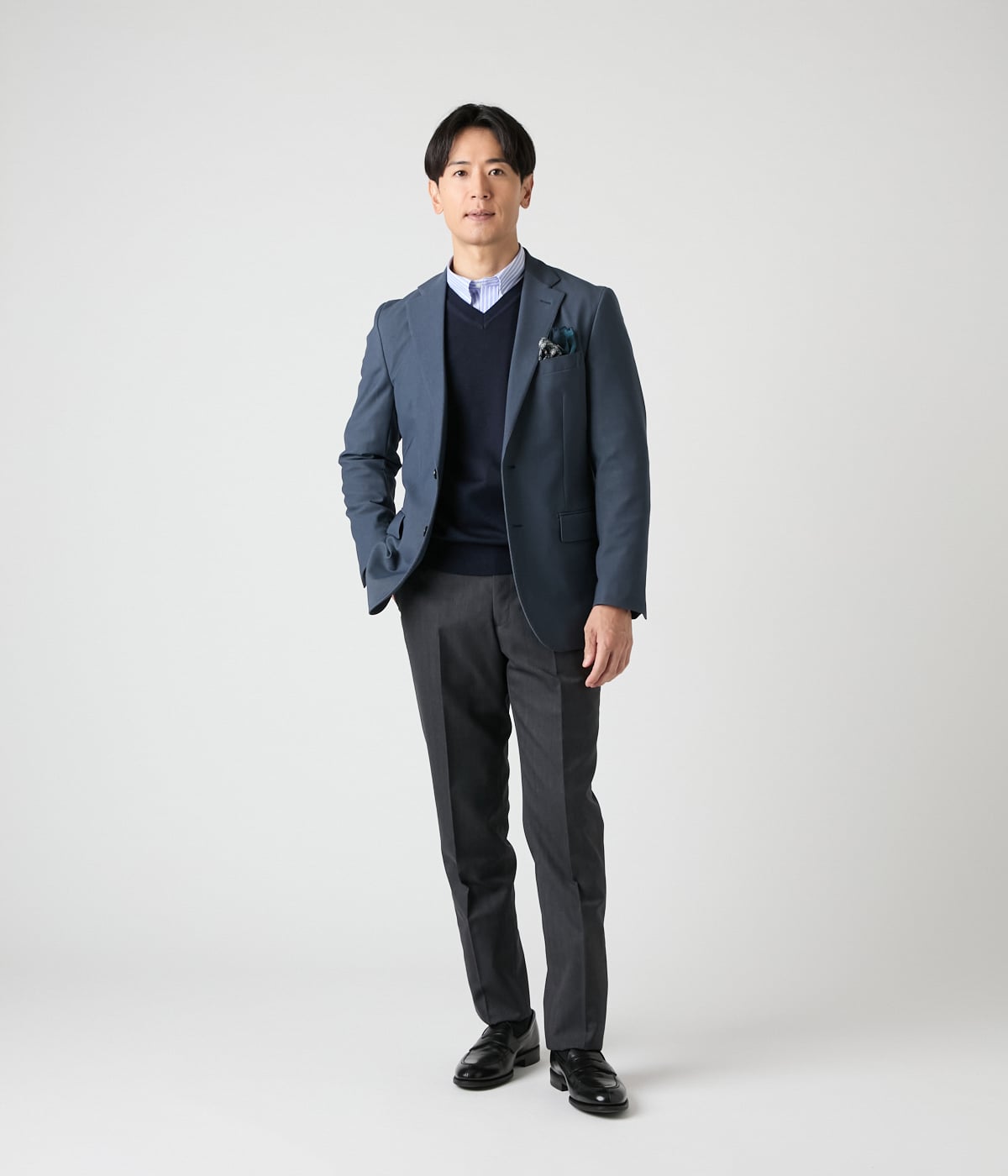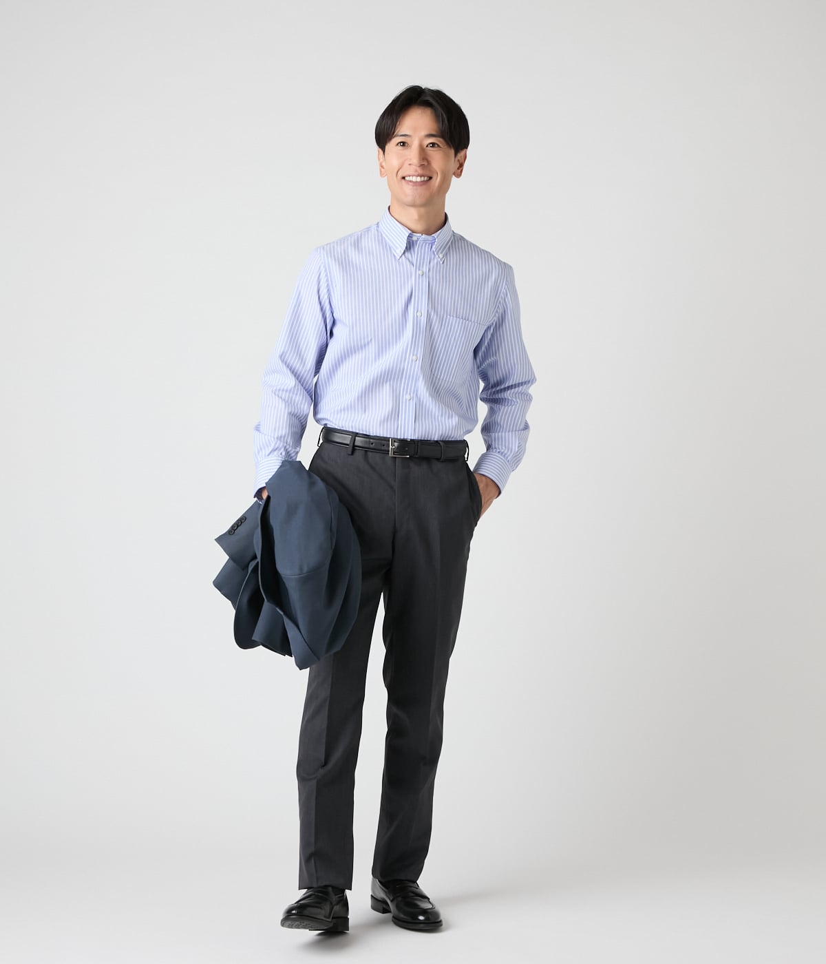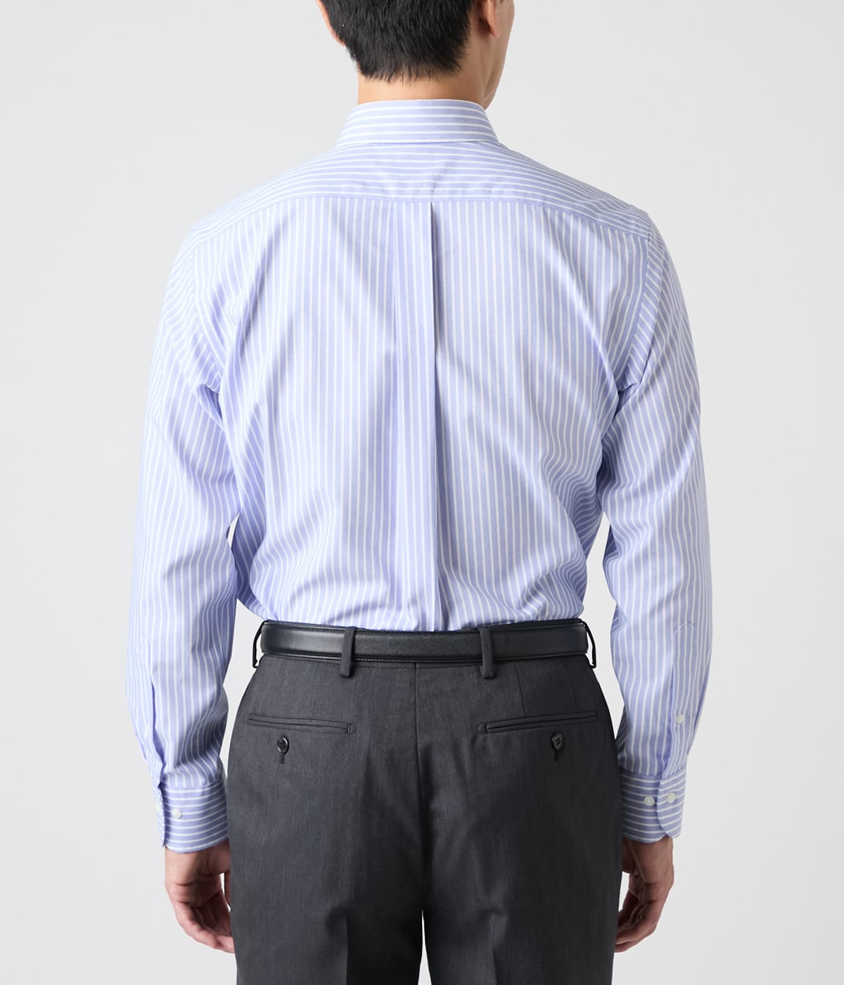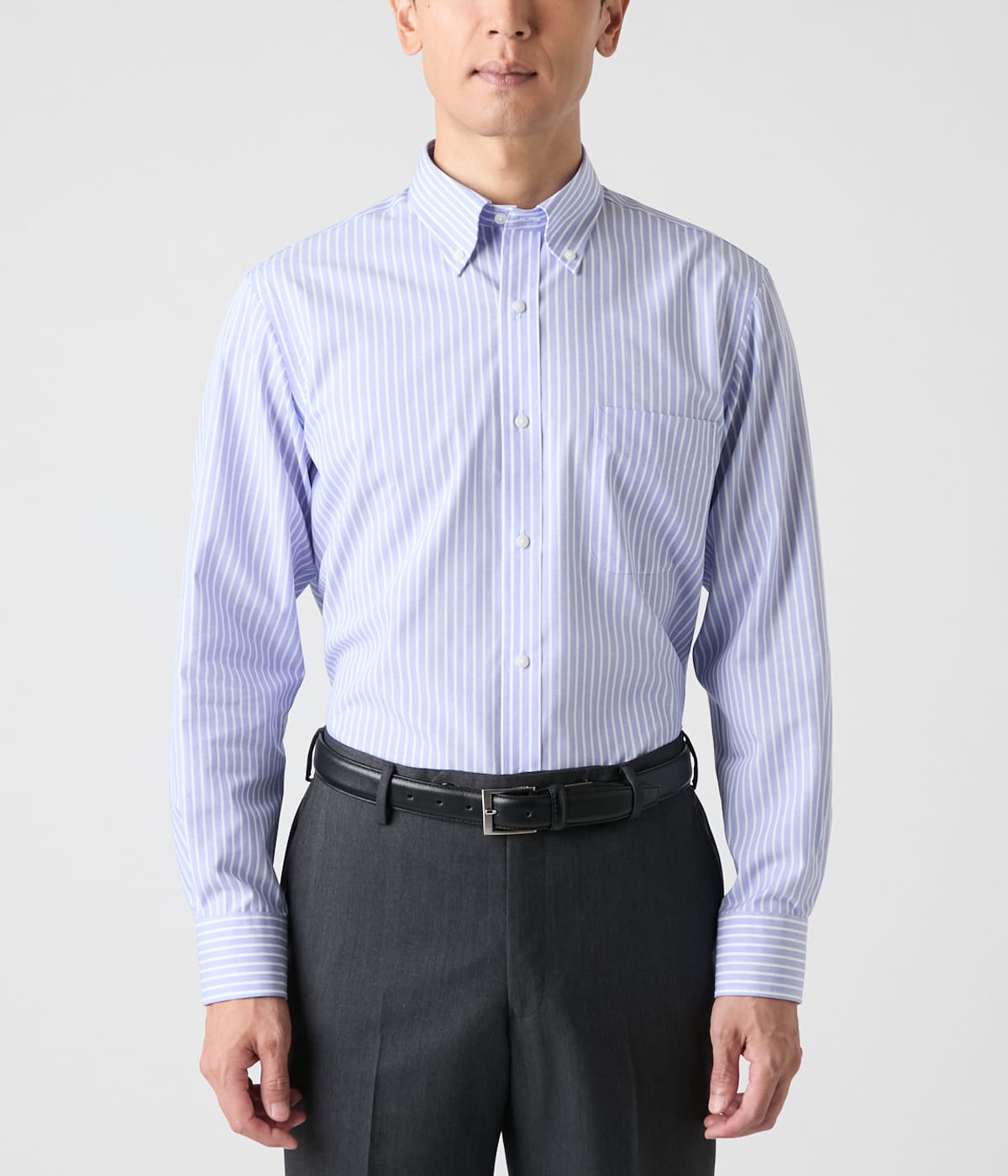 柔らかな刷毛目調のブルーを基調にホワイトストライプ柄を配した長袖ボタンダウンシャツ。スマートな印象でビジネスシーンはもちろん、ジャケットやカーディガンのインナーとしても活躍する一着です。