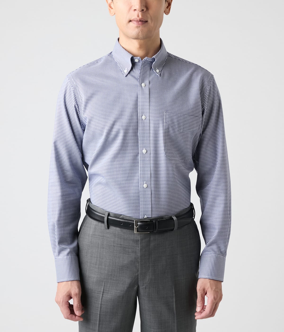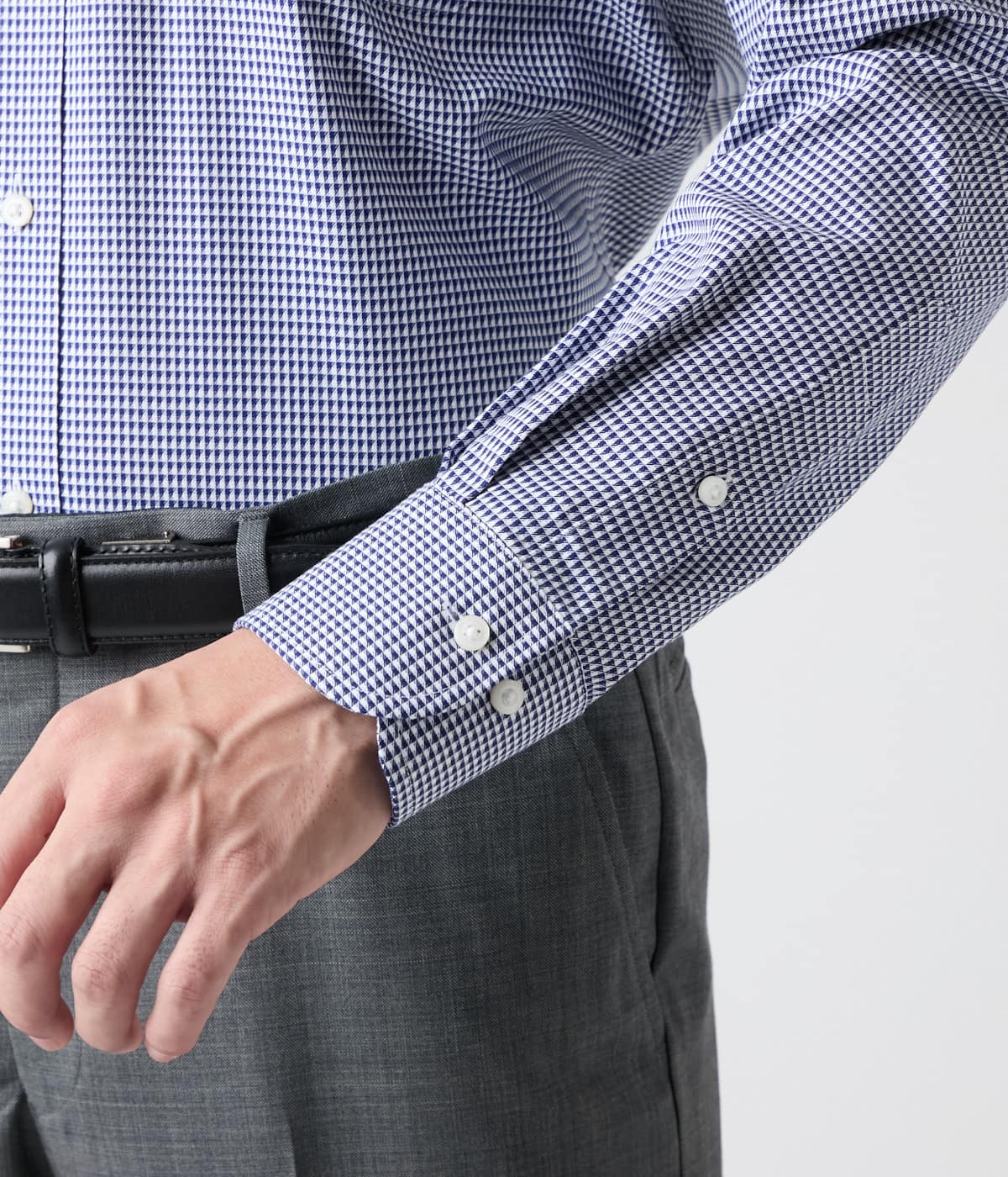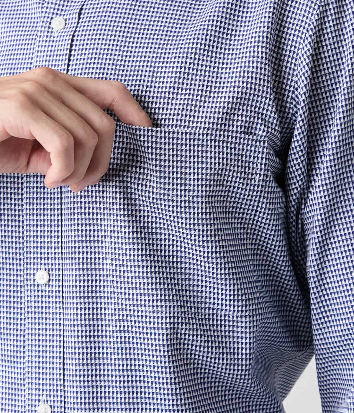 ホワイトをベースにネイビーのドビー小紋柄を配したボタンダウンシャツ。着こなしにアクセントを与え、オン・オフ兼用で着用可能です。タイドアップしたビジネススタイルから、ノーネクタイでのラフなスタイルまで、幅広い着こなしで活躍します。