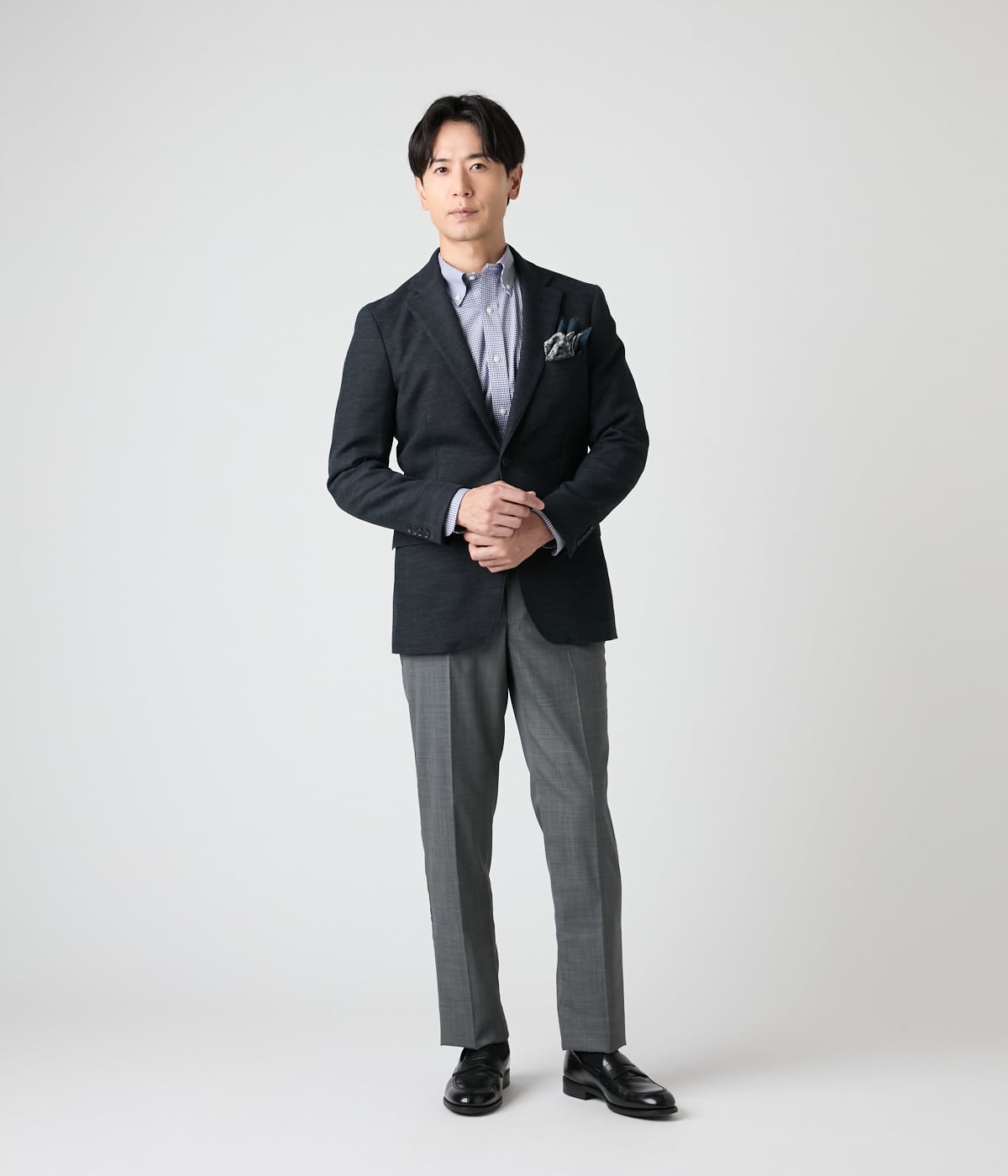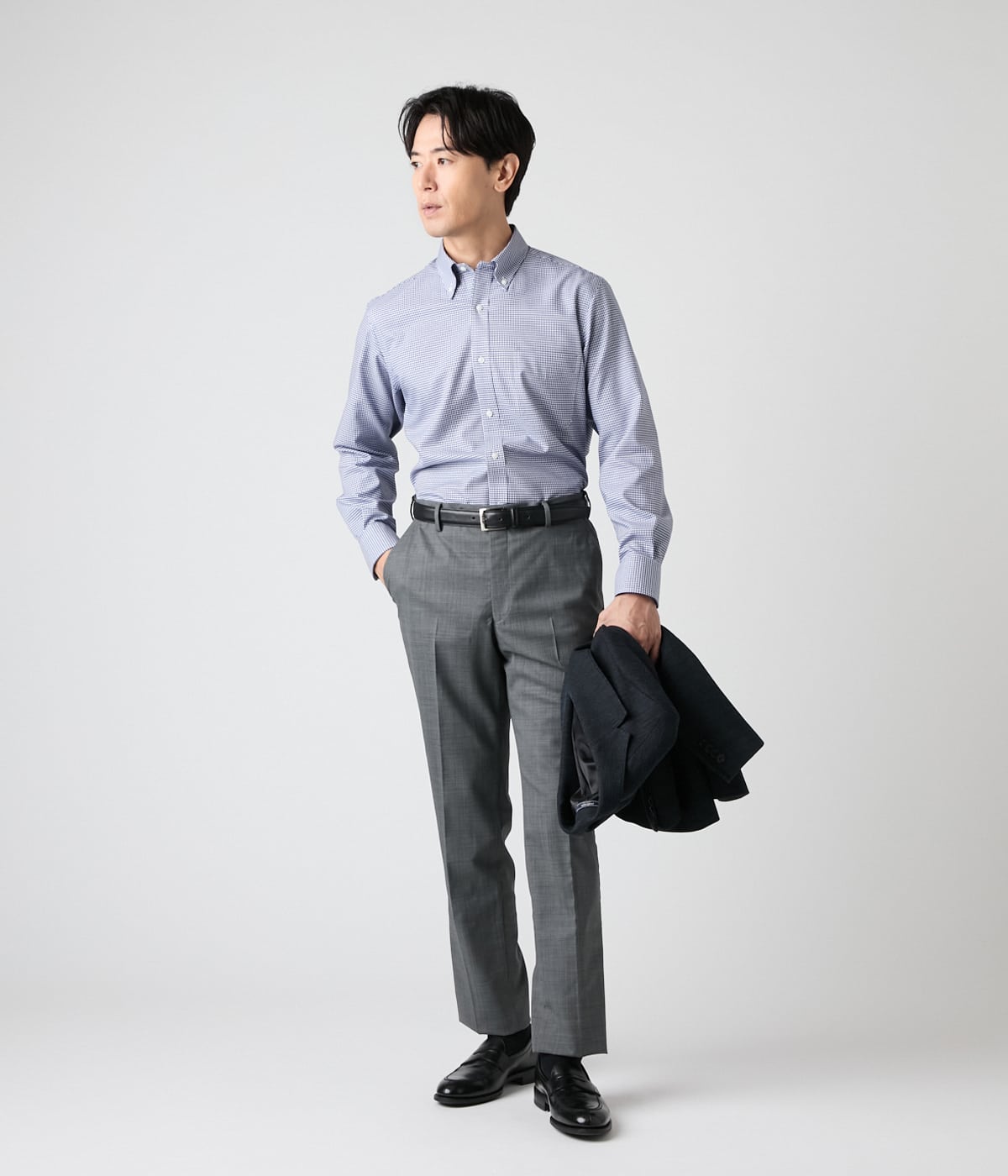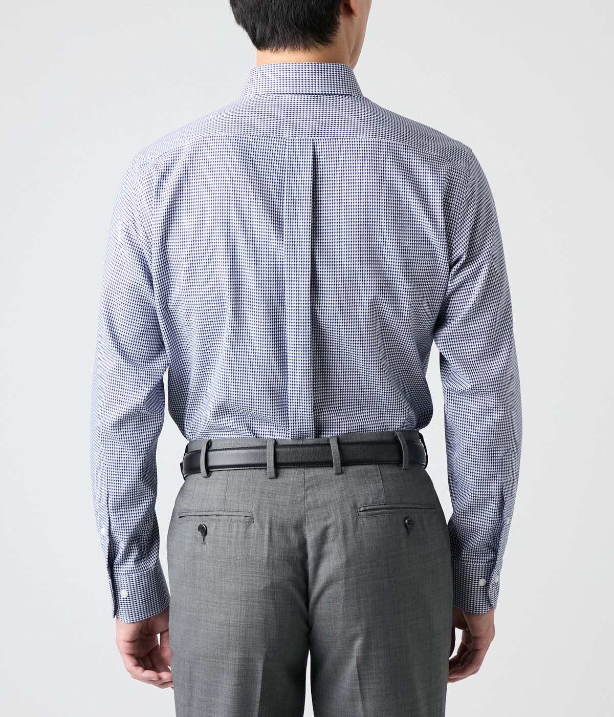 ホワイトをベースにネイビーのドビー小紋柄を配したボタンダウンシャツ。着こなしにアクセントを与え、オン・オフ兼用で着用可能です。タイドアップしたビジネススタイルから、ノーネクタイでのラフなスタイルまで、幅広い着こなしで活躍します。