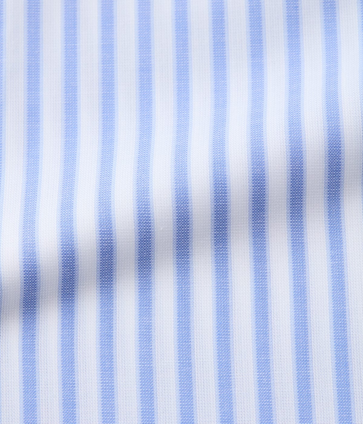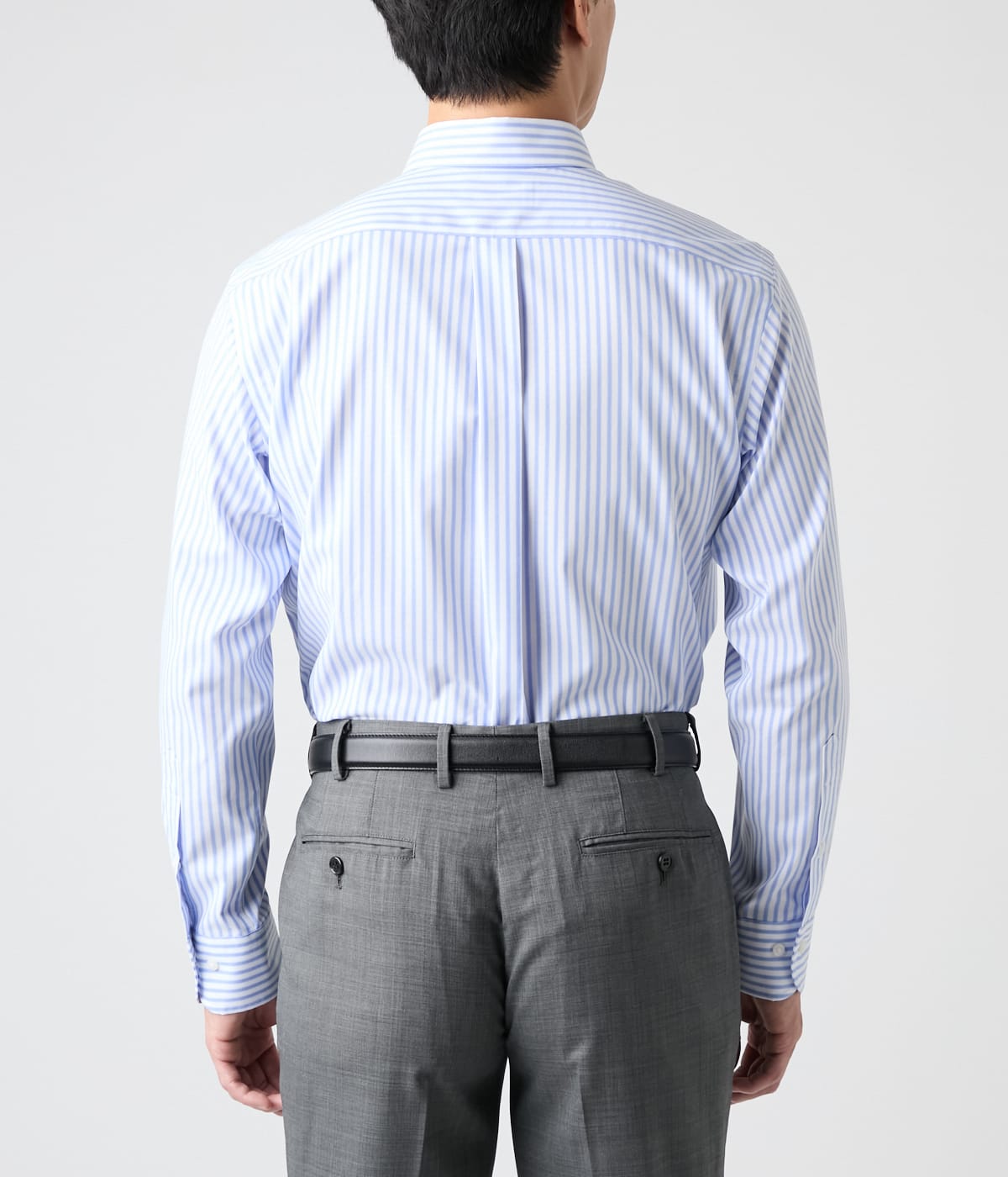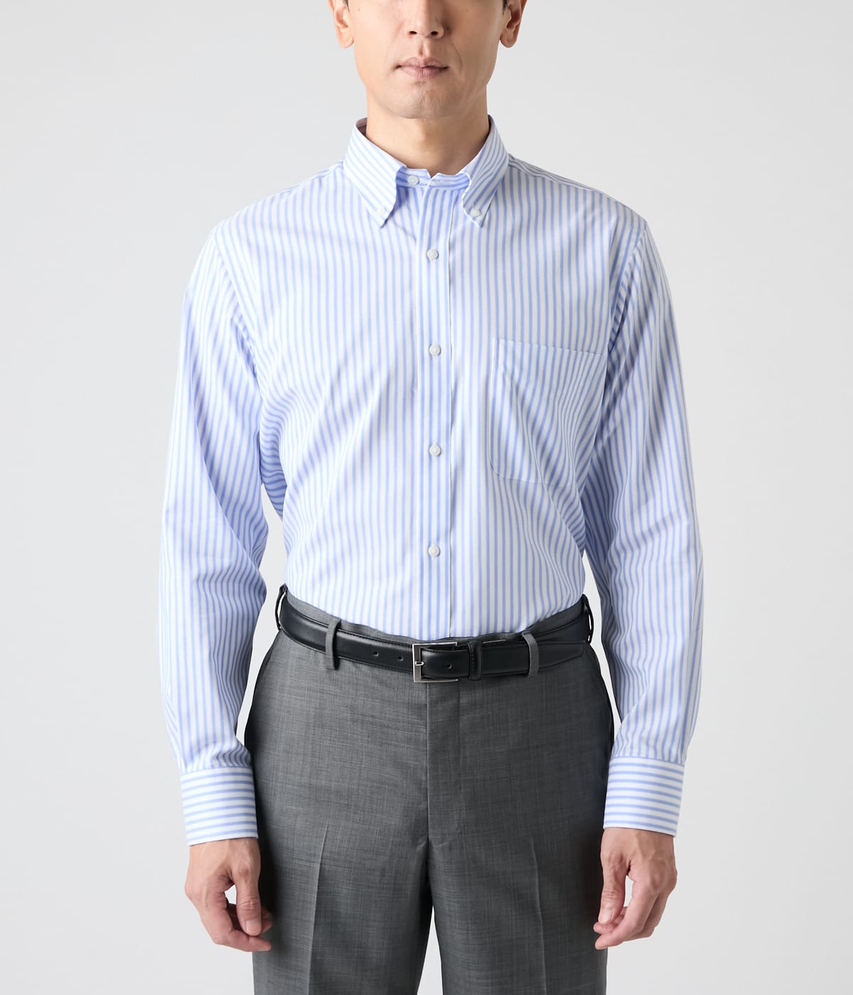 ホワイトをベースにブルー系のストライプで表現されたマルチストライプ柄ボタンダウンシャツ。タイドアップしたビジネススタイルから、ノーネクタイでのラフなスタイルまで、幅広い着こなしで活躍します。