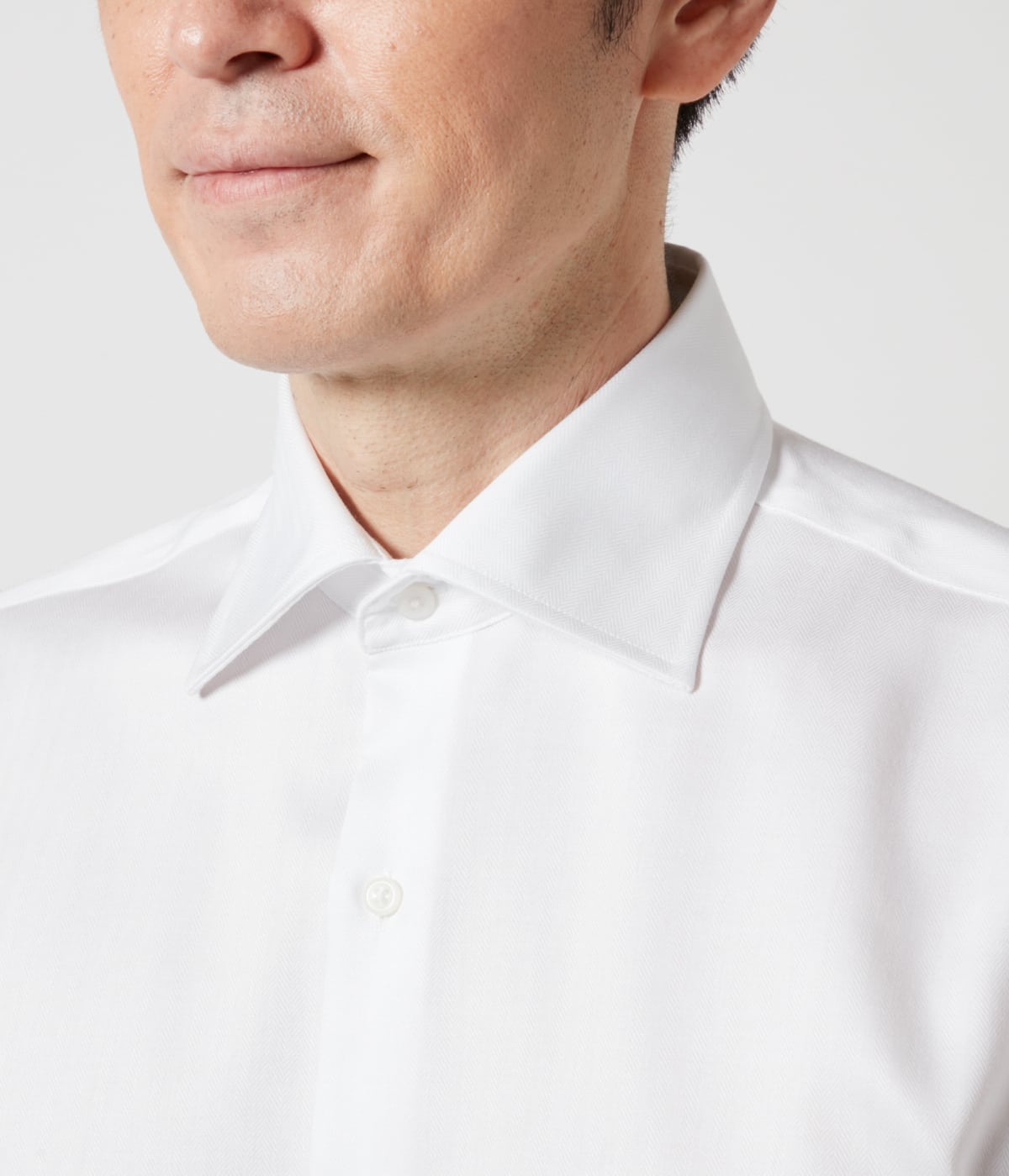 クラシカルな印象のヘリンボーン柄のワイドスプレッドカラーシャツ。ロングシーズン活躍するコットン100%素材で、スーツやジャケットのインナーとして活躍します。
