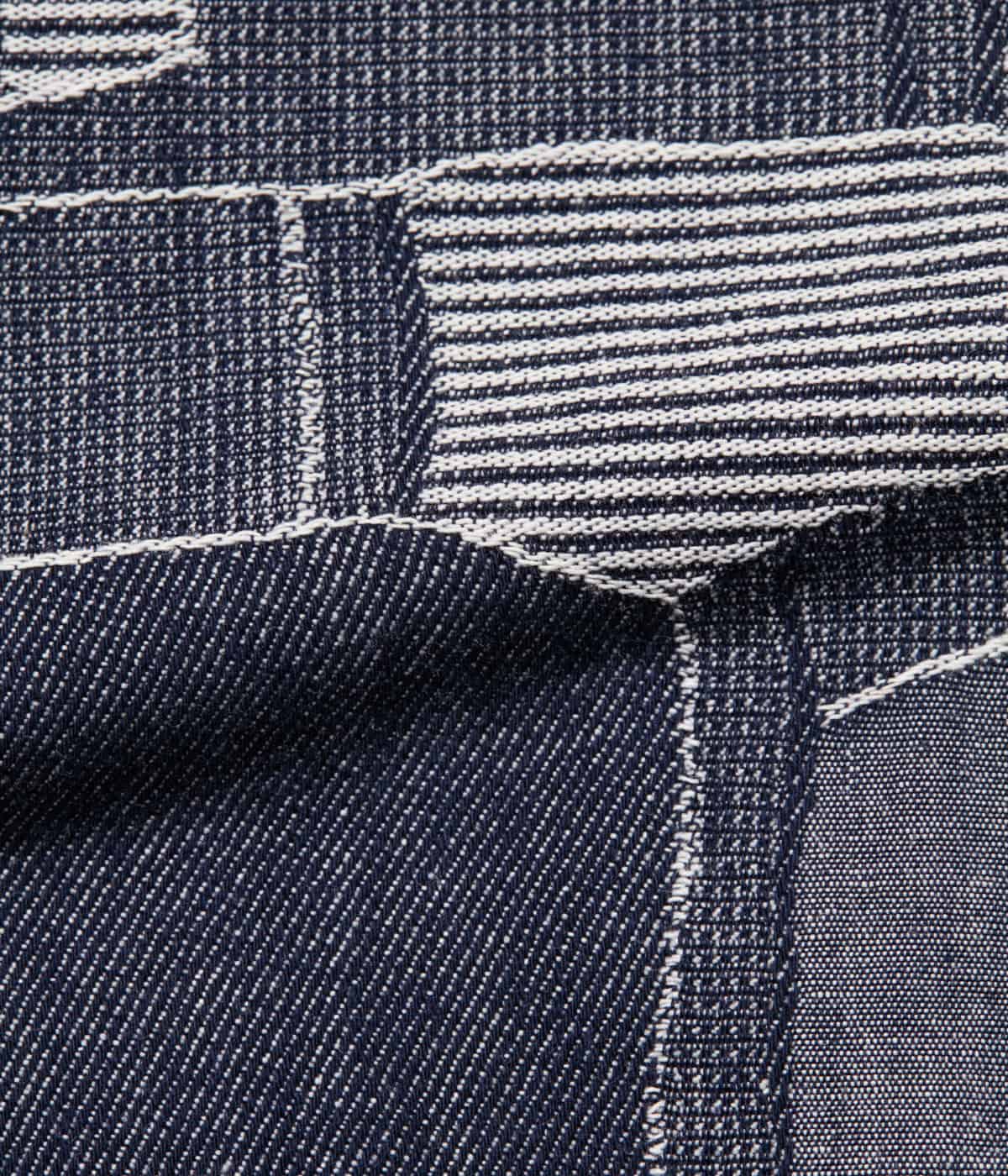 ジャカード織りで表現したパッチワーク風の七分袖カッタウェイカラーシャツ。インディゴデニム調のダンガリー生地は、洗いこむことで風合いが増し、経年変化が愉しめます。存在感のあるデザインなので、シャツを主役にシンプルなボトムスを合わせるコーディネートがおすすめです。