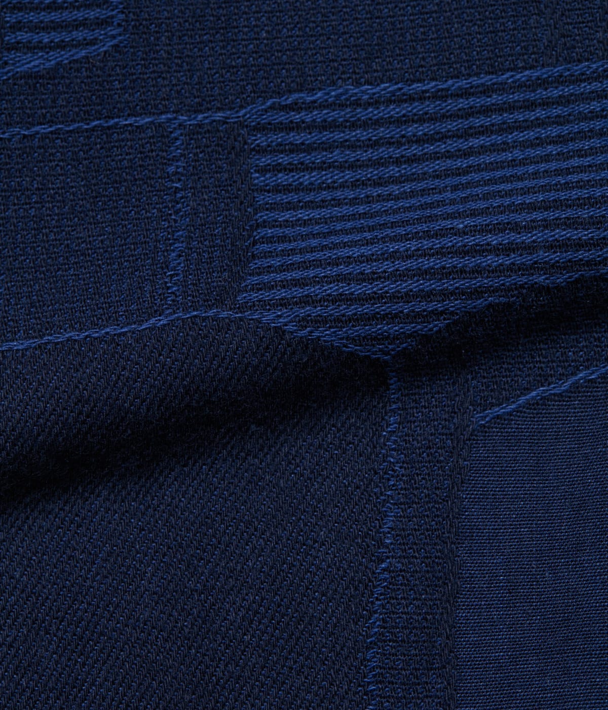 ネイビーの濃淡とジャカードでパッチワークのような柄を表現。シンプルなボトムスと合わせたコーディネートが、シャツのデザインを引き立たせてくれます。