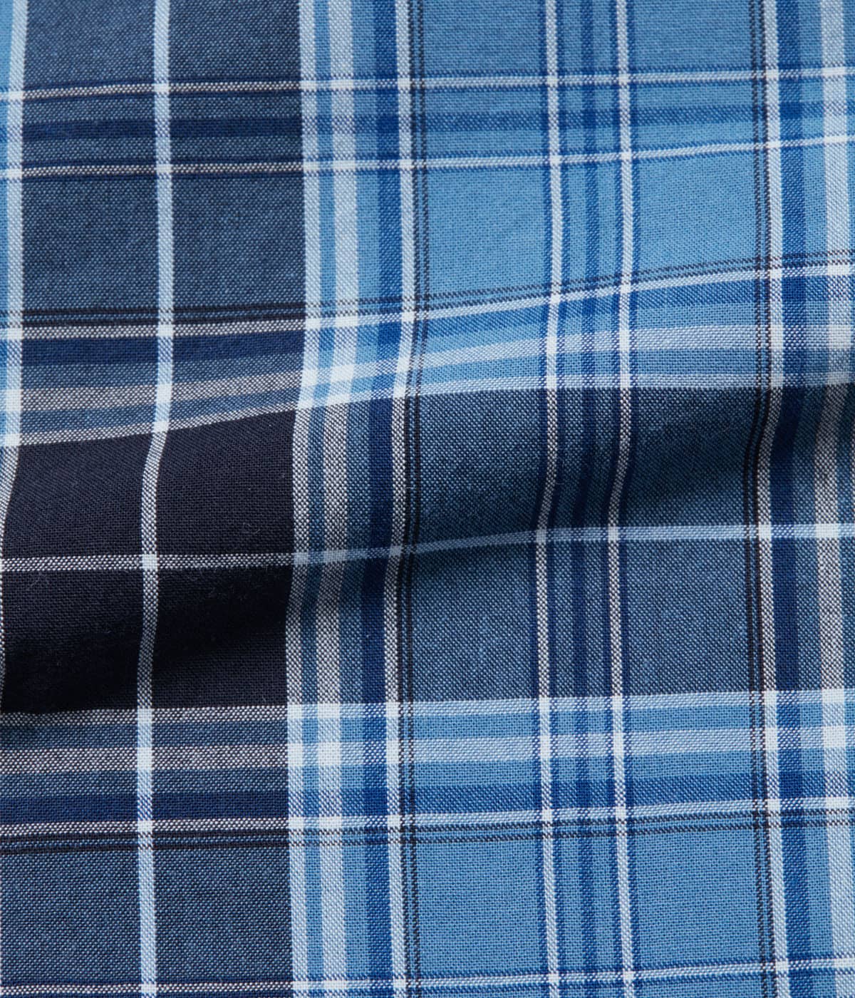 爽やかなブルー系のマルチカラーで構成されたビッグチェック柄の長袖ショートボタンダウンシャツ。自然なシワのあるナチュラルな風合いが愉しめるワッシャー加工を施しているので、ラフに着用いただける1枚です。また、洗いこむことで素材特有の表現が出て来るので経年変化を楽しめます。