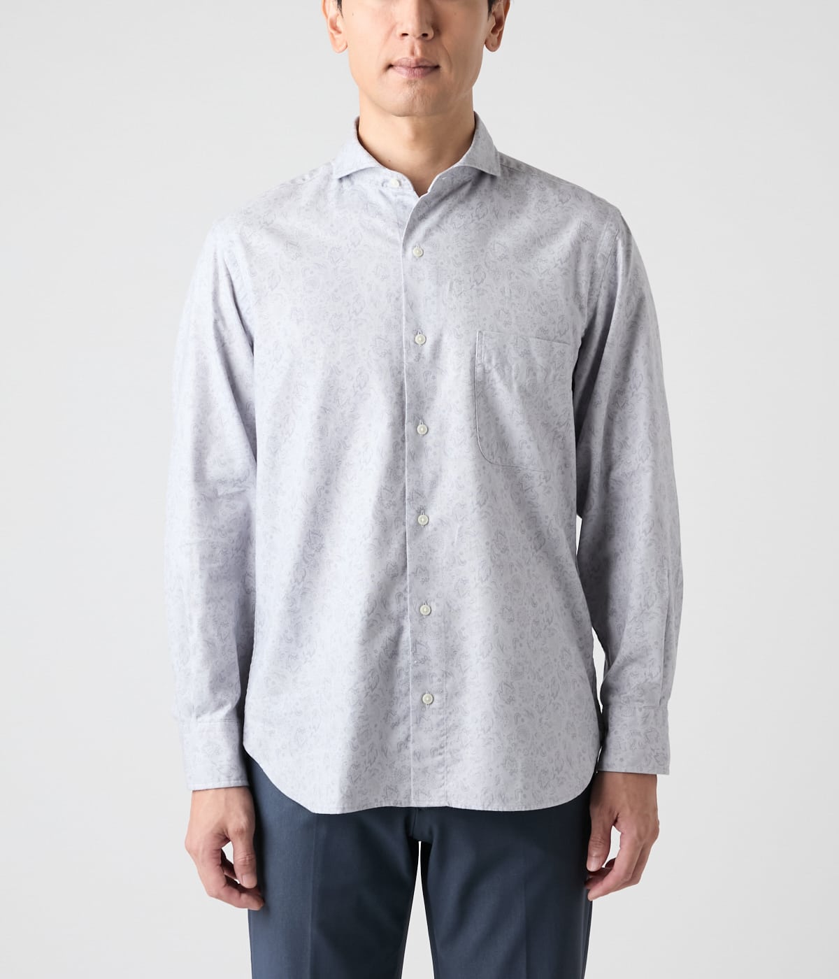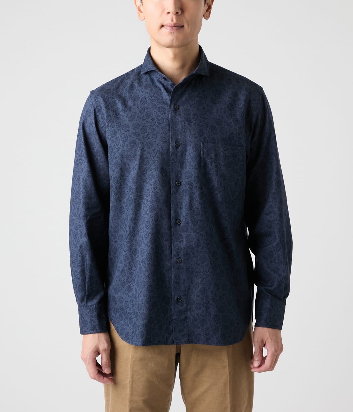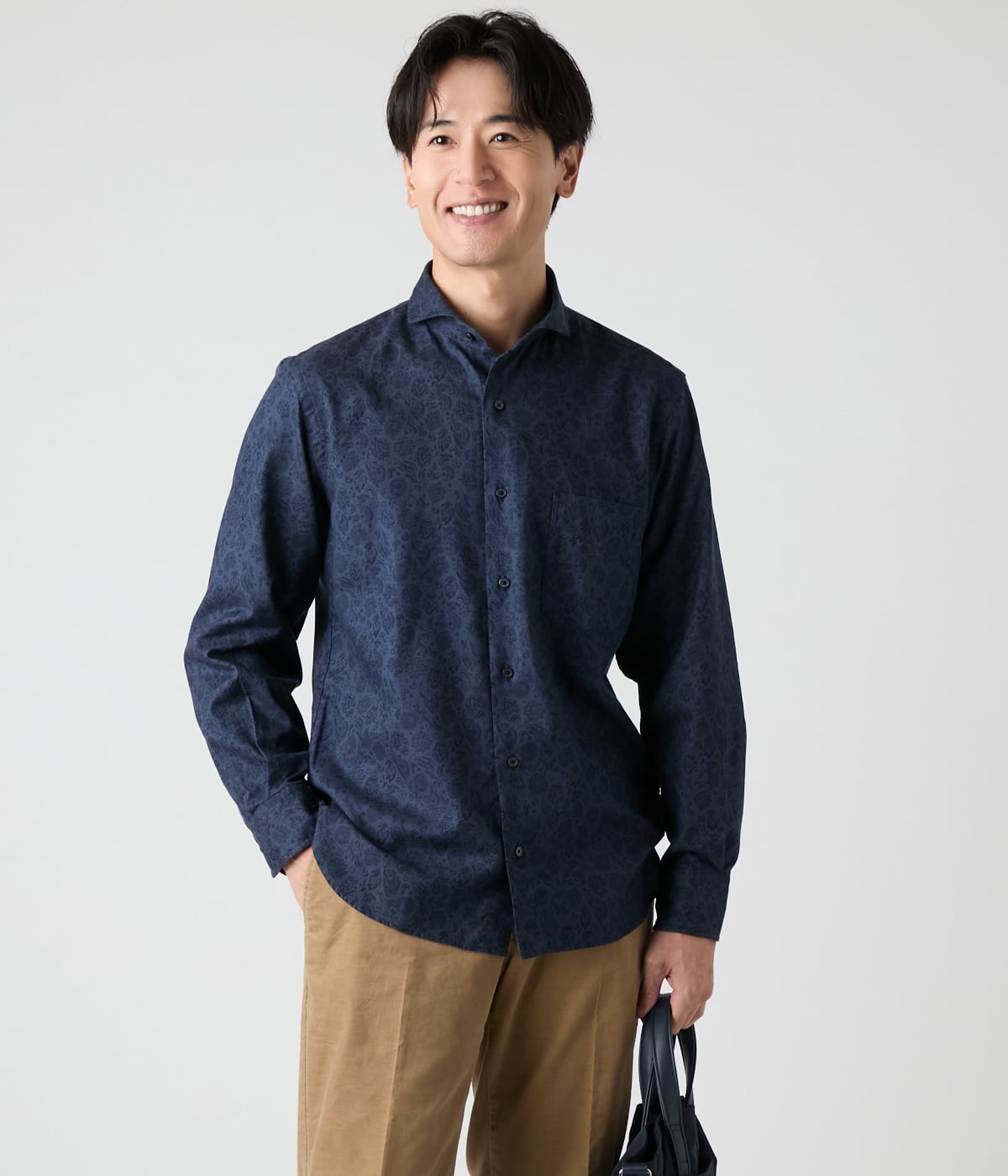 秋冬のコーディネートにモードなエッセンスを加える、フラワープリントの長袖カッタウェイカラーシャツ。線画調の花柄を落ち着いた配色でまとめ、甘さを抑えた大人のスタイルに仕上げています。ジャケットやカーディガンのインナーに合わせれば、都会的な抜け感を演出できます。