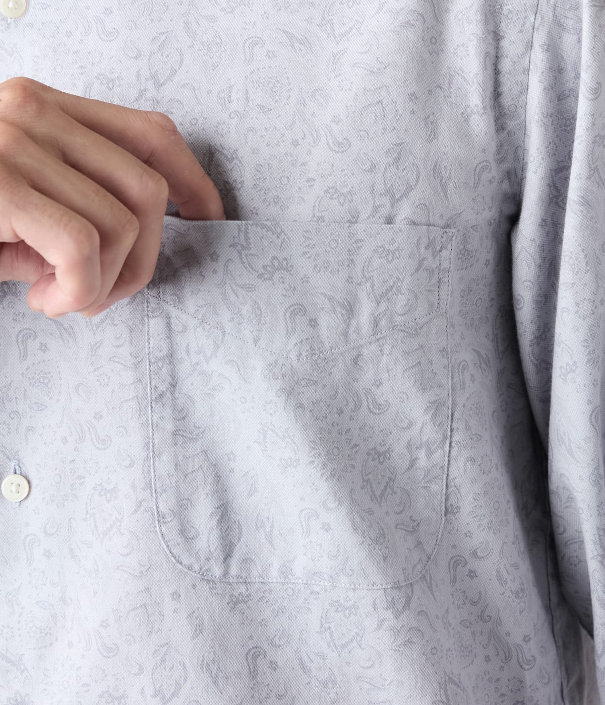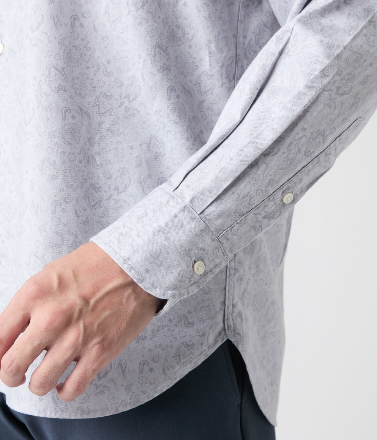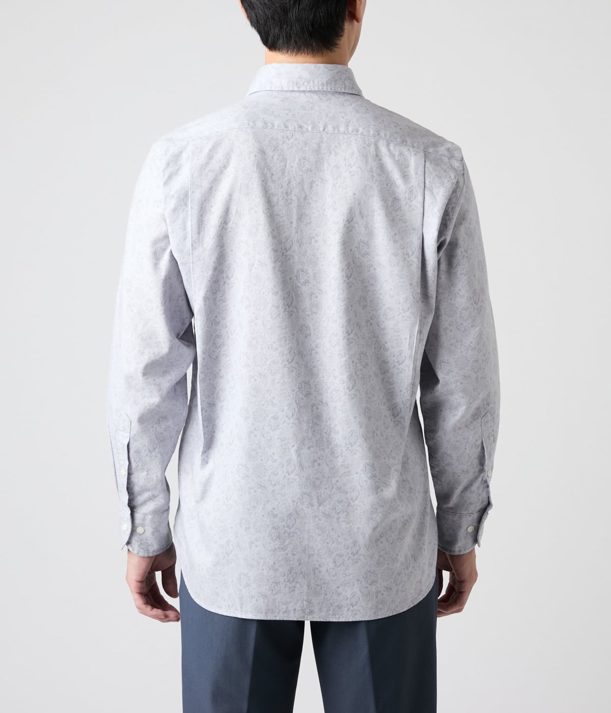 秋冬のコーディネートにモードなエッセンスを加える、フラワープリントの長袖カッタウェイカラーシャツ。線画調の花柄を落ち着いた配色でまとめ、甘さを抑えた大人のスタイルに仕上げています。ジャケットやカーディガンのインナーに合わせれば、都会的な抜け感を演出できます。