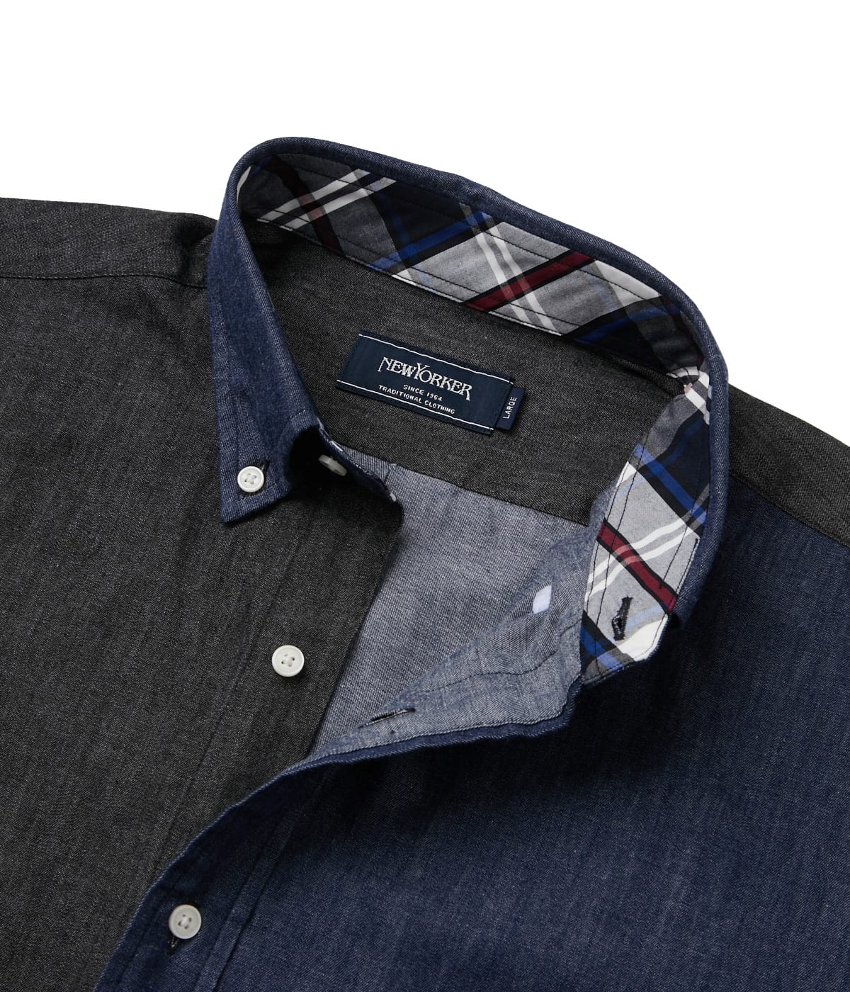 2色の生地を組み合わせたクレイジーパターンが特徴。製品洗いによるこなれた風合いと相まって、カジュアルスタイルに映える存在感のあるデザインです。ジャケットのインナーから、一枚着まで幅広く活躍します。