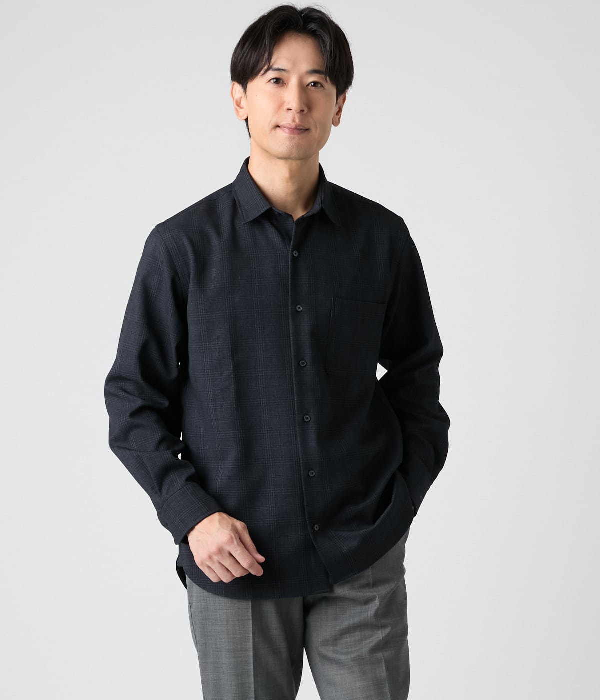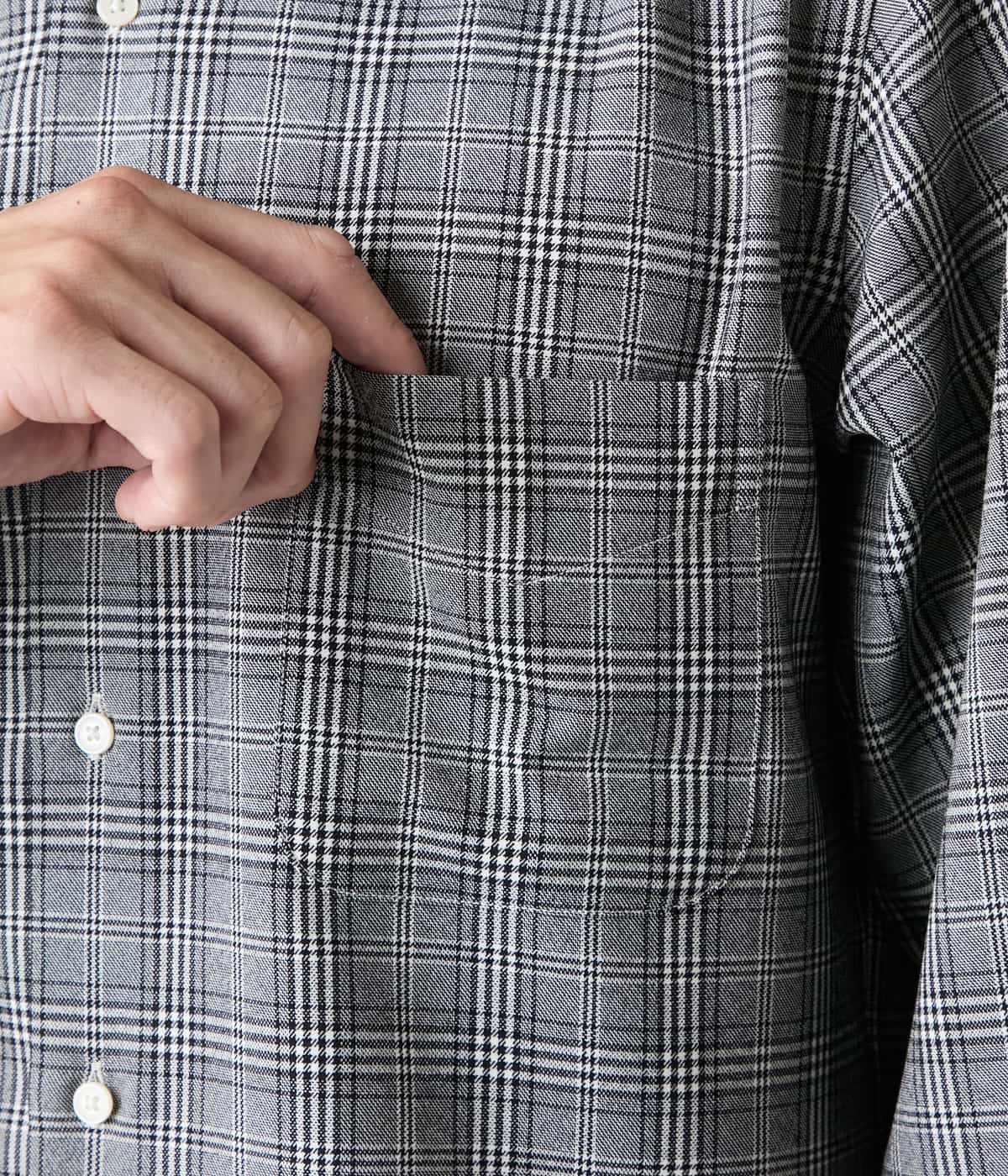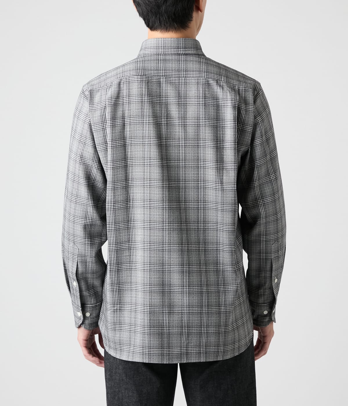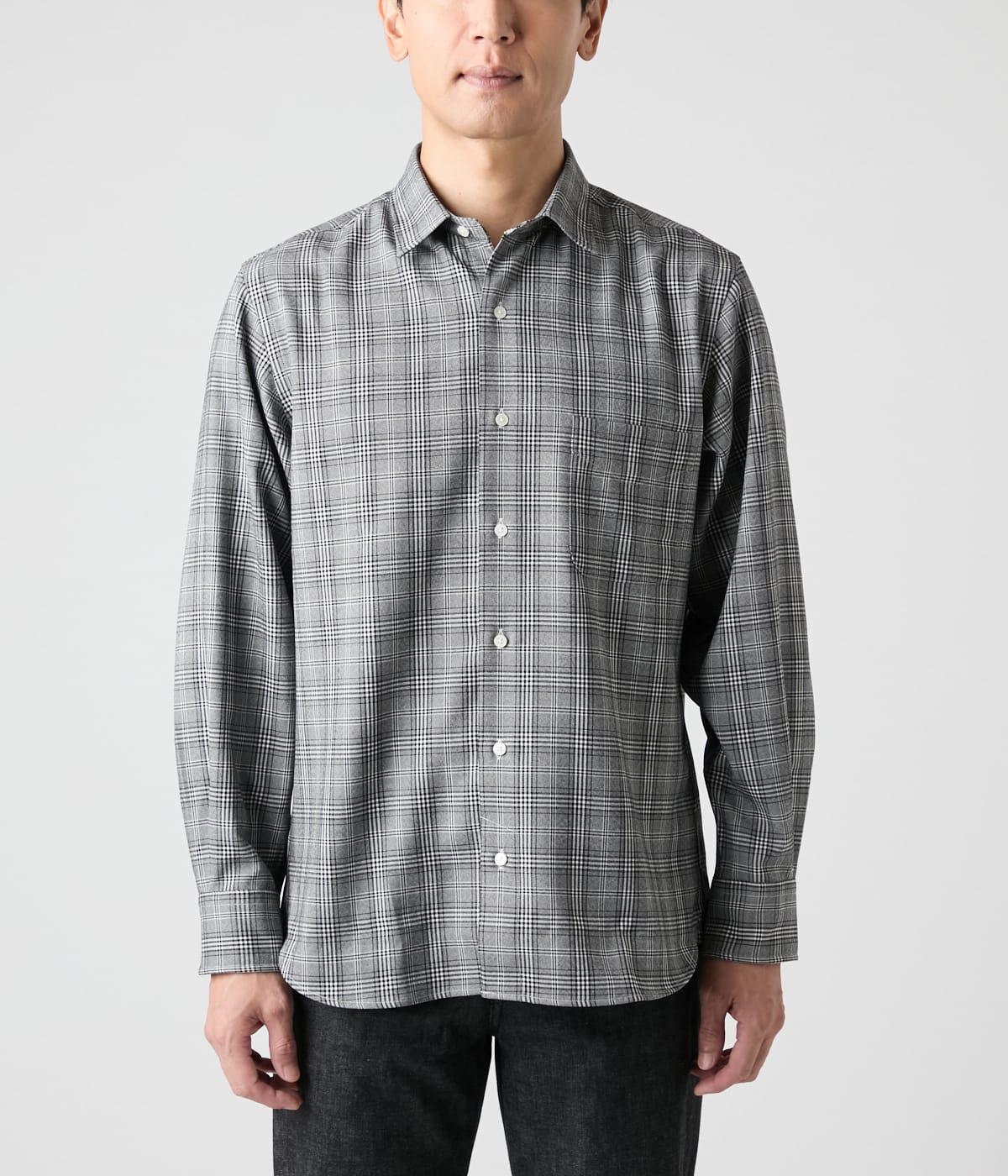 クラシカルな印象のグレンチェック柄を採用した長袖ショートポイントカラーシャツ。高機能素材「LANATEC」を使用し、カチオンミックス糸によりウールのような温かみを表現しつつ、軽やかで扱いやすい素材感に仕上げています。単品での着用はもちろん、アウターやニットのインナーとしても幅広く活躍します。