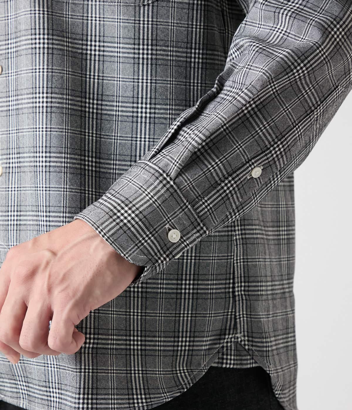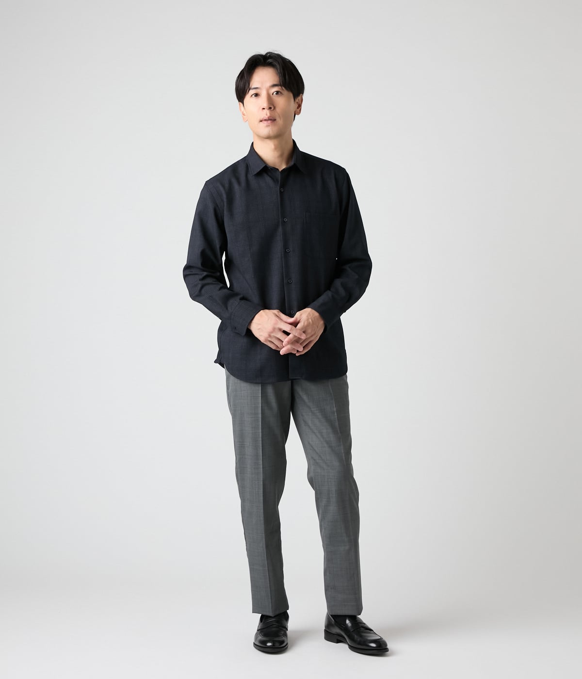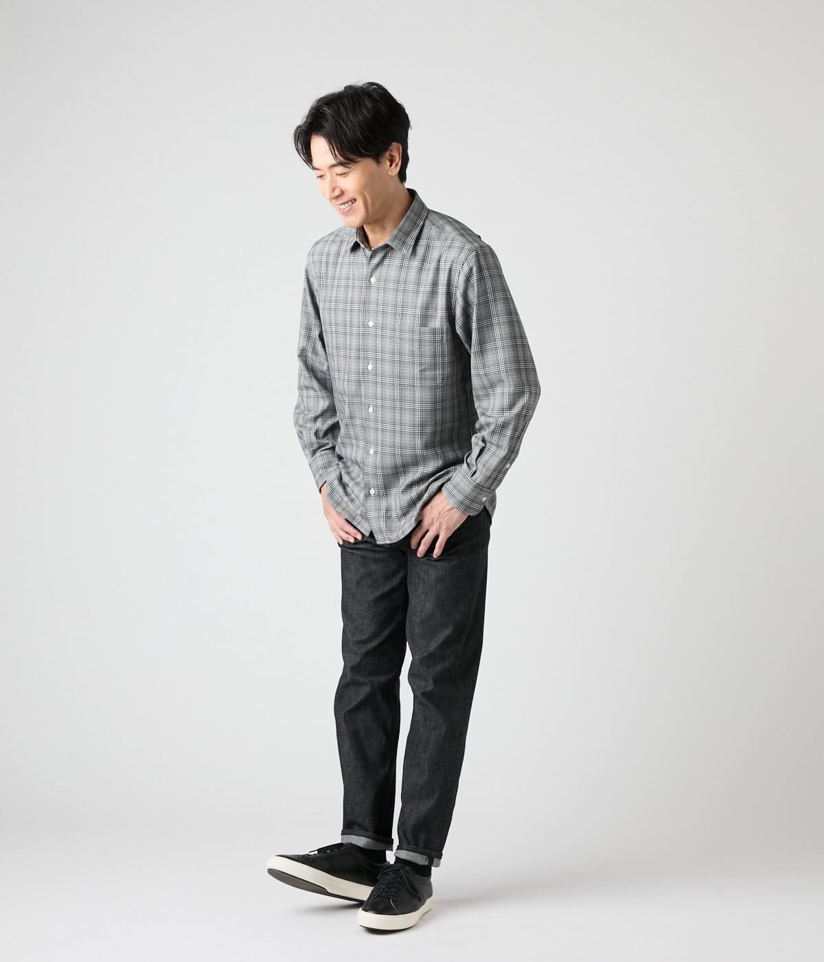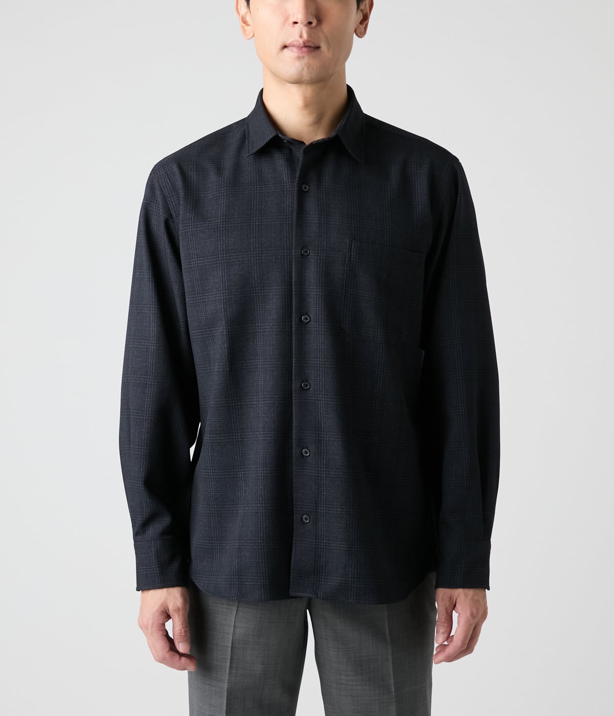 クラシカルな印象のグレンチェック柄を採用した長袖ショートポイントカラーシャツ。高機能素材「LANATEC」を使用し、カチオンミックス糸によりウールのような温かみを表現しつつ、軽やかで扱いやすい素材感に仕上げています。単品での着用はもちろん、アウターやニットのインナーとしても幅広く活躍します。