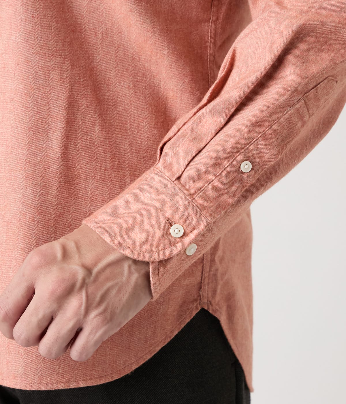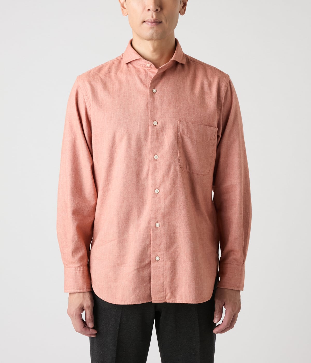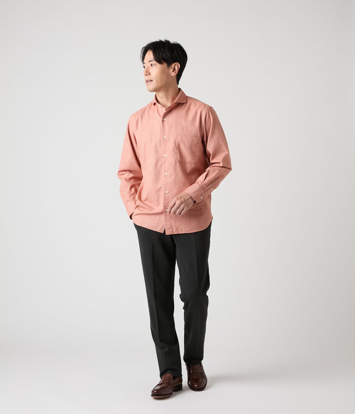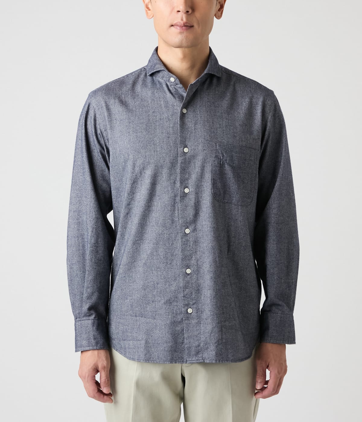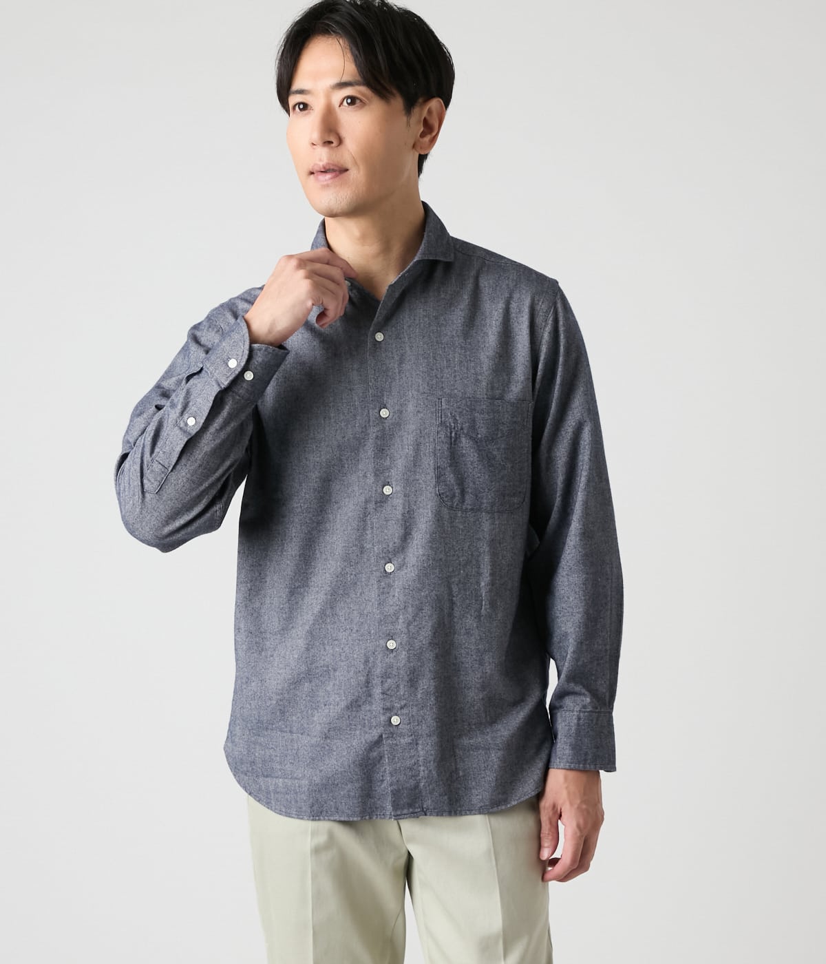 メランジ(霜降り調)をベースにシャドーストライプを織り込んだ長袖カッタウェイカラーシャツ。メランジ特有の奥行きのある色味と高級感のある表情で、秋冬の季節感を演出。単品使いはもちろんジャケットやアウターのインナーとしても活躍します。