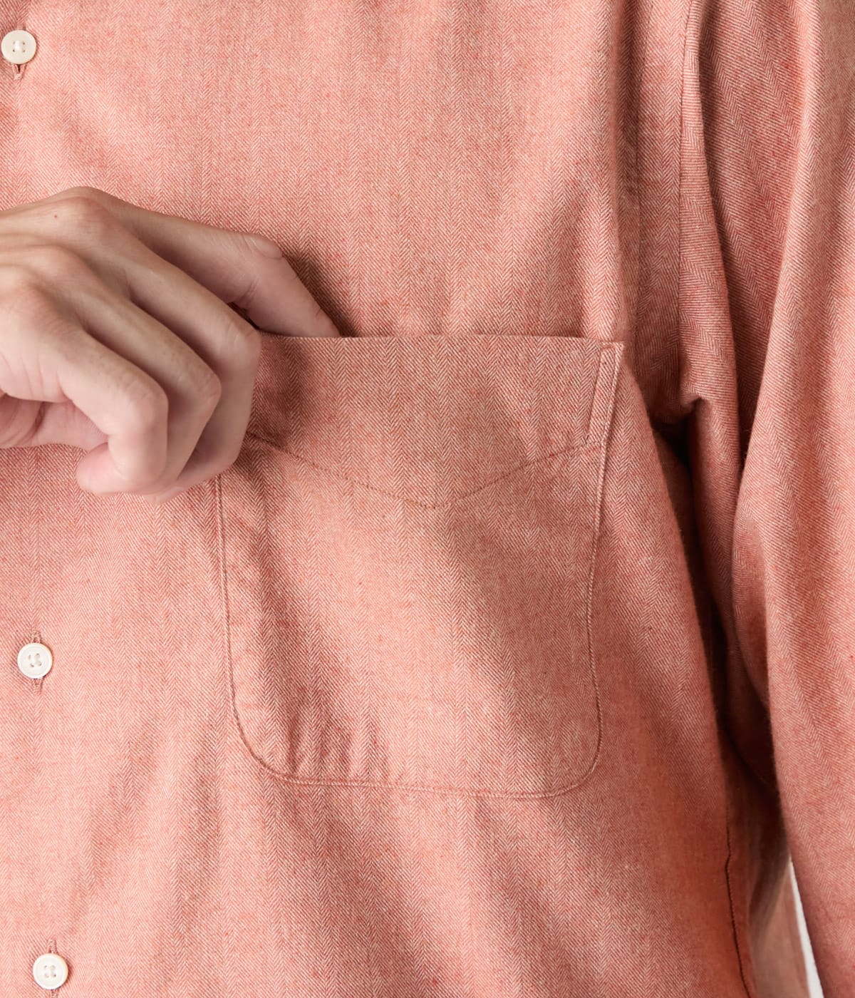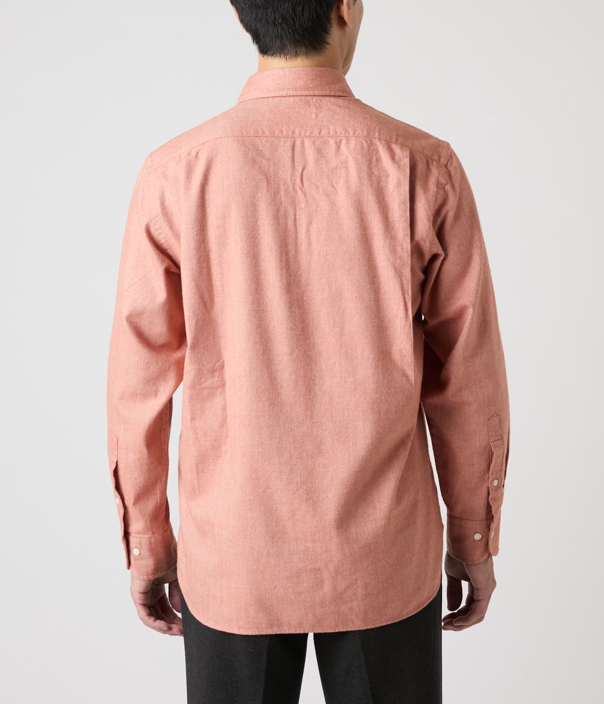 1枚でもインナーでも洒落感のあるカッタウェイカラーシャツは、通常のボタンダウンシャツとは違い、背のタック、裏前立仕様になっており着こなしが上品に見えるのが特徴です。裾は、ボトムイン・アウトのどちらでも着こなせる着丈になっており、丸みのあるカーブが特徴です。