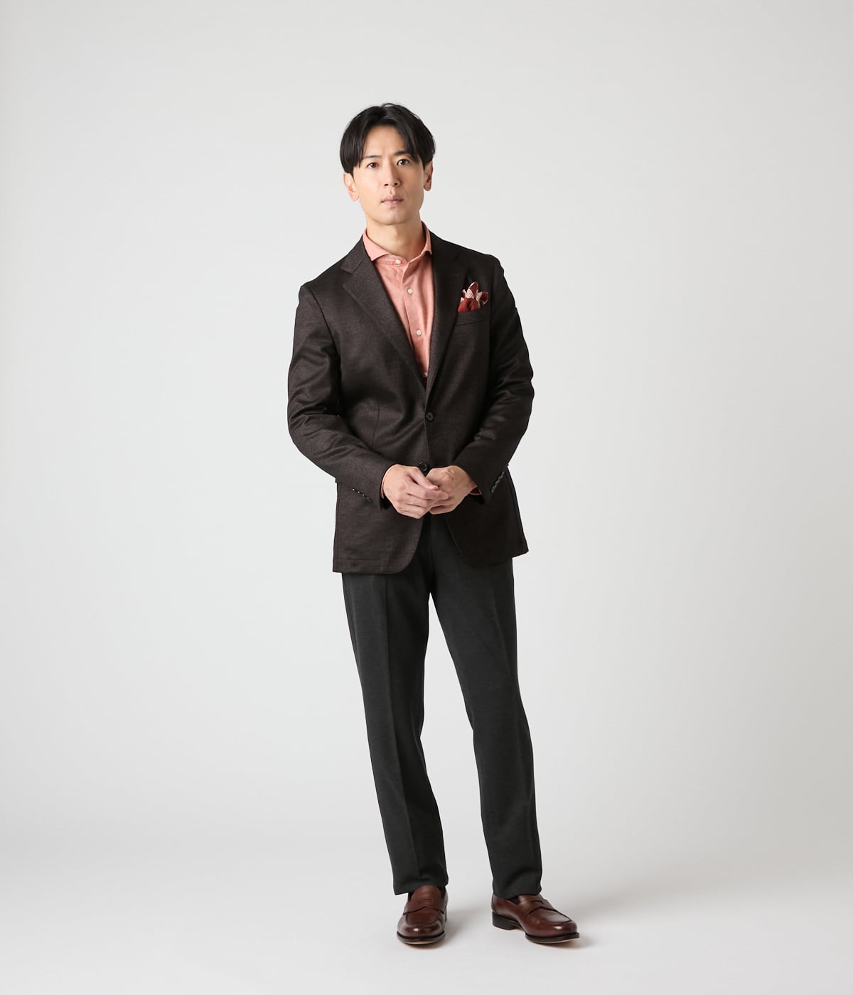 メランジ調の生地にシャドーストライプの繊細な織り柄が上品なアクセントとなるデザイン。
