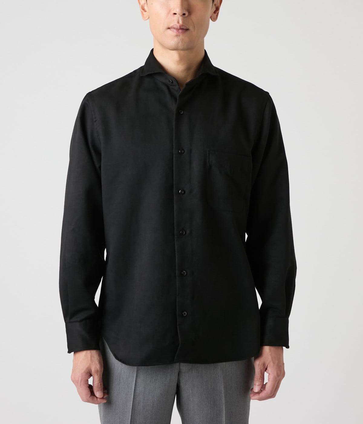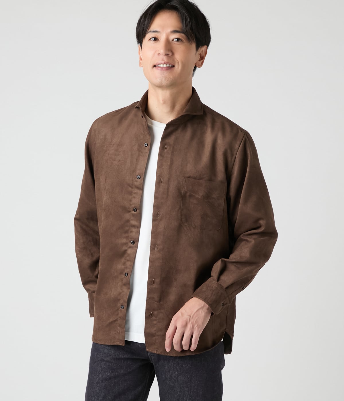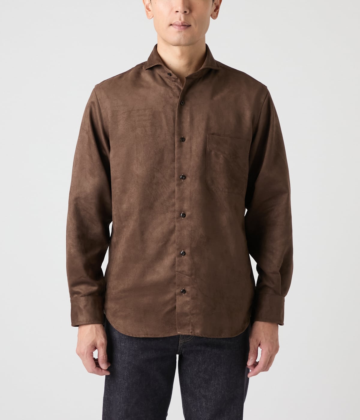 微細な起毛感でしっとりとした手触りのマイクロスエード素材を使用した長袖カッタウェイカラーシャツ。単品でも存在感があり、秋冬のジャケットやツィードとのレイヤードすることで季節感のあるコーディネートになります。