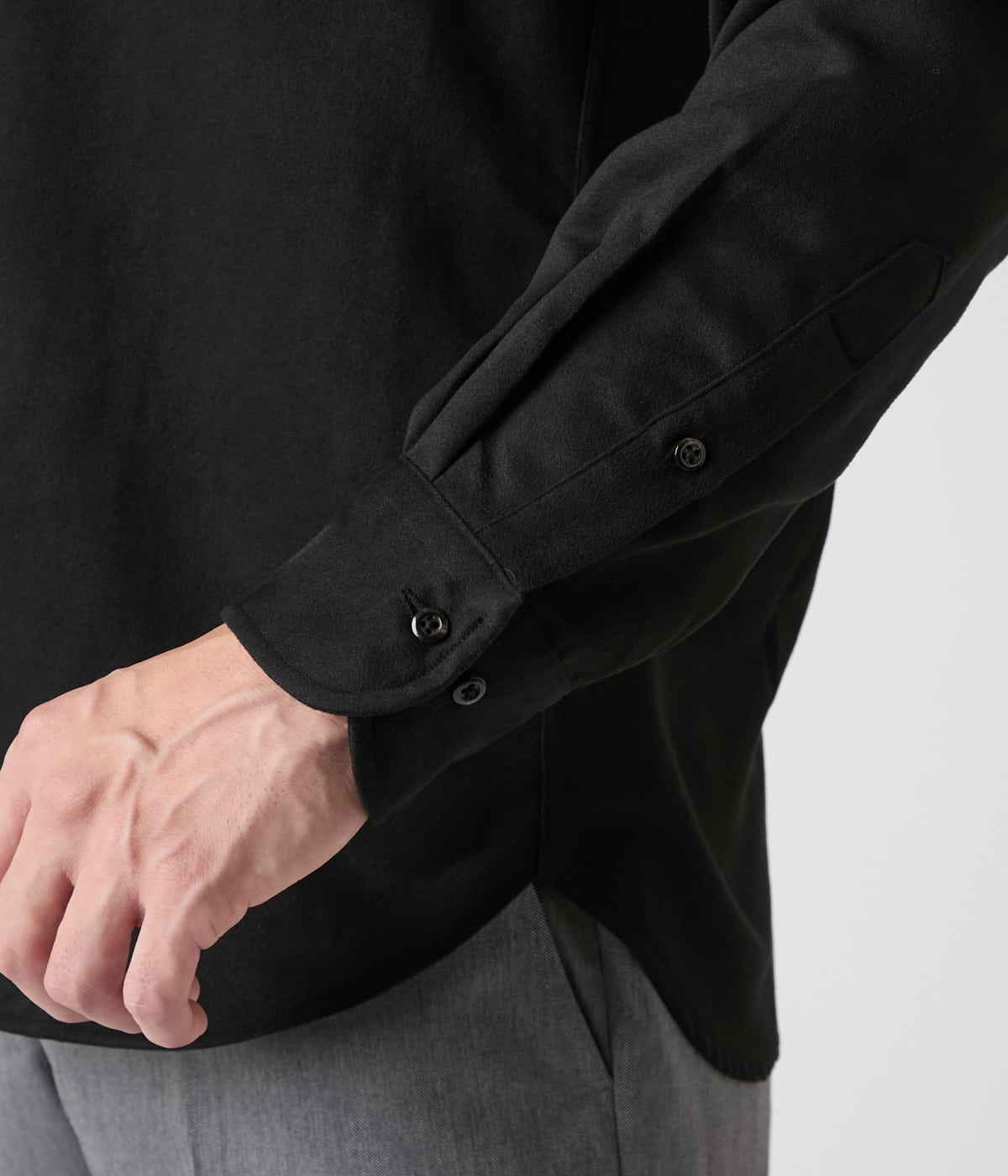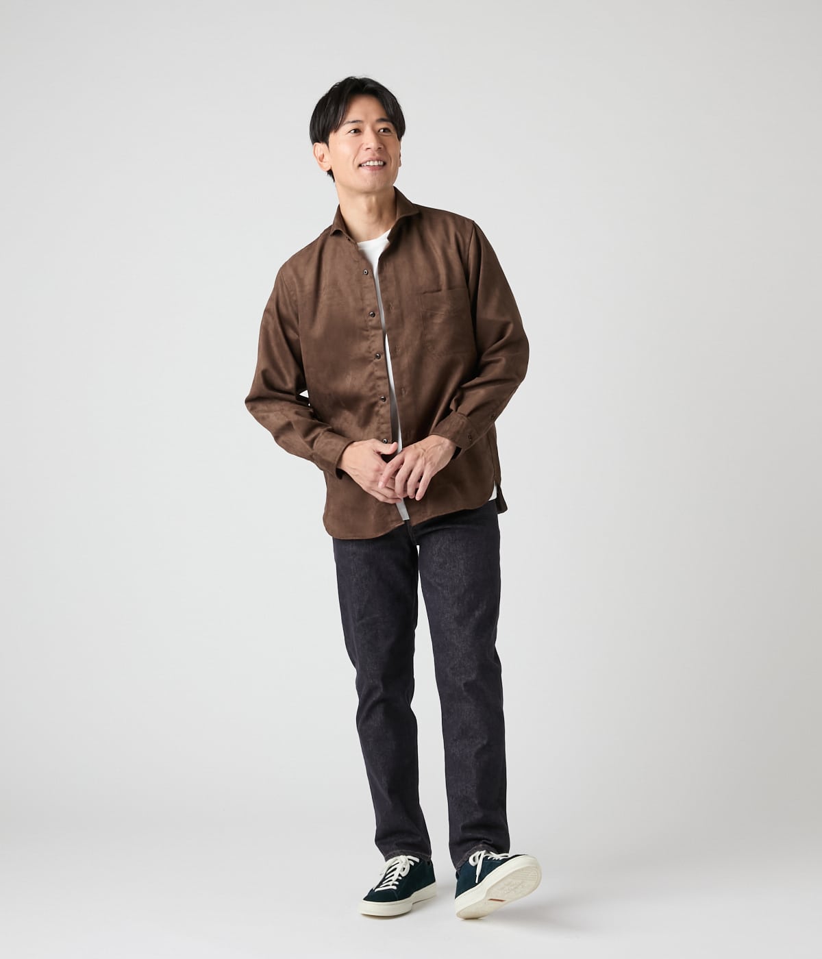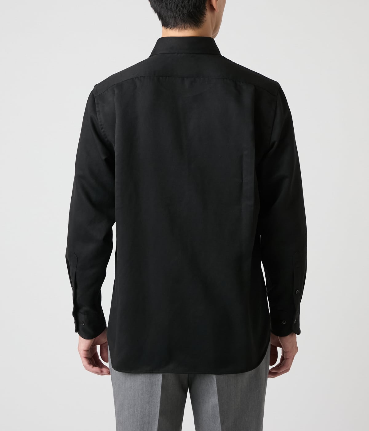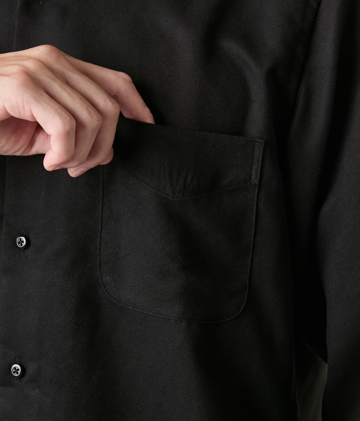 微細な起毛感でしっとりとした手触りのマイクロスエード素材を使用した長袖カッタウェイカラーシャツ。単品でも存在感があり、秋冬のジャケットやツィードとのレイヤードすることで季節感のあるコーディネートになります。