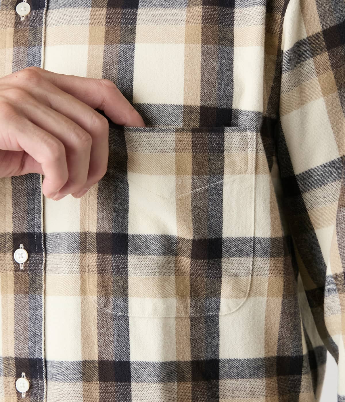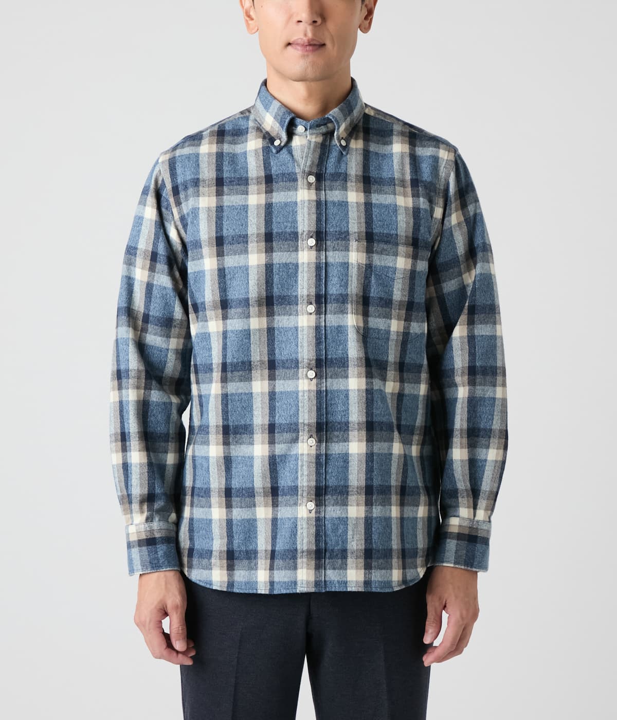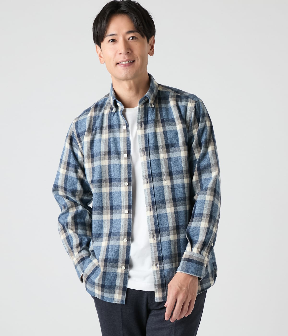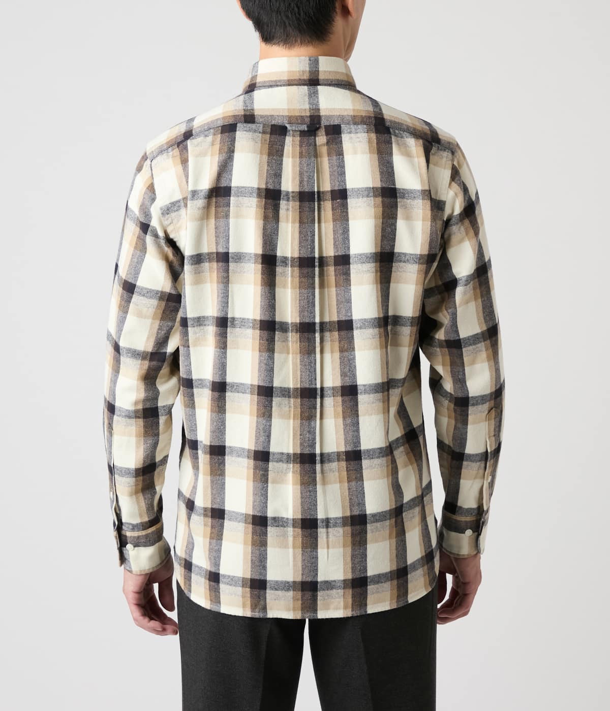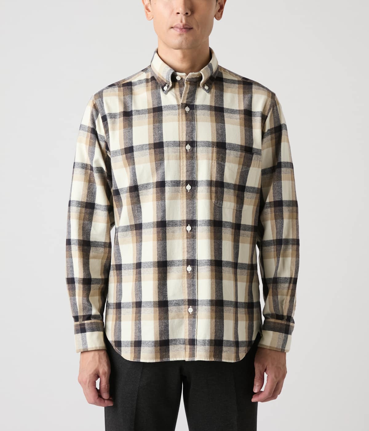 存在感のある杢糸を取り入れた大柄のチェックを使用した長袖ショートボタンダウンシャツ。起毛による膨らみのあるしっかりとした風合いで、単品やTシャツに羽織った着用はもちろん、アウターやニットのインナーとしても活躍します。