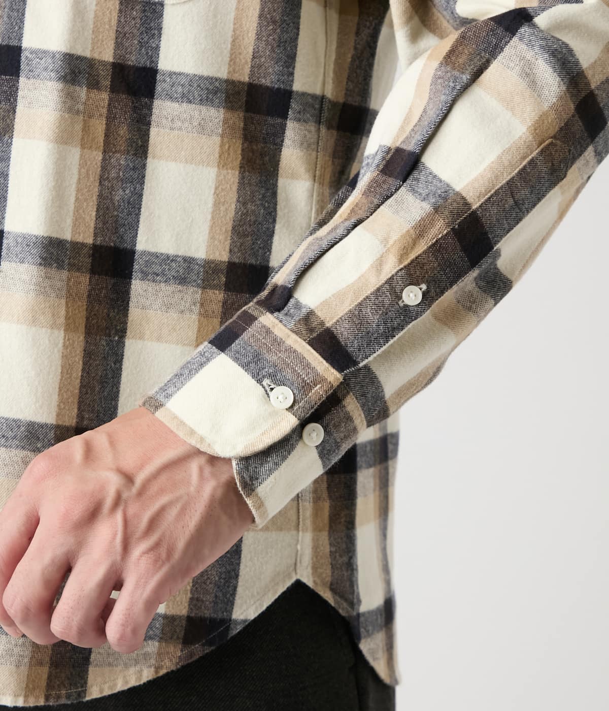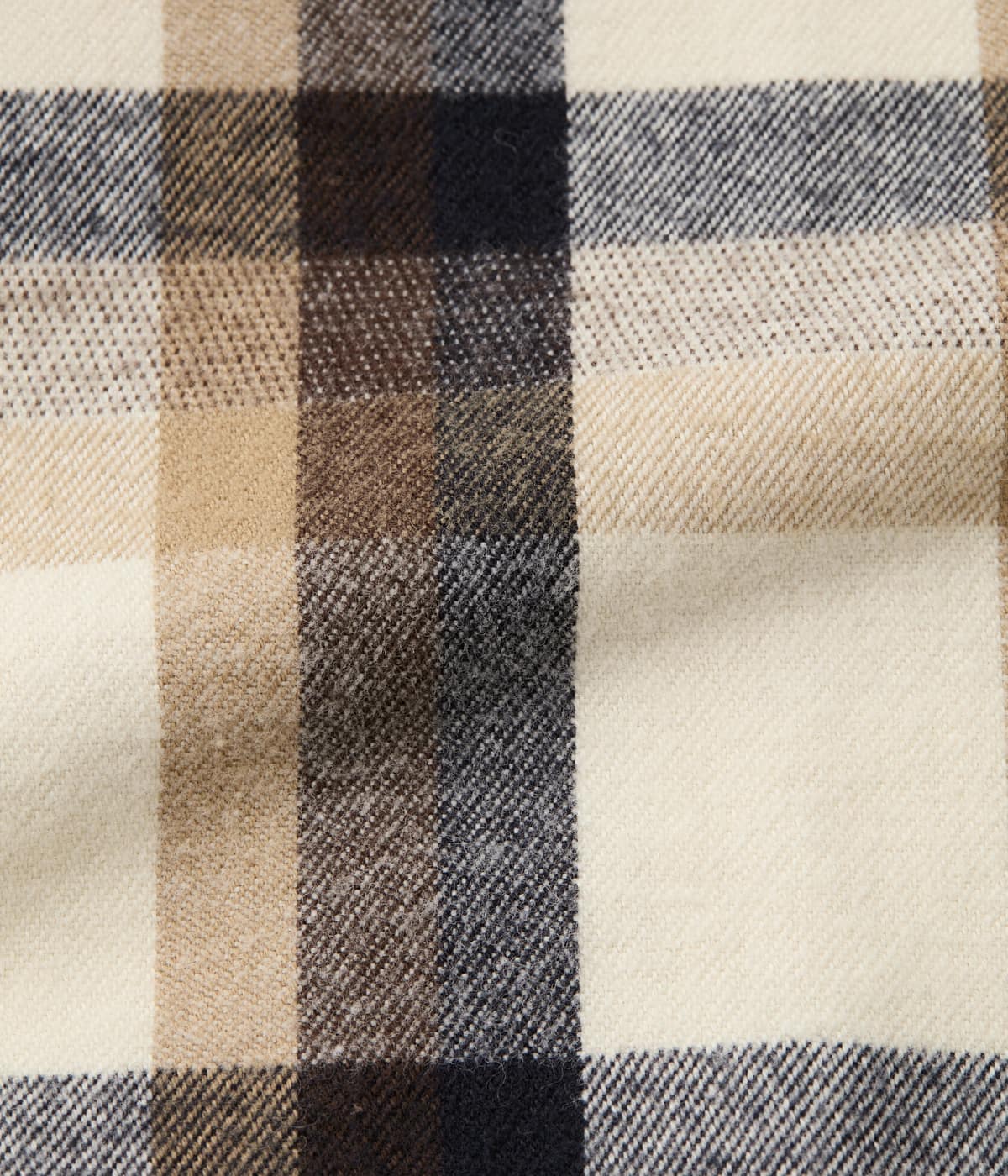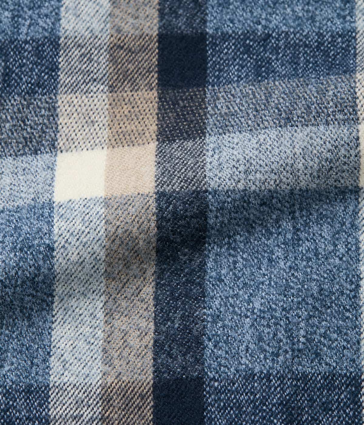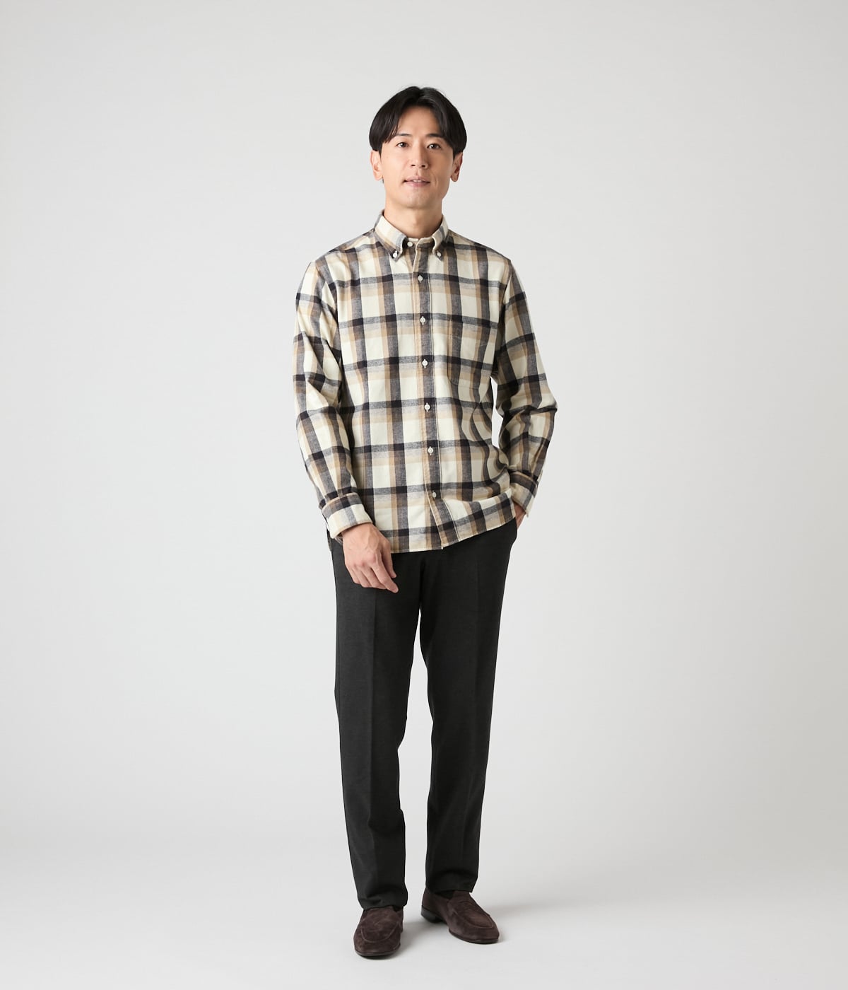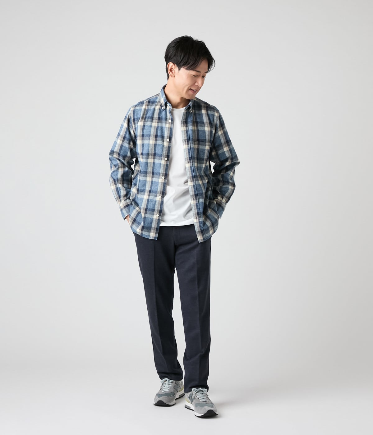 存在感のある杢糸を取り入れた大柄のチェックを使用した長袖ショートボタンダウンシャツ。起毛による膨らみのあるしっかりとした風合いで、単品やTシャツに羽織った着用はもちろん、アウターやニットのインナーとしても活躍します。