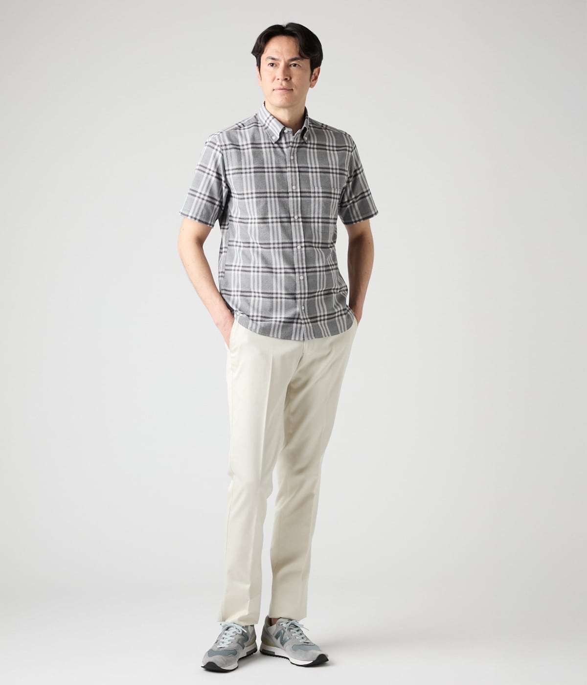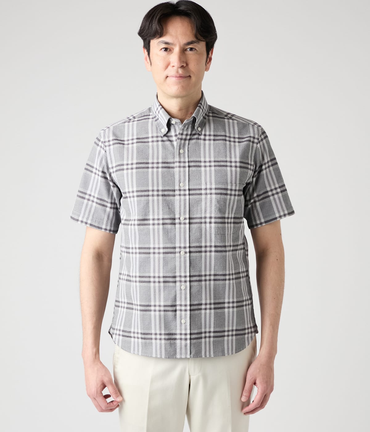 シックな印象のモノトーンチェック柄の半袖ショートボタンダウンシャツ。表面の凹凸感が肌に触れる面積を減らすことで肌離れを良くするサッカー生地は、汗ばむ季節でも快適に過ごせる1枚です。存在感のあるシャツには、シンプルなパンツを合わせトップスを引き立てるスタイリングがおすすめです。