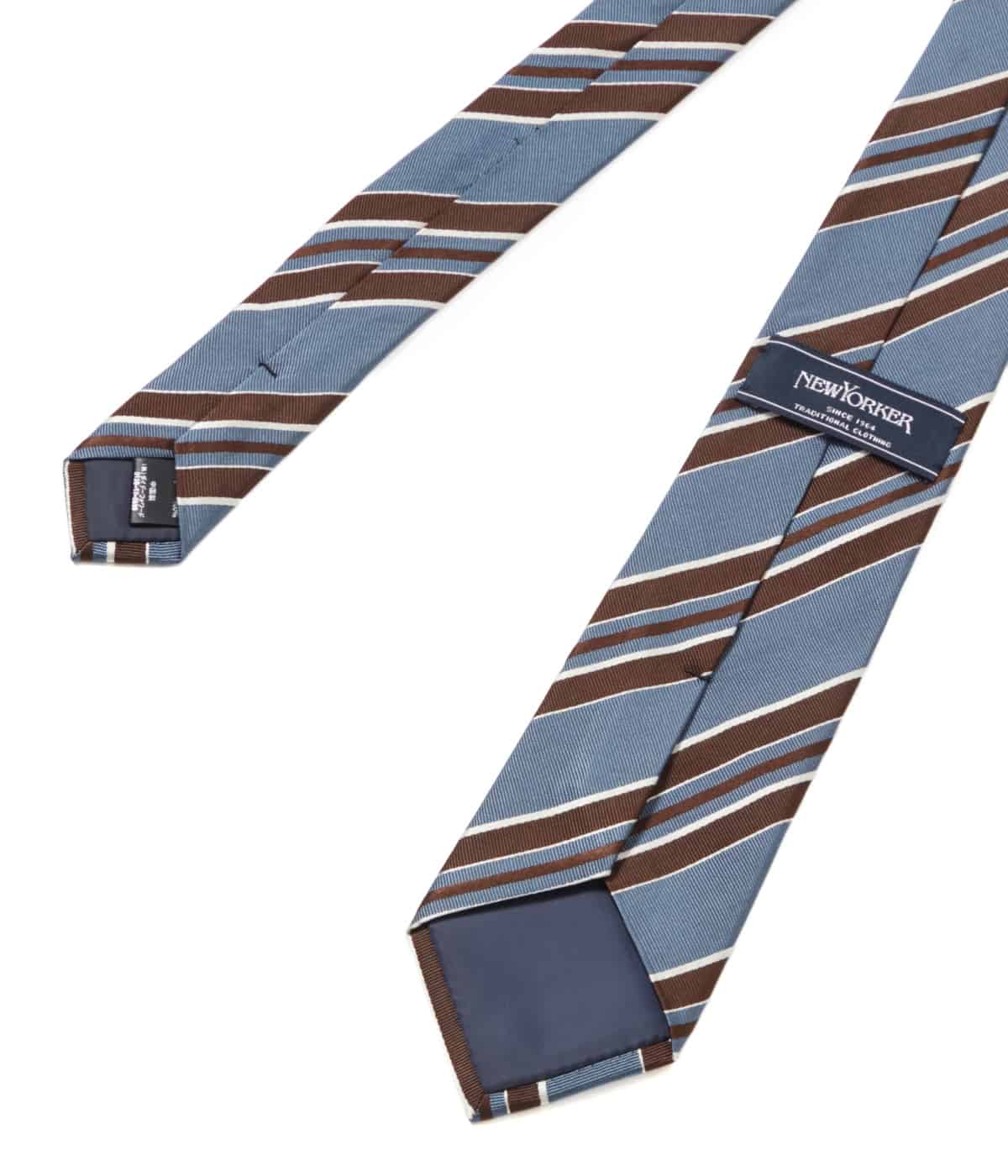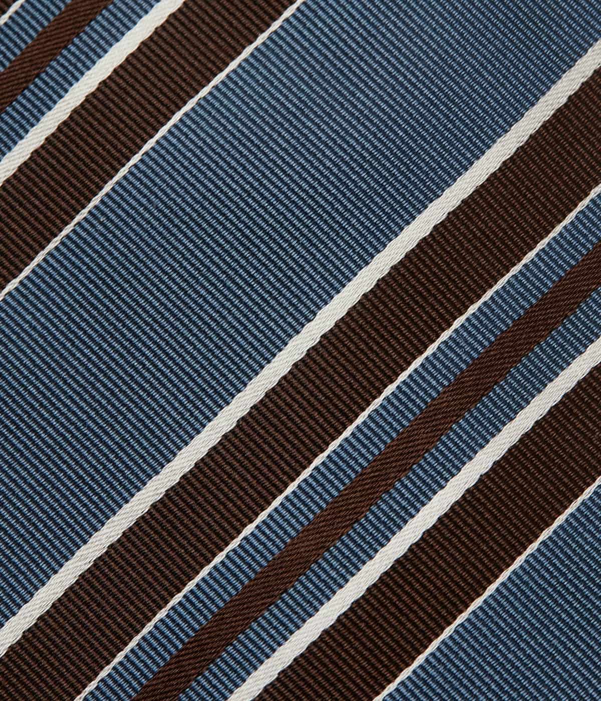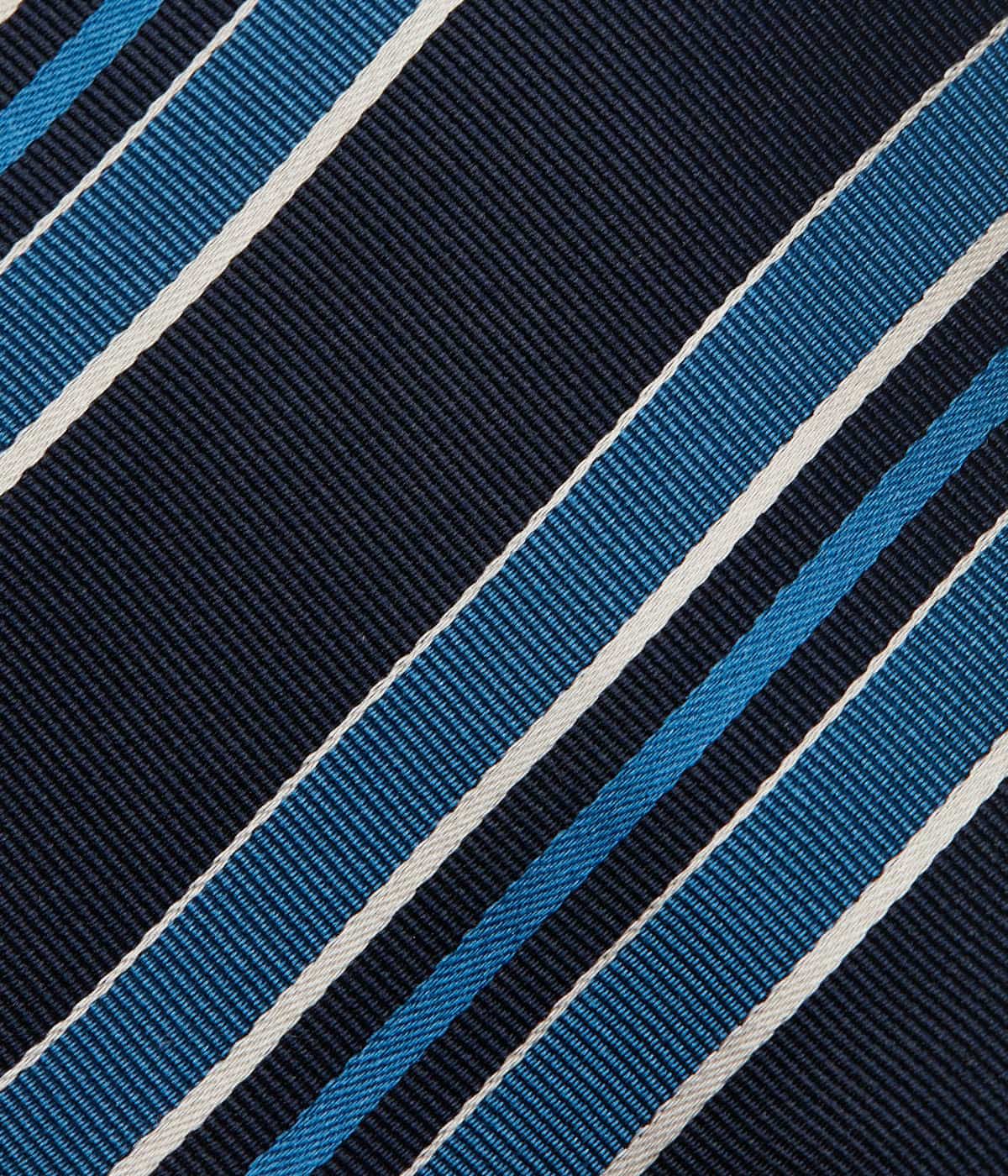 異なるカラー、ピッチのラインで構成されたオルタネイトストライプ柄のネクタイ。はっきりした配色が存在感のあるコーディネートを演出します。