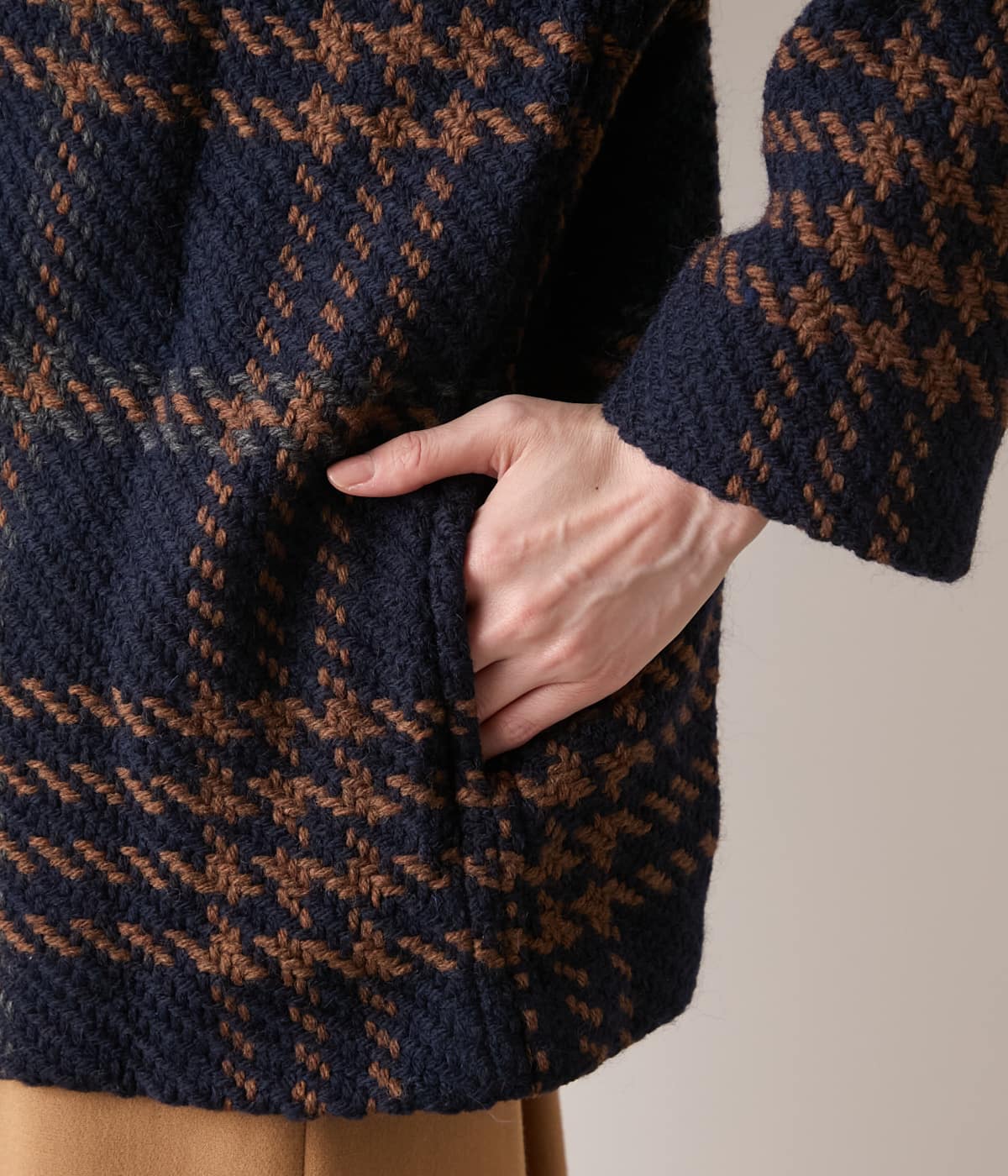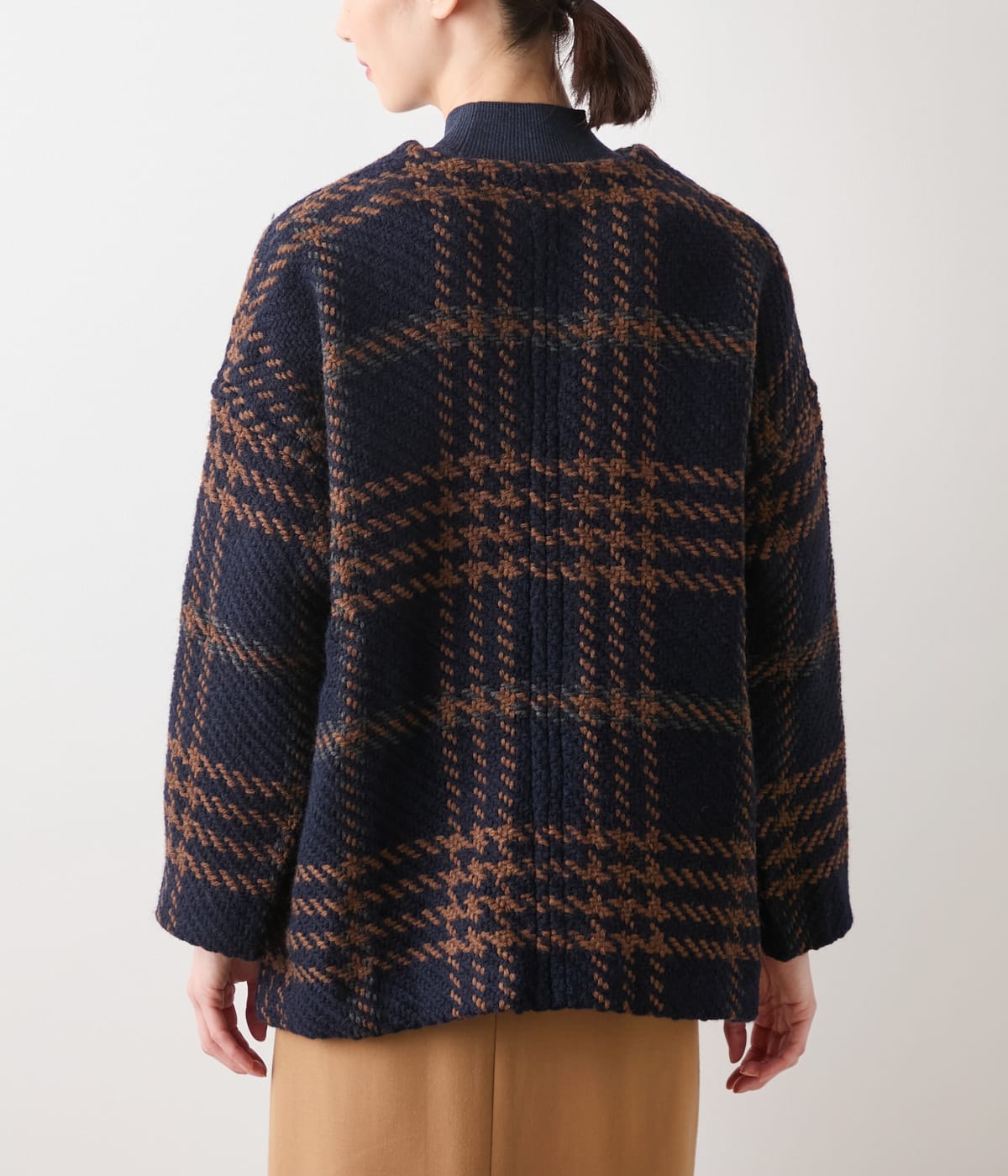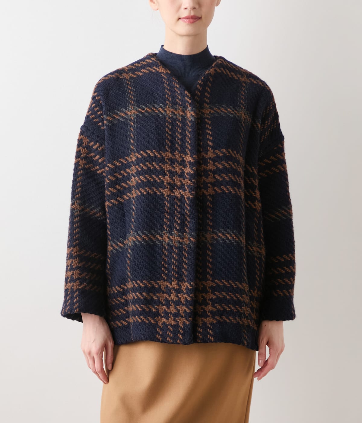大柄のチェックを活かしたリラックスシルエットのノーカラーデザイン。ボタンを留めても開けてもすっきりと見えるフロントは、インナーを選ばず着こなしやすいバランスに仕上がっています。気になる腰回りを防寒してカバーできる、大人に嬉しい着丈もポイント。