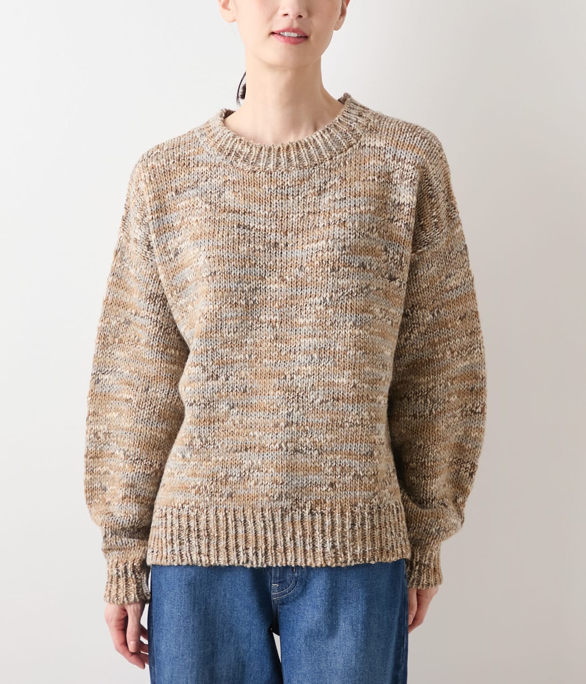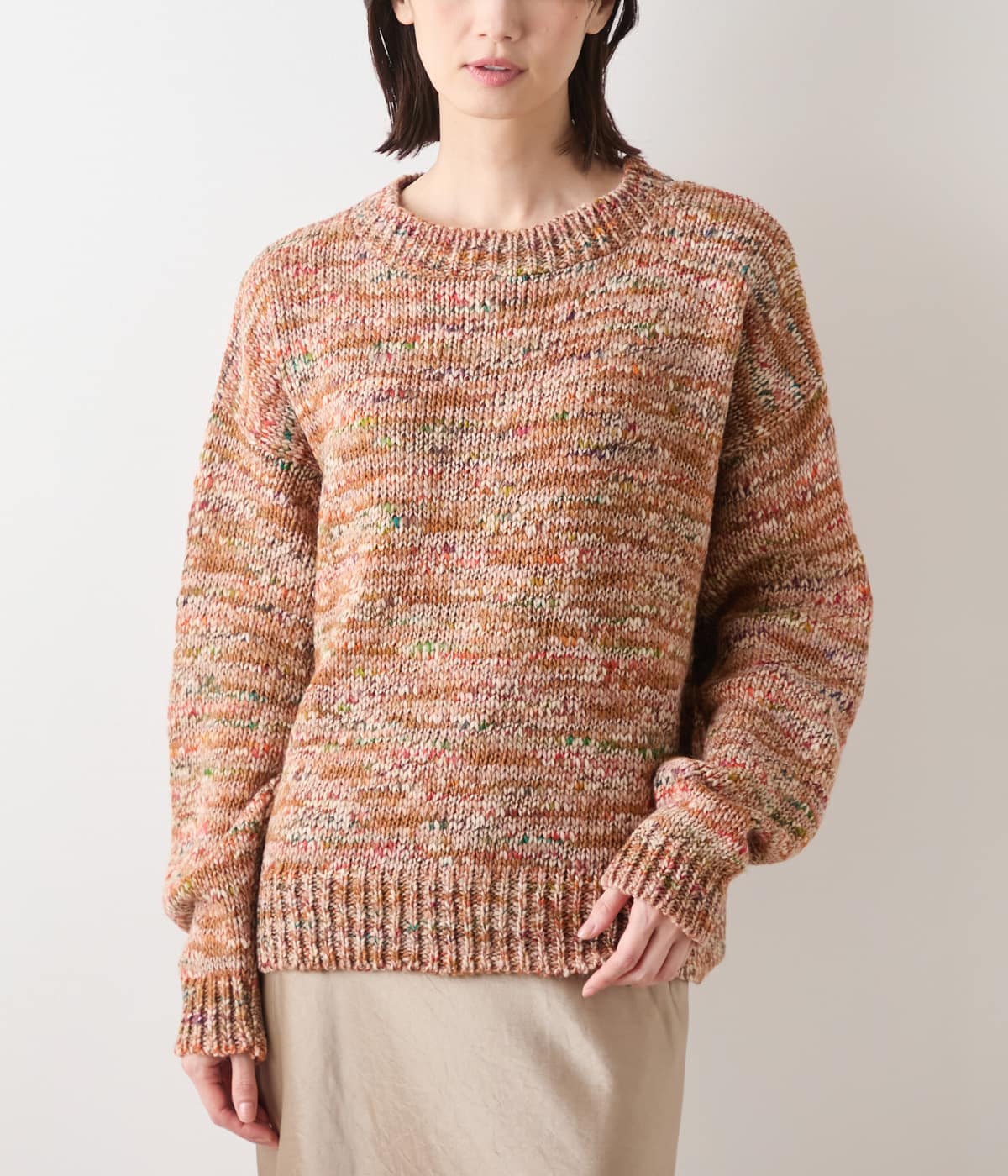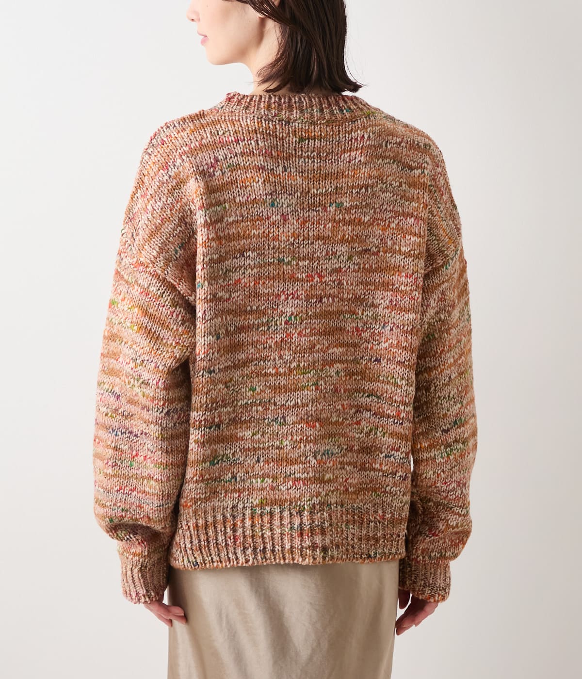 程よくゆとりのあるシルエットで、リラックス感と女性らしさを兼ね備えたシルエット。リブ仕様の襟元・袖口・裾が全体を引き締め、ラフになりすぎない印象です。多色の糸をミックスした編み地が、シンプルな着こなしにも奥行きを与えてくれます。