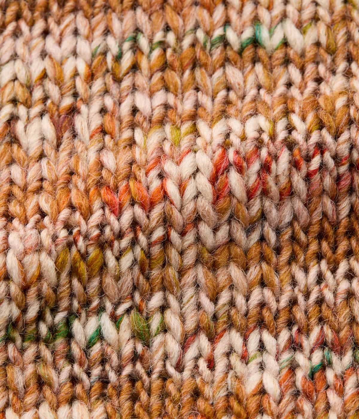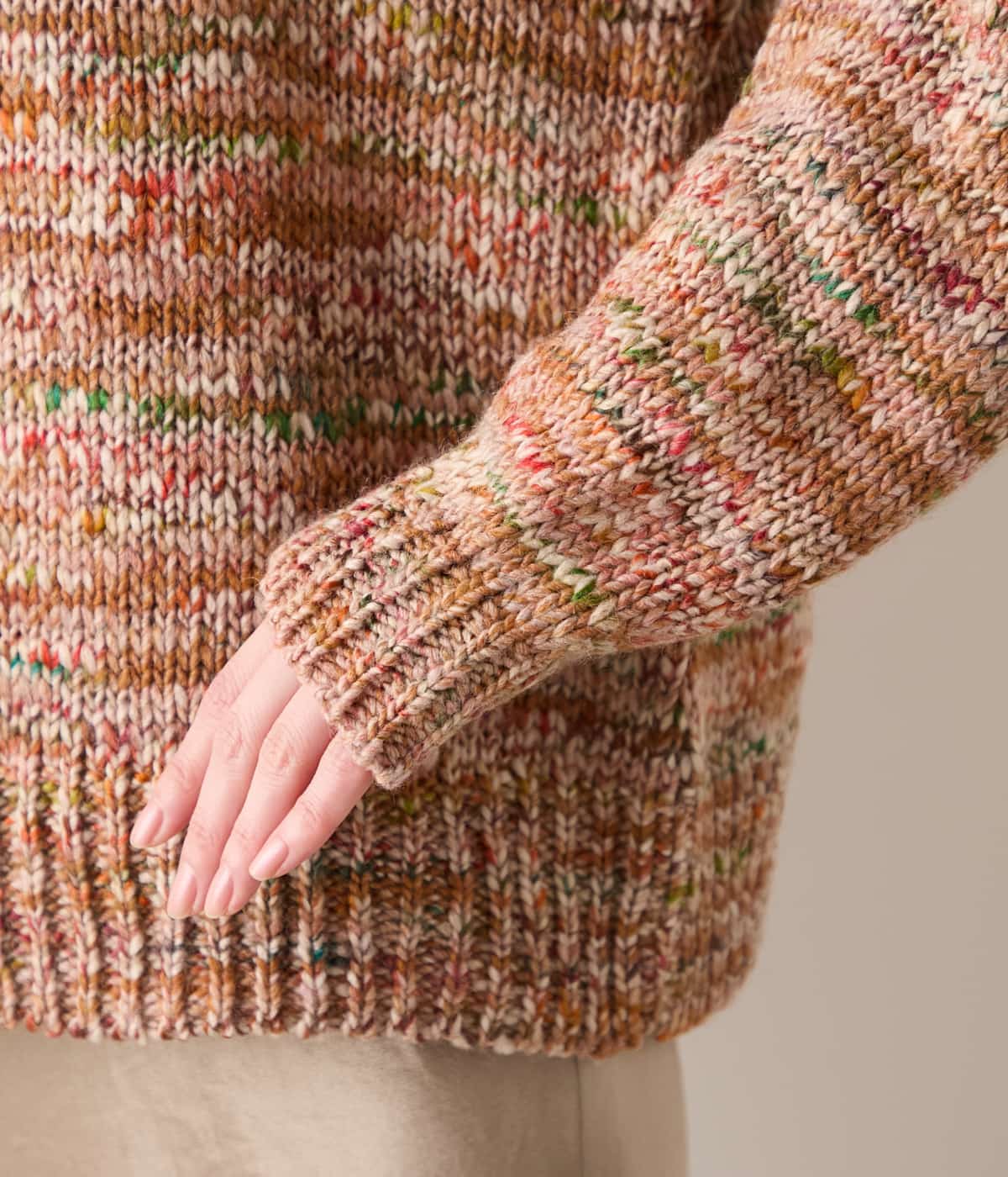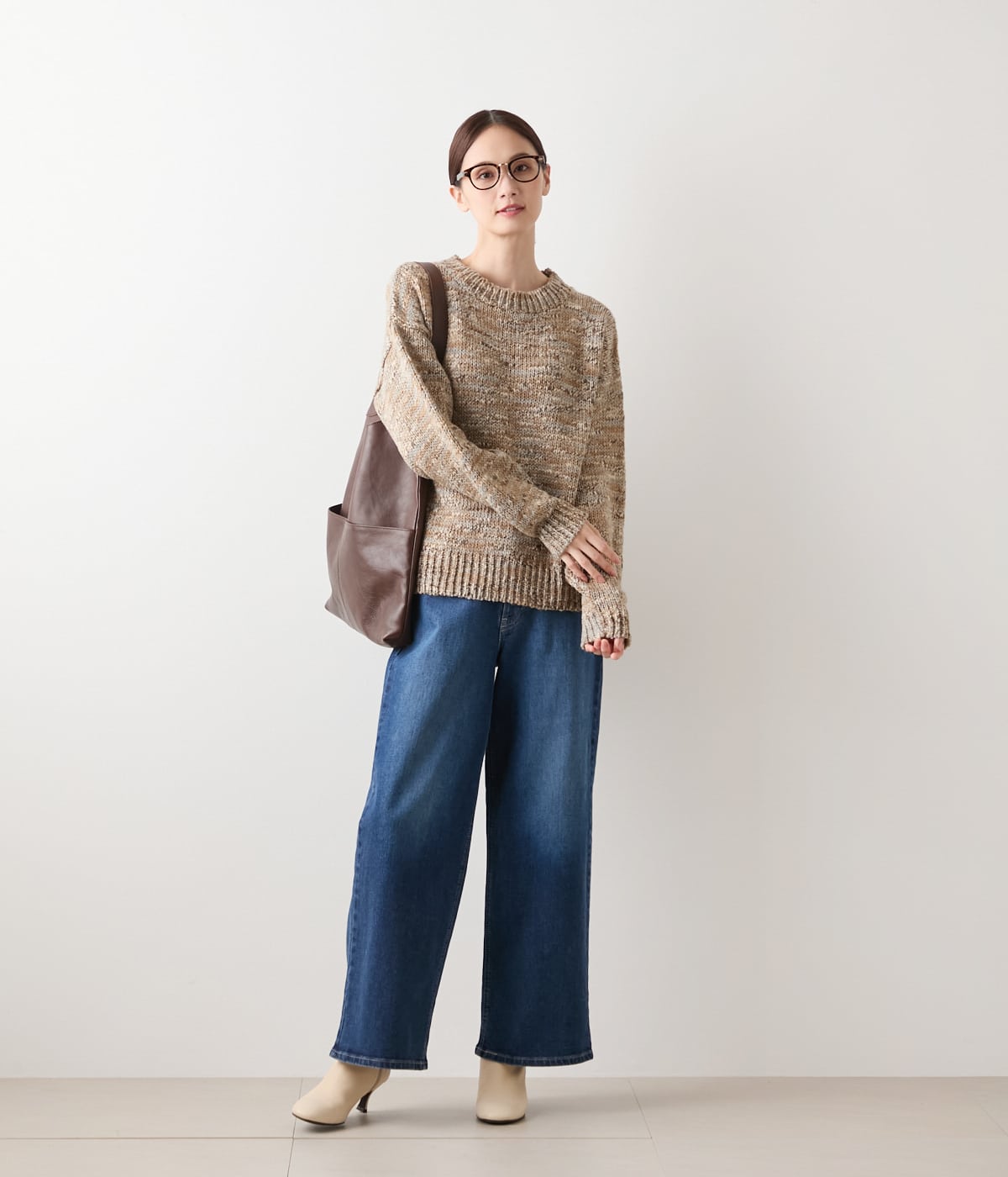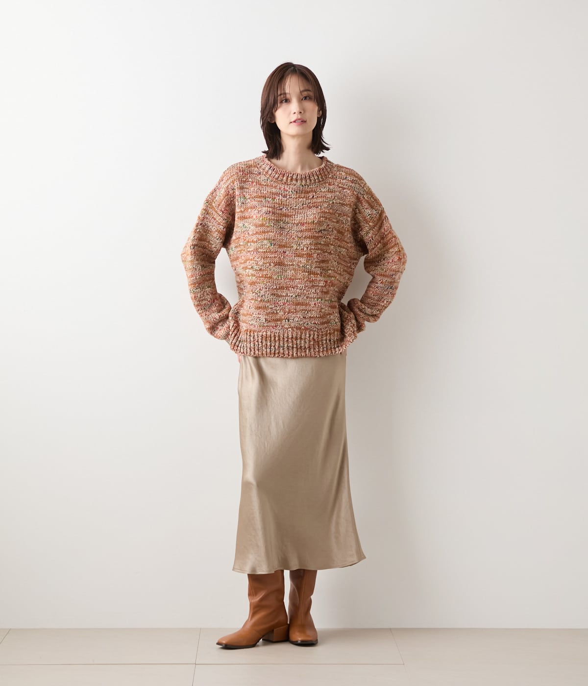 程よくゆとりのあるシルエットで、リラックス感と女性らしさを兼ね備えたシルエット。リブ仕様の襟元・袖口・裾が全体を引き締め、ラフになりすぎない印象です。多色の糸をミックスした編み地が、シンプルな着こなしにも奥行きを与えてくれます。