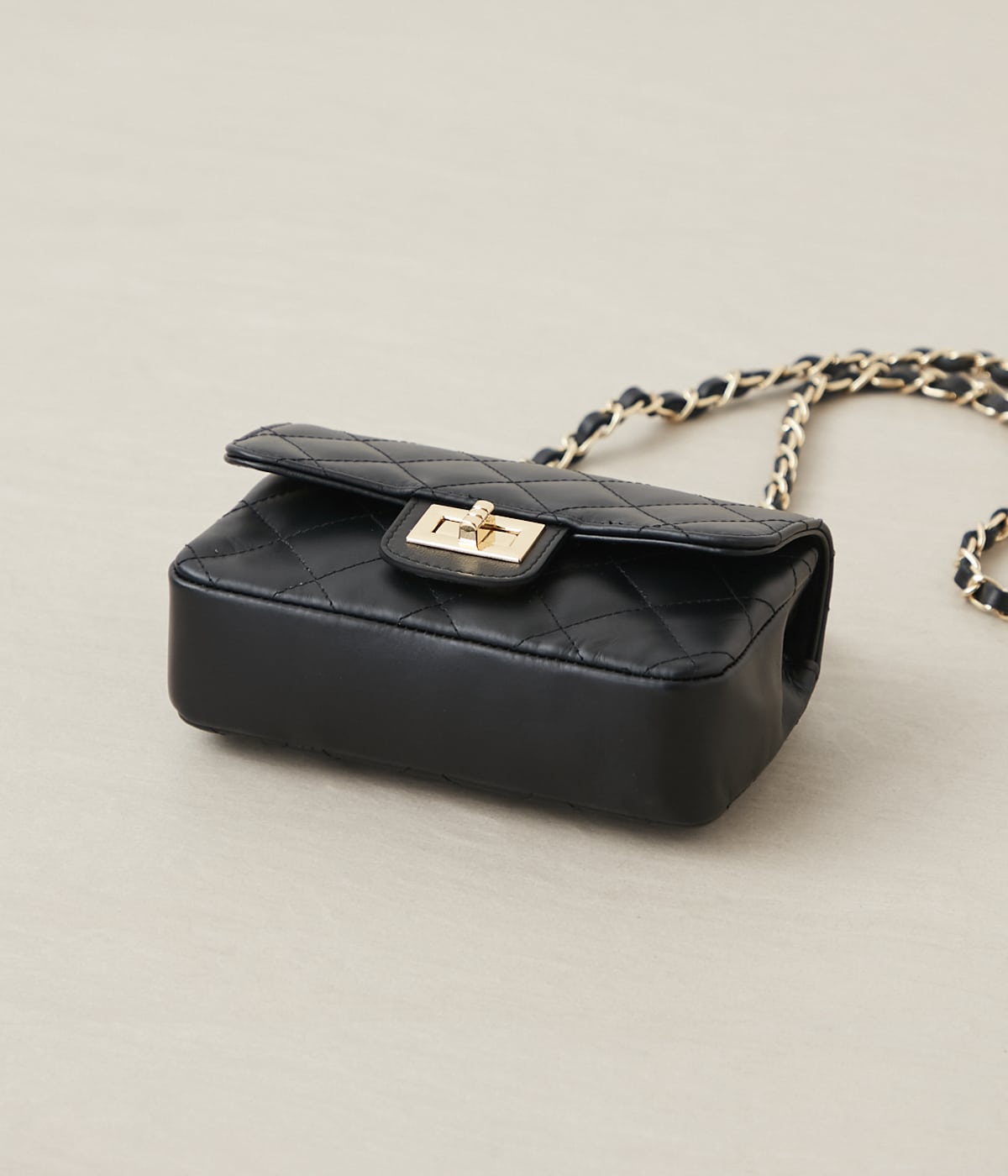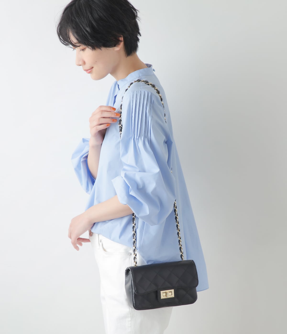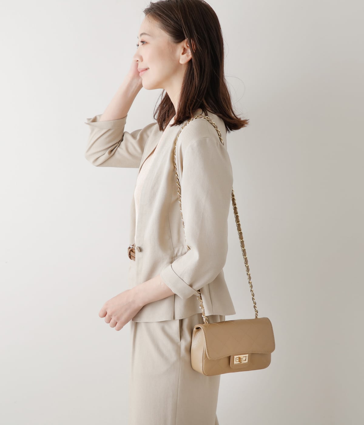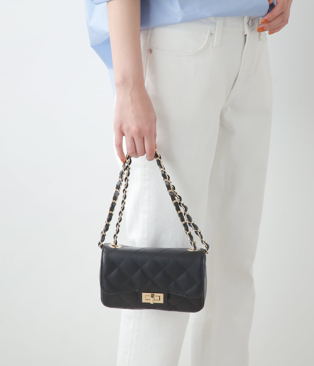 キルティング加工とゴールドのチェーンがお洒落な雰囲気を増してくれるアイテム。コンパクトなサイズ感ですがマチが広く、ミニウォレットやスマートフォン、ハンカチなど最低限の荷物が収納可能。肩掛けのほか、ハンドルを2重にして手持ちスタイルでも活躍します。内側にファスナーポケットあり。
