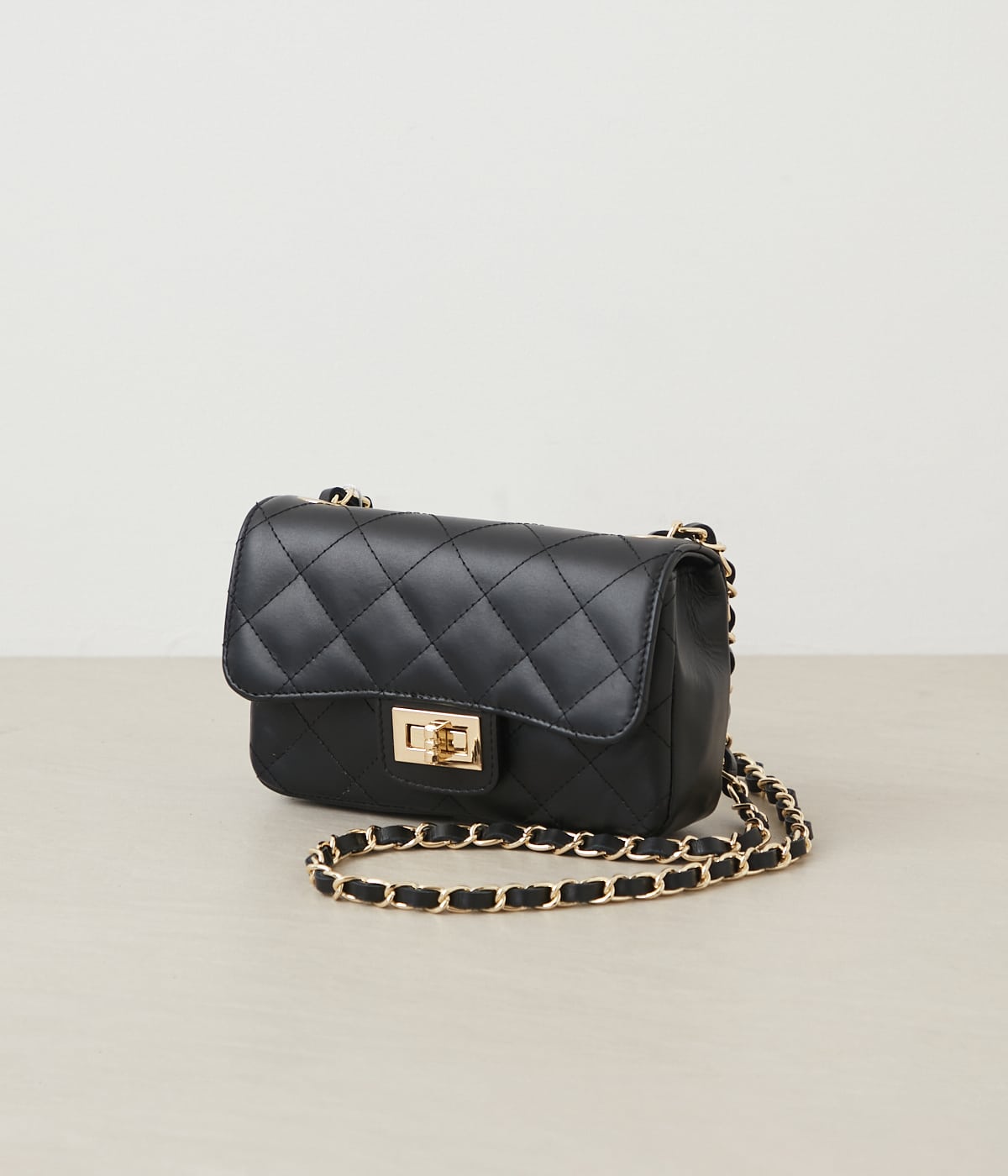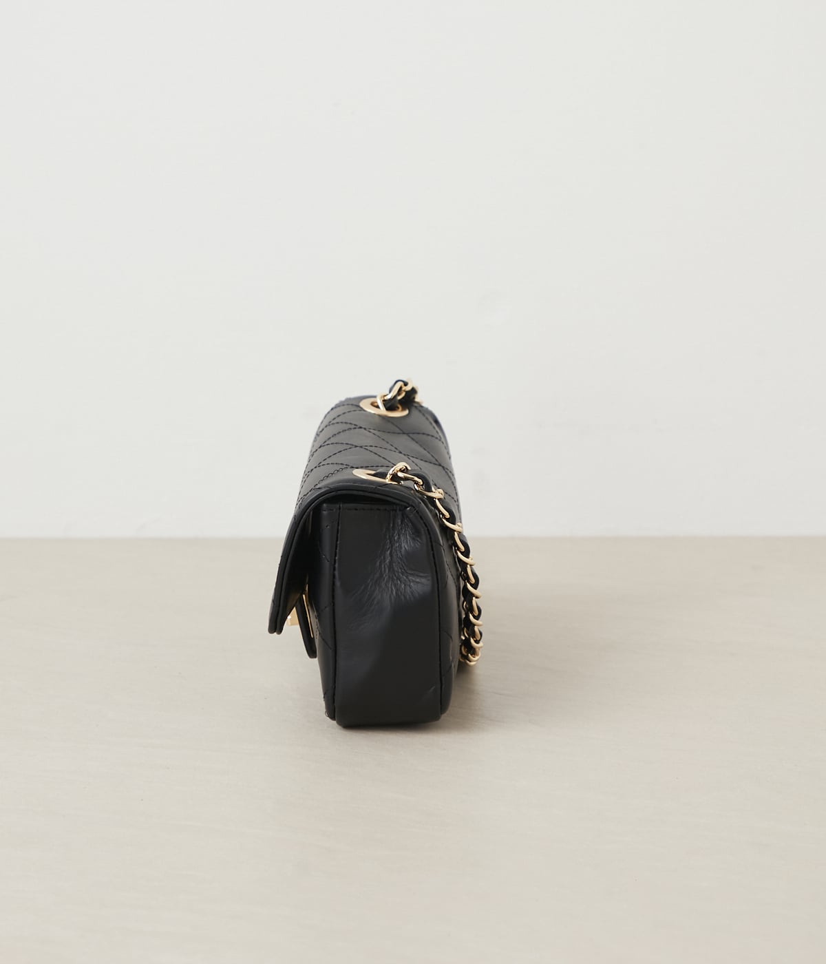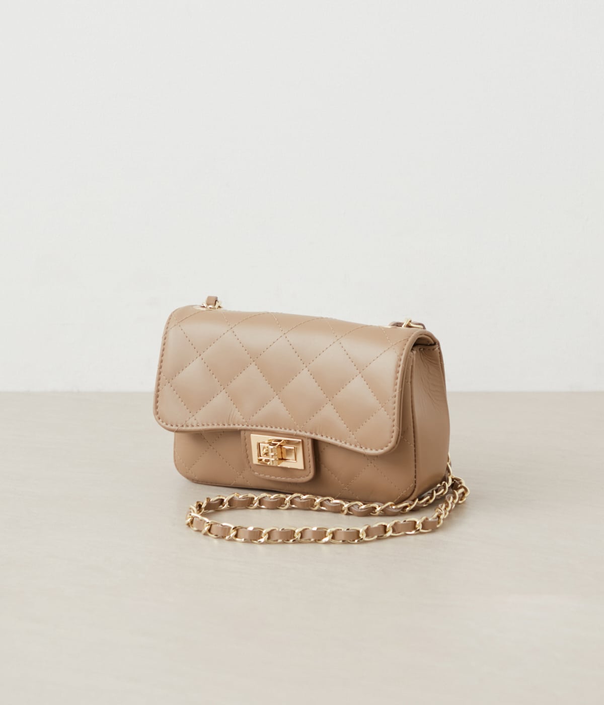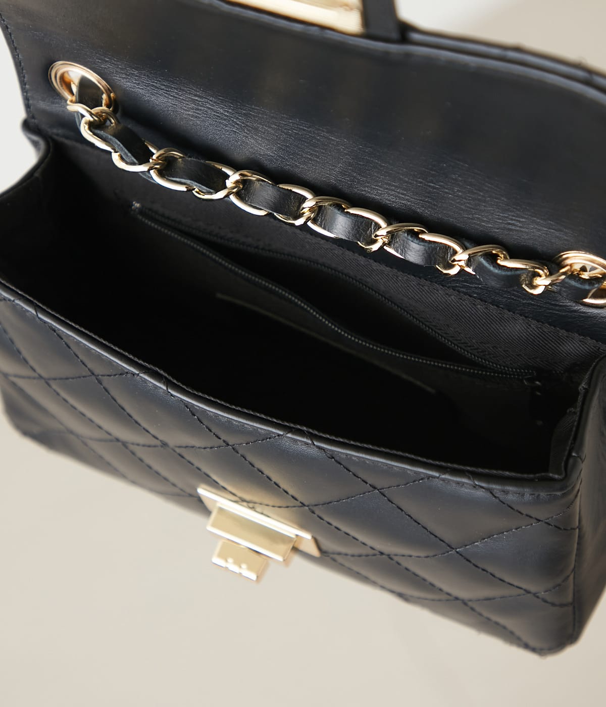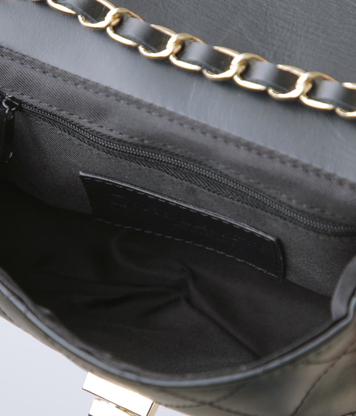 キルティング加工とゴールドのチェーンがお洒落な雰囲気を増してくれるアイテム。コンパクトなサイズ感ですがマチが広く、ミニウォレットやスマートフォン、ハンカチなど最低限の荷物が収納可能。肩掛けのほか、ハンドルを2重にして手持ちスタイルでも活躍します。内側にファスナーポケットあり。