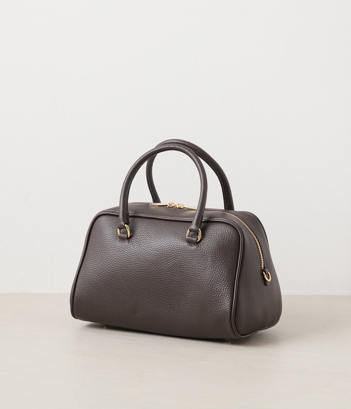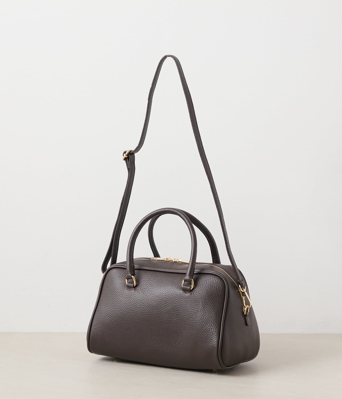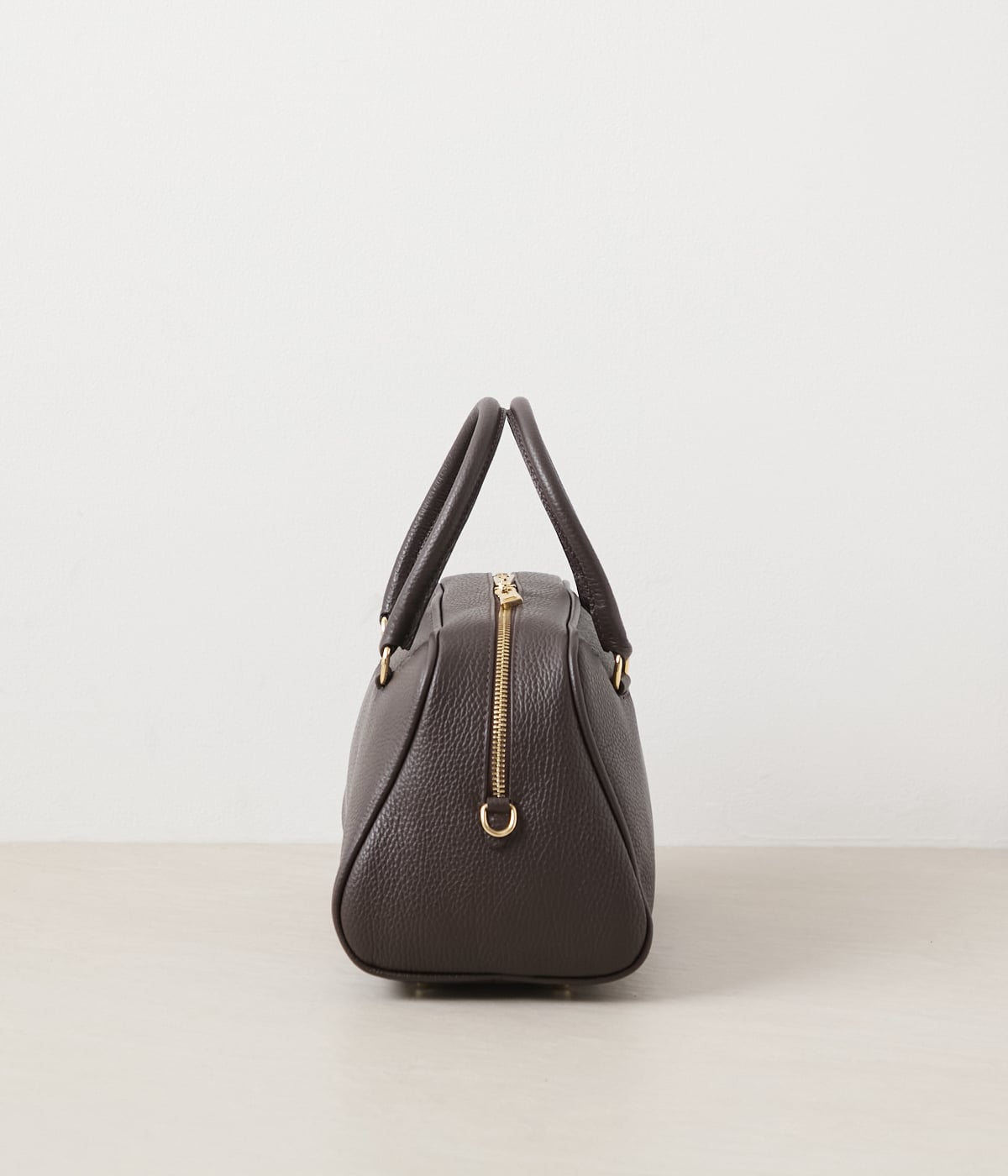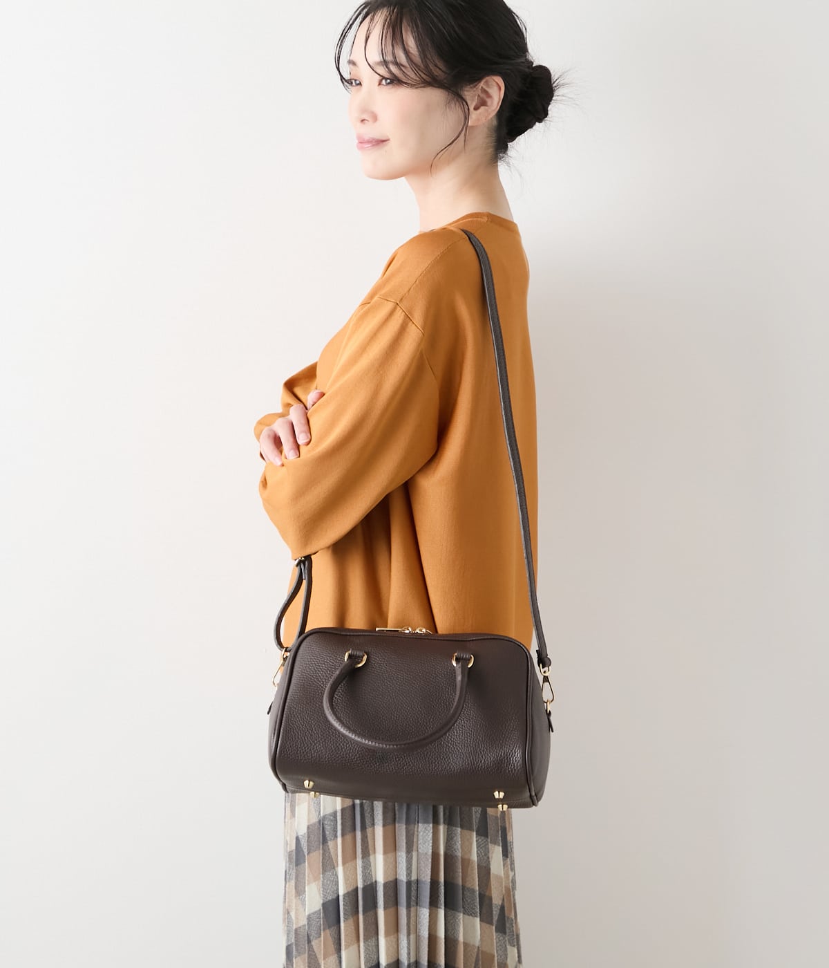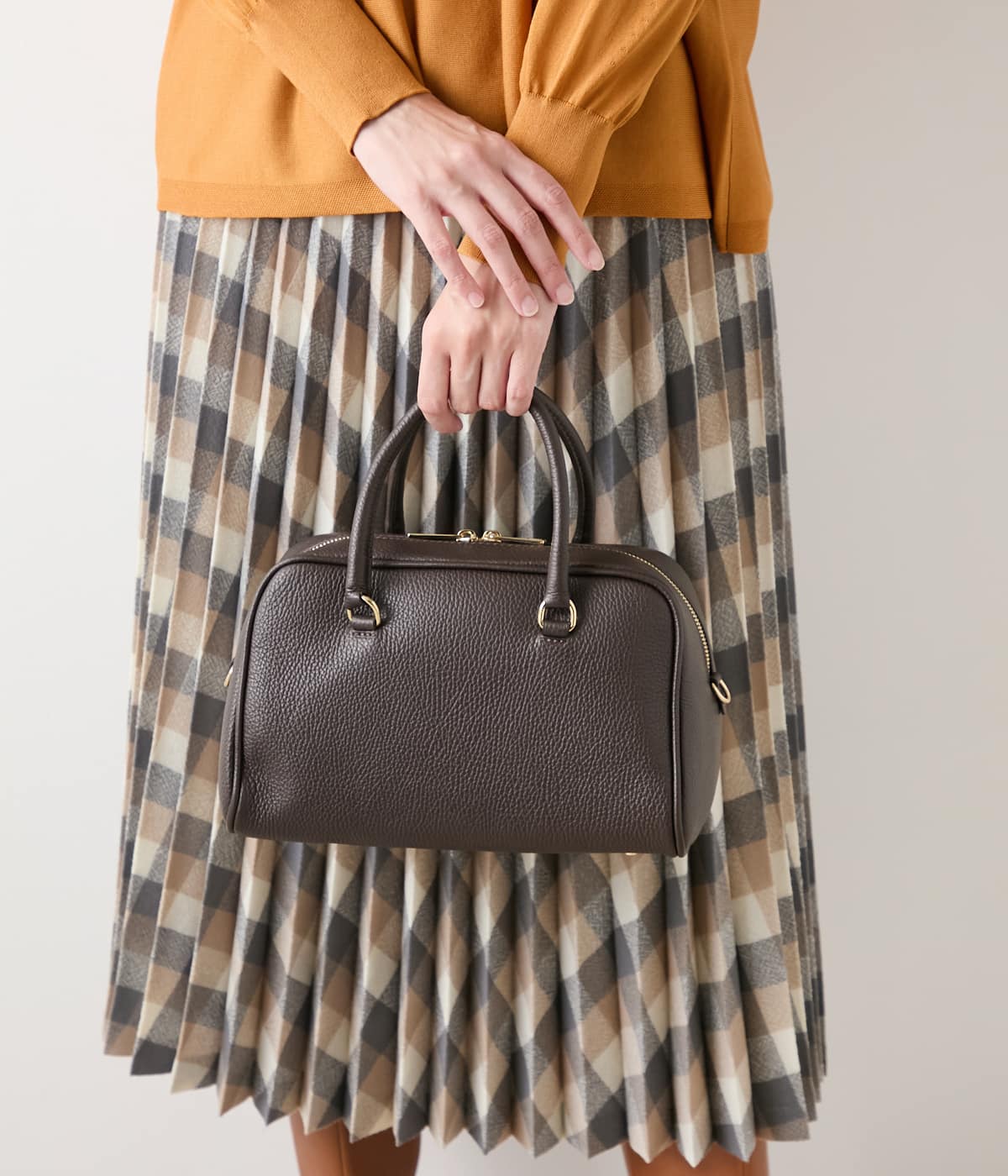 丸みを帯びたフォルムが愛らしく、シンプルながらも洗練された印象に導くボストンデザイン。小ぶりなサイズながらマチを広く取っており、長財布やポーチなど必要な荷物をしっかり収納できます。ショルダーストラップを付ければ肩掛け・斜め掛けも可能で、シーンに合わせてアレンジできる実用的なアイテム。内側にポケットあり。底鋲付き。