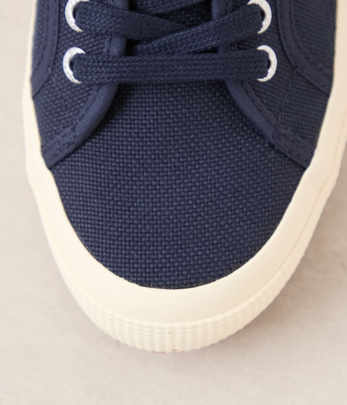 アッパーには通気性の良いコットンキャンバスを使用し、季節を問わず快適な履き心地を実現。ソールはグリップ性のあるラバー素材で、歩行時の安定感をサポートします。