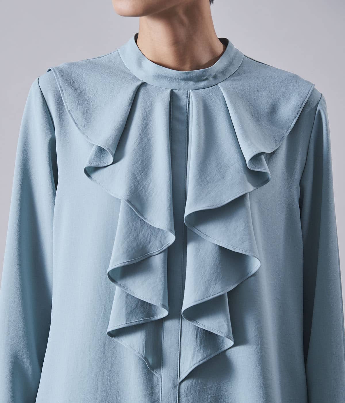 優しく揺れるドレープデザインがポイントのスタンドカラーブラウス。1枚着としての存在感はもちろん、ジャケットスタイルも華やかに演出するアイテムです。エレガントなデザイン性で、セレモニーシーンの着用にもおすすめ。カラーはシックなグレージュと、上品なサックスの2色展開。