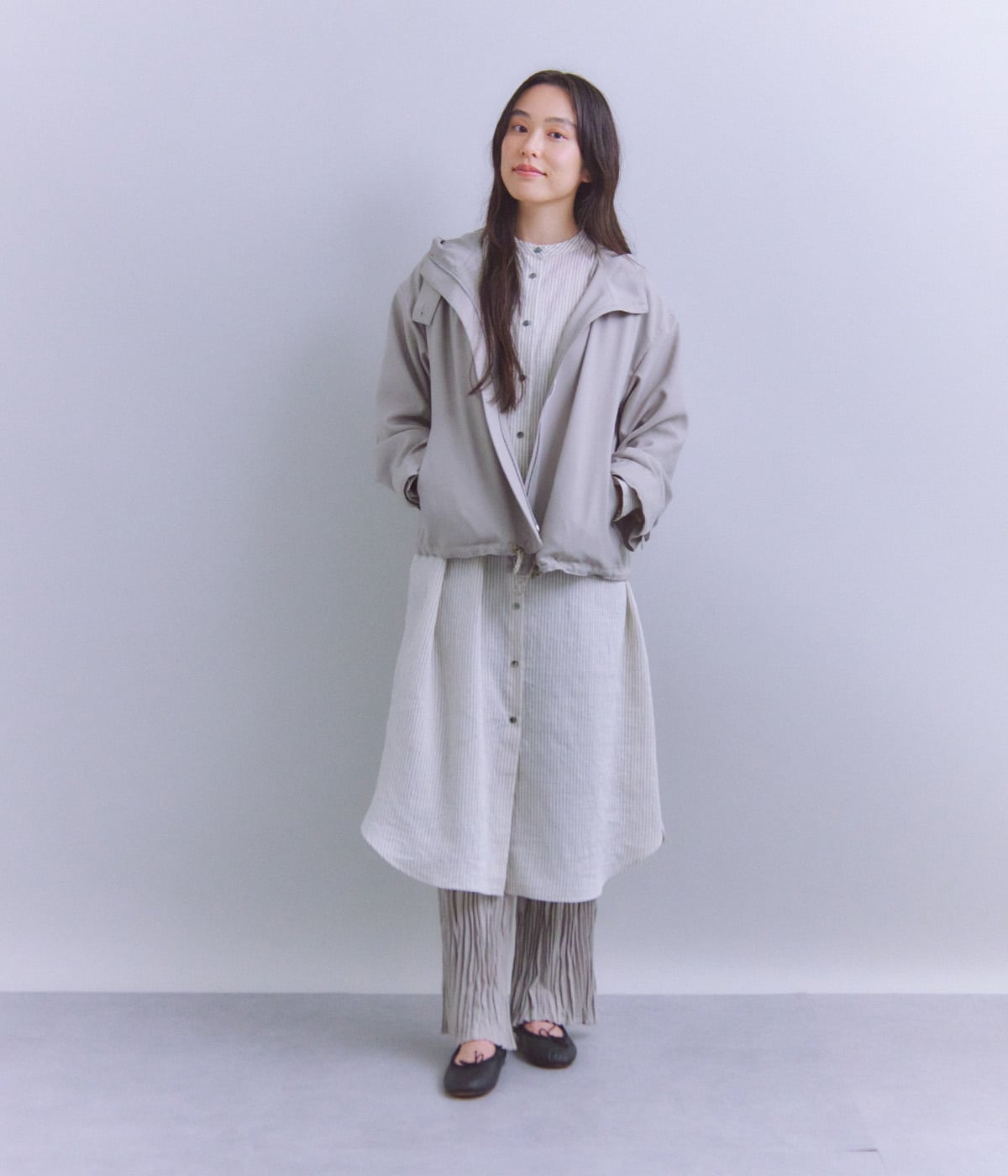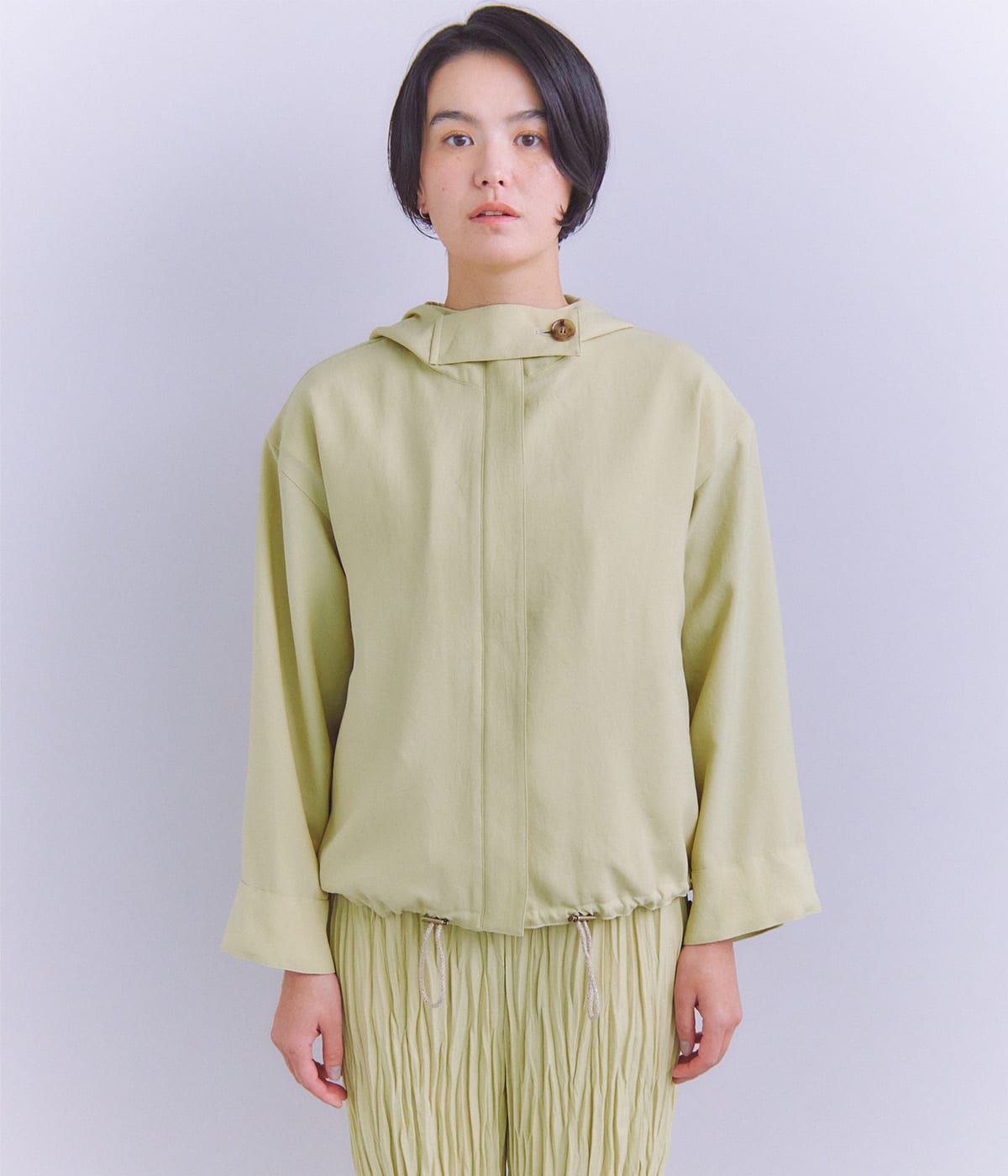 フード付きのジップアップブルゾン。袖口を絞れるよう内側にゴムを入れており、2つの釦で調節していただけます。また、袖口には飾りステッチを施し、さりげないアクセントに。ドローコードで裾を絞り、ショート丈のようにアレンジも可能です。アウターとしてはもちろん、パーカ感覚でコートインにもおすすめです。ポケットあり。裏地なし。